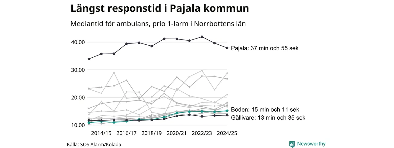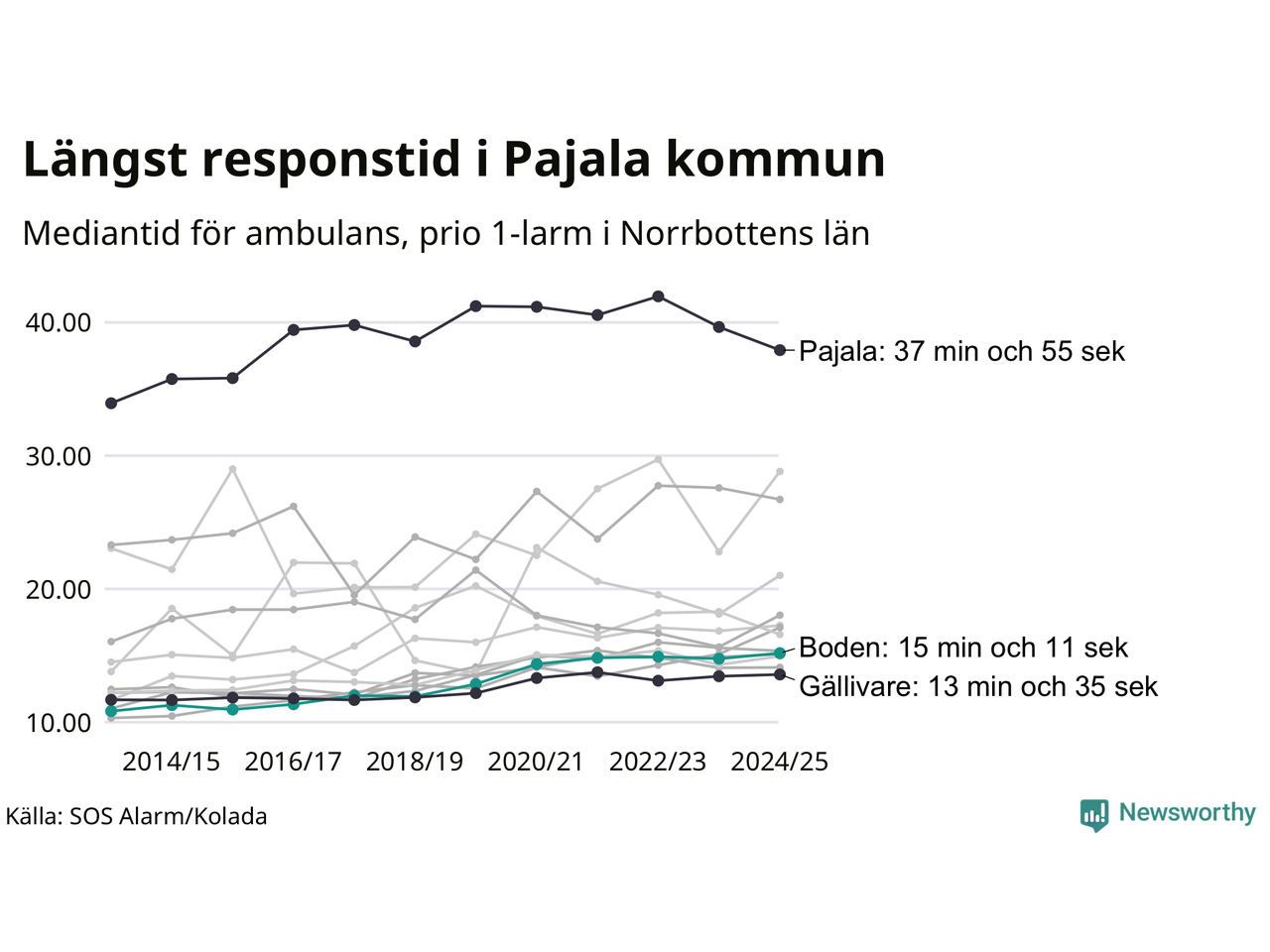 Boden tillhör inte de kommuner i Region Norrbotten som får vänta längst på ambulans – men inte heller de som får snabbast hjälp. Längst är väntetiden i Pajala kommun, som också är den kommun i hela landet som får vänta längst på ambulans: 37 minuter och 55 sekunder. Snabbast var ambulansen framme i Gällivare, där det tog 13 minuter och 35 sekunder från larmsamtalet 2024/2025.
