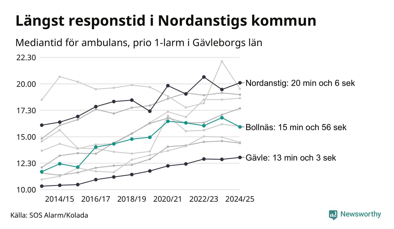 Det tar 15 minuter och 56 sekunder från att 112-samtalet når larmcentralen till att ambulansen är på plats i Bollnäs kommun. Det visar de senaste siffrorna från SOS Alarm. Tiden är en mediantid för alla prio 1-larm mellan 1 juni 2024 och 31 maj 2025 och ett nyckeltal som redovisas varje år.