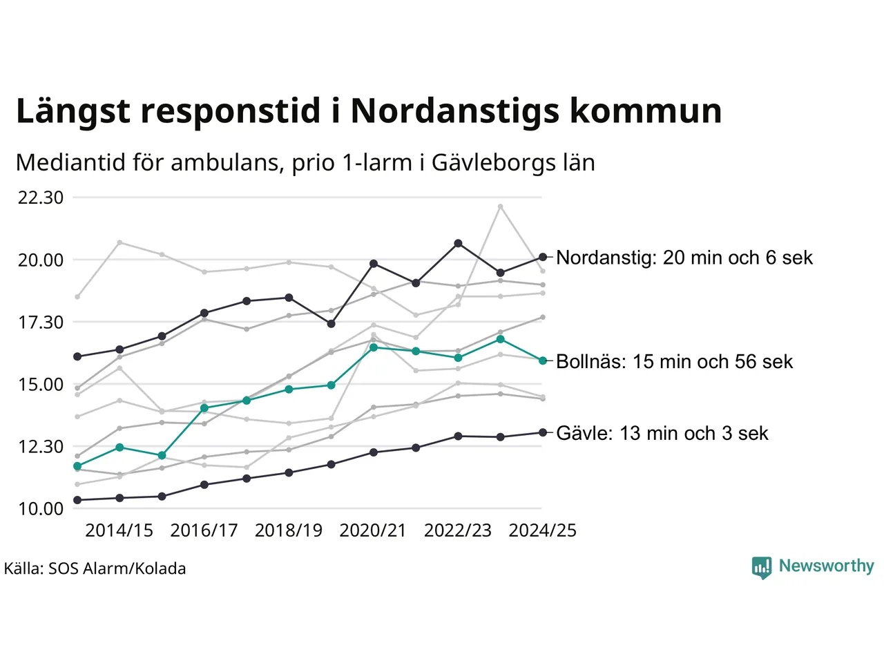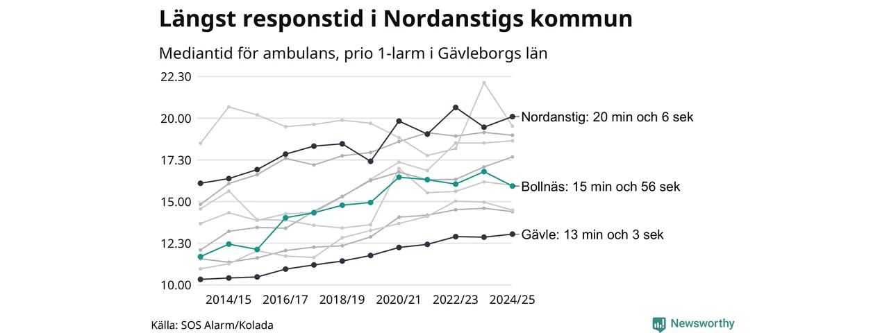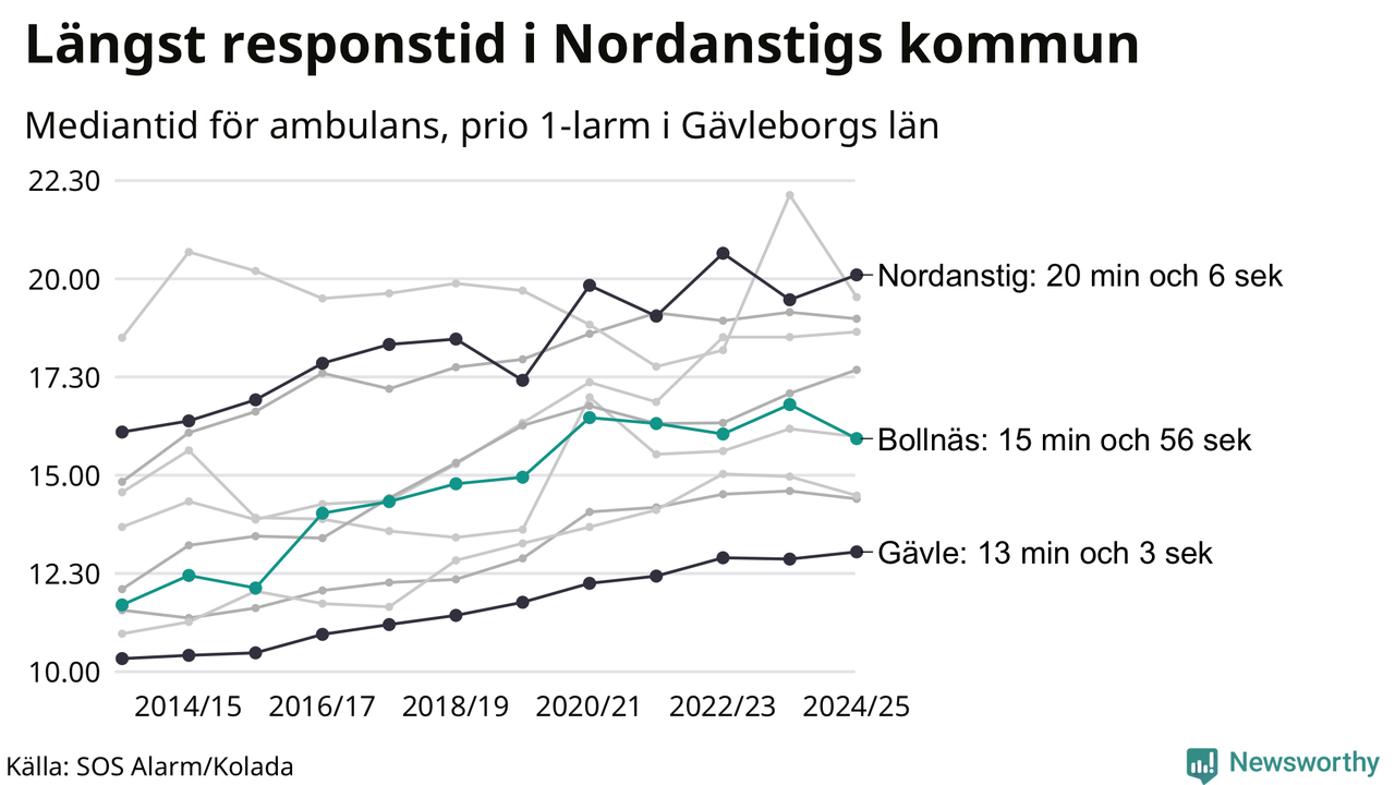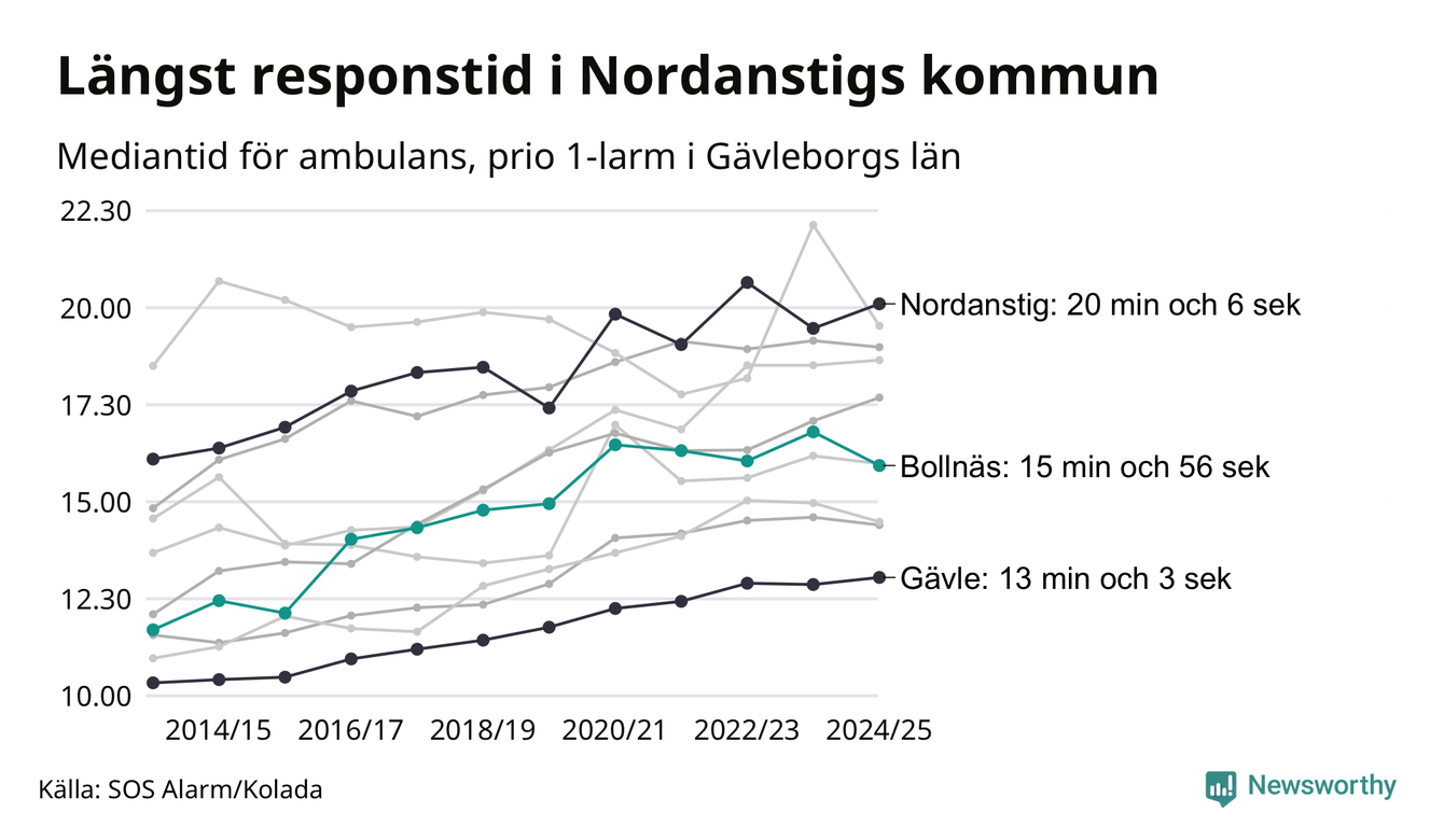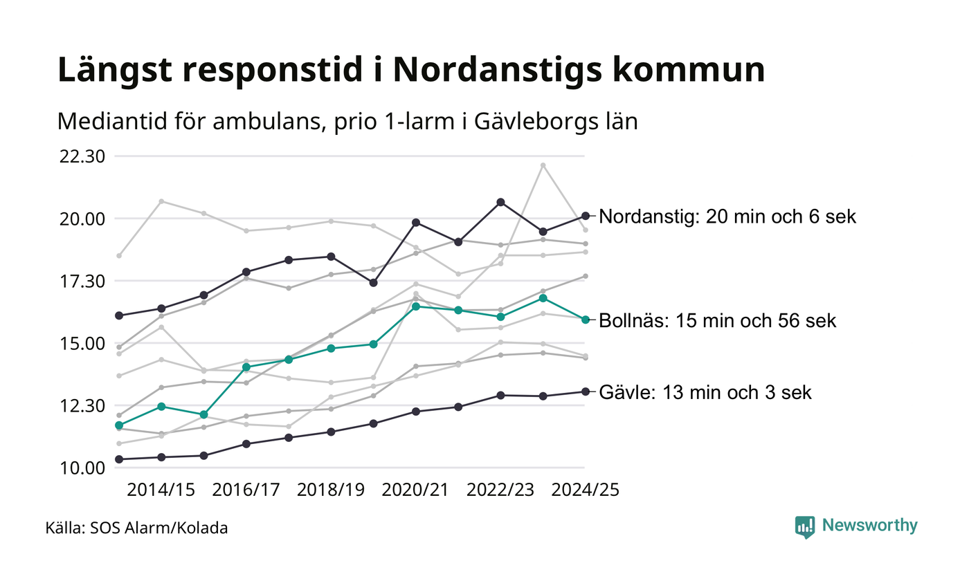 Även om väntan i Nordanstig är lång för att vara Region Gävleborg krävs ytterligare 5 minuter för att ta sig in på topp tiolistan över kommuerna i landet med längst väntetid. Längst är väntan på ambulans i Pajala kommun, 37 minuter och 55 sekunder. Kommunerna med längst responstid finns i Norrlands inland eller i glesbygd.