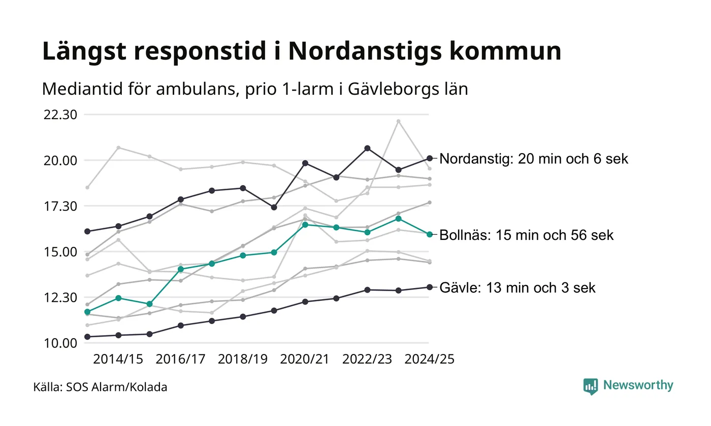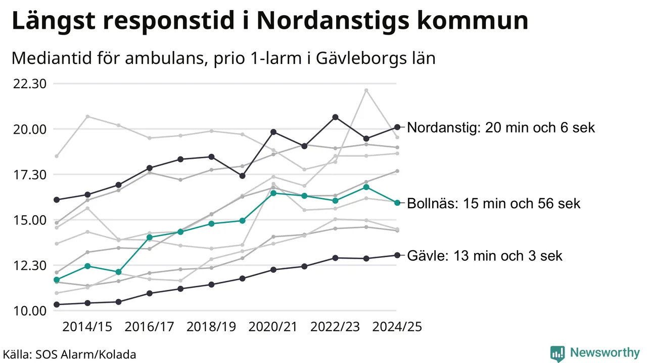 Bollnäs tillhör inte de kommuner i Region Gävleborg som får vänta längst på ambulans – men inte heller de som får snabbast hjälp. Längst är väntetiden i Nordanstigs kommun: 20 minuter och 6 sekunder. Snabbast var ambulansen framme i Gävle, där det tog 13 minuter och 3 sekunder från larmsamtalet 2024/2025.
