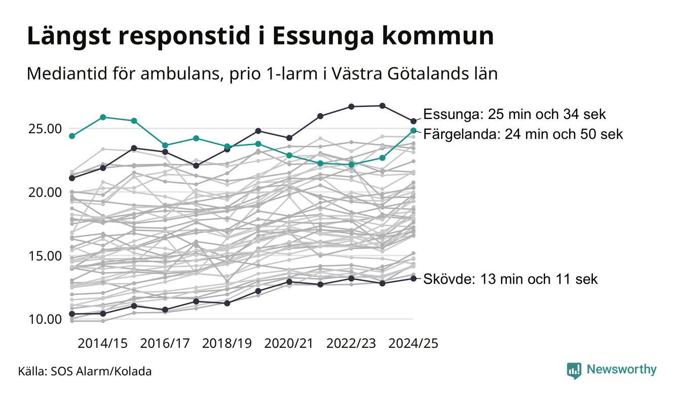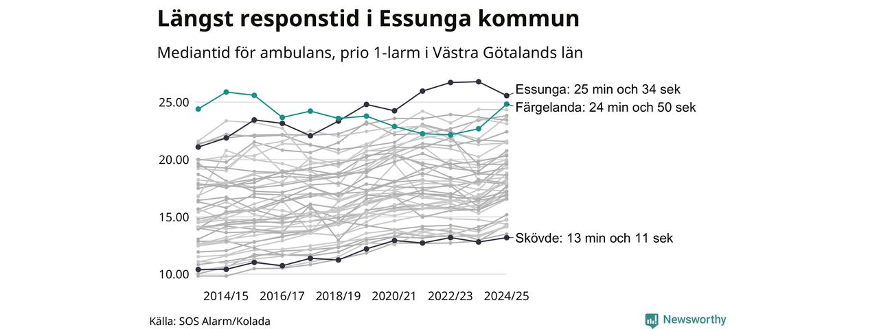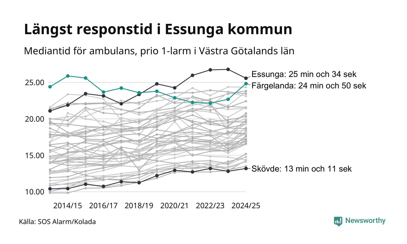 Det tar 24 minuter och 50 sekunder från att 112-samtalet når larmcentralen till att ambulansen är på plats i Färgelanda kommun. Det visar de senaste siffrorna från SOS Alarm. Tiden är en mediantid för alla prio 1-larm mellan 1 juni 2024 och 31 maj 2025 och ett nyckeltal som redovisas varje år.
