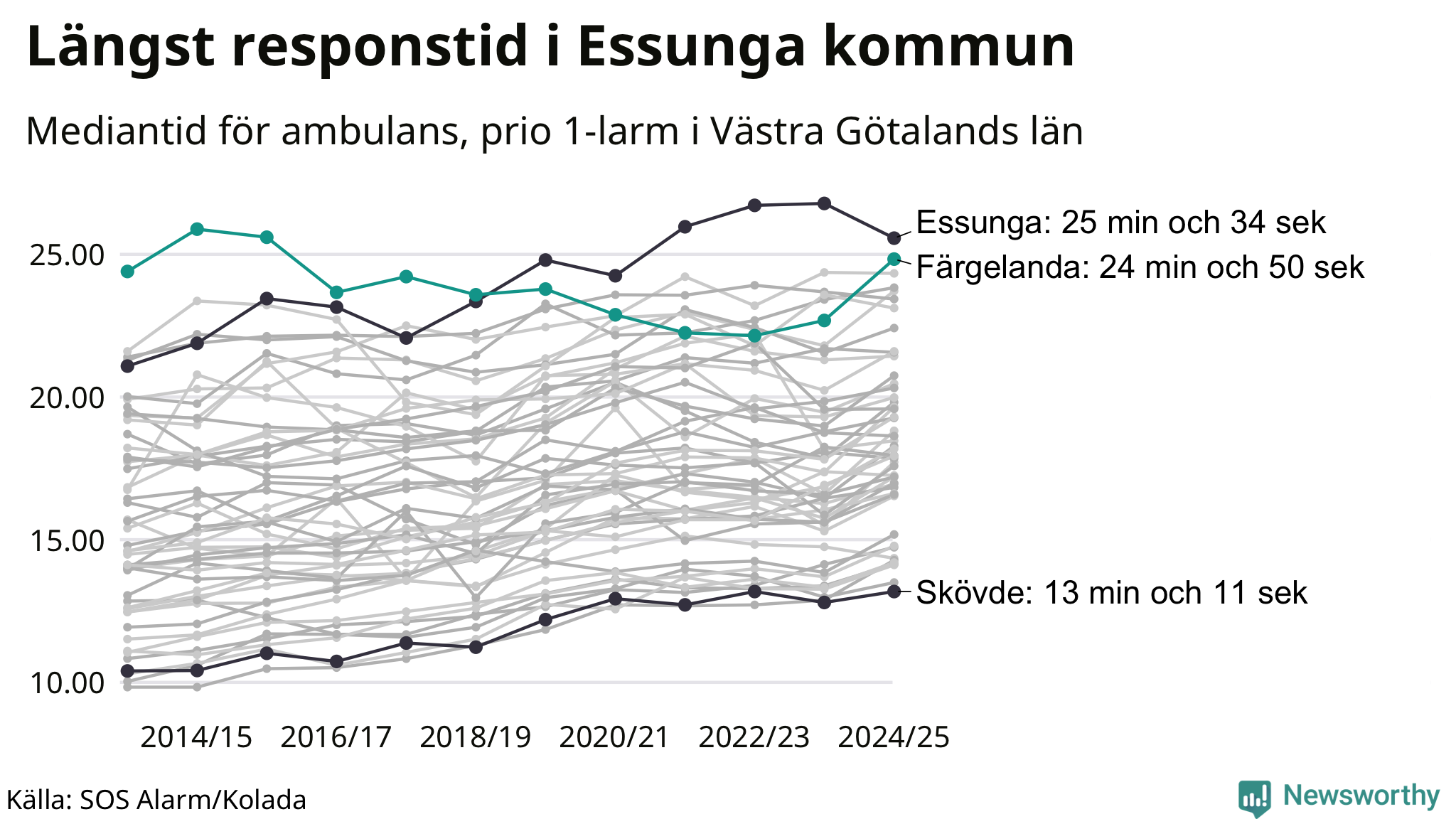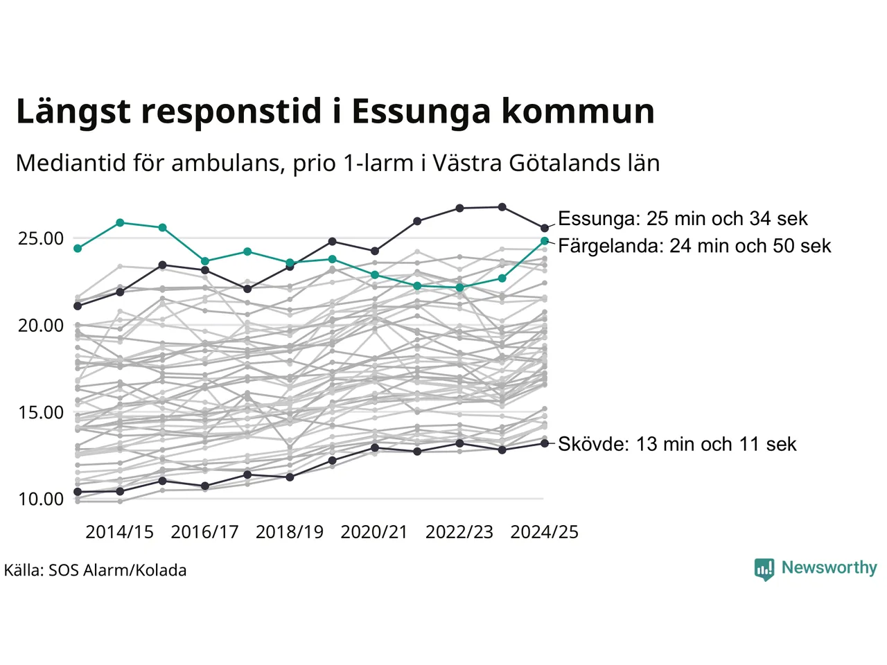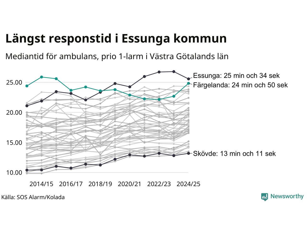Det tar 24 minuter och 50 sekunder från att 112-samtalet når larmcentralen till att ambulansen är på plats i Färgelanda kommun. Det visar de senaste siffrorna från SOS Alarm. Tiden är en mediantid för alla prio 1-larm mellan 1 juni 2024 och 31 maj 2025 och ett nyckeltal som redovisas varje år.
