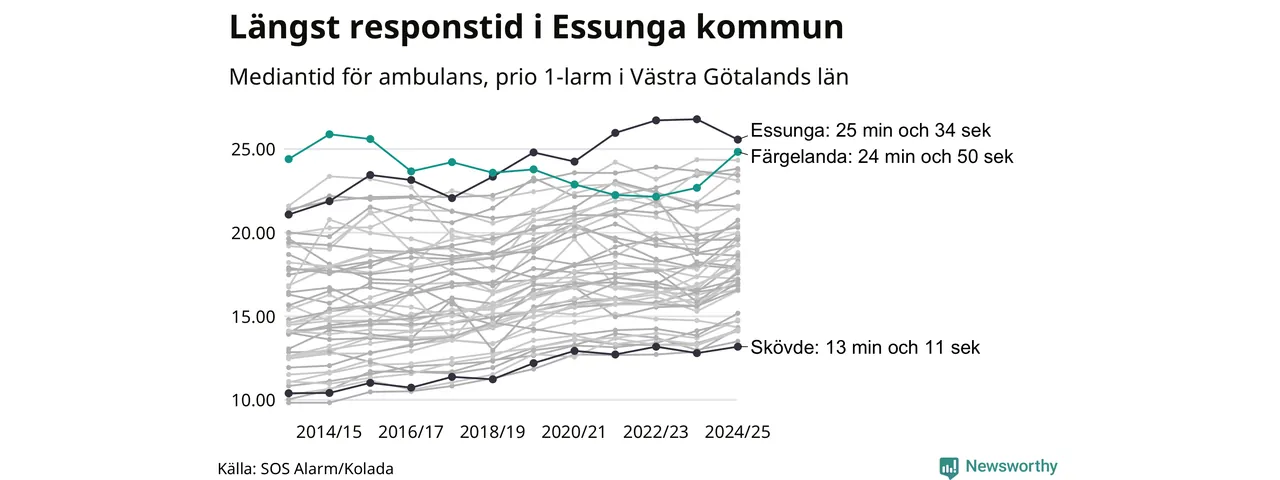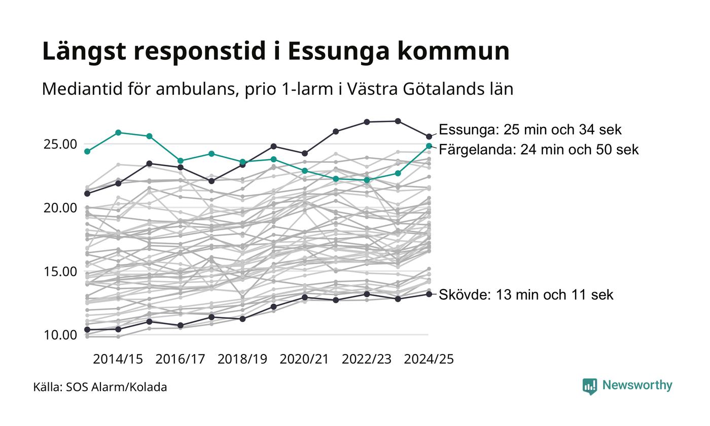 Essunga är alltså en av de kommuner som får vänta längst på ambulans i landet. Längst är väntan på ambulans i Pajala kommun, 37 minuter och 55 sekunder. Kommunerna med längst responstid finns i Norrlands inland eller i glesbygd.