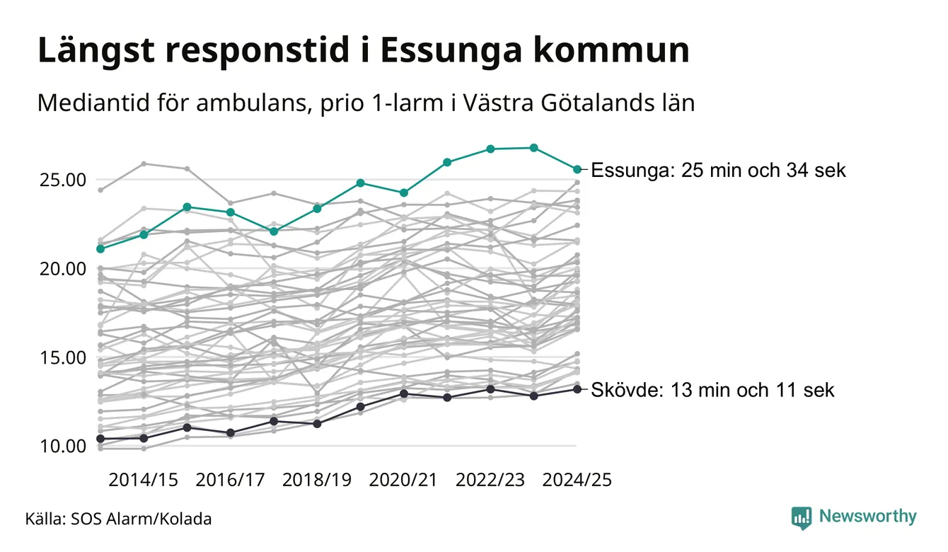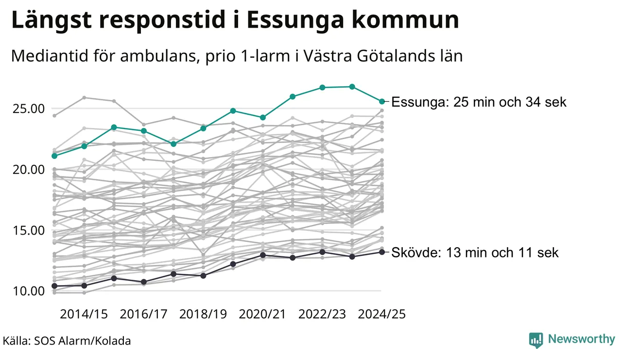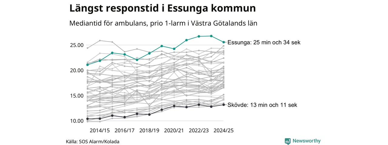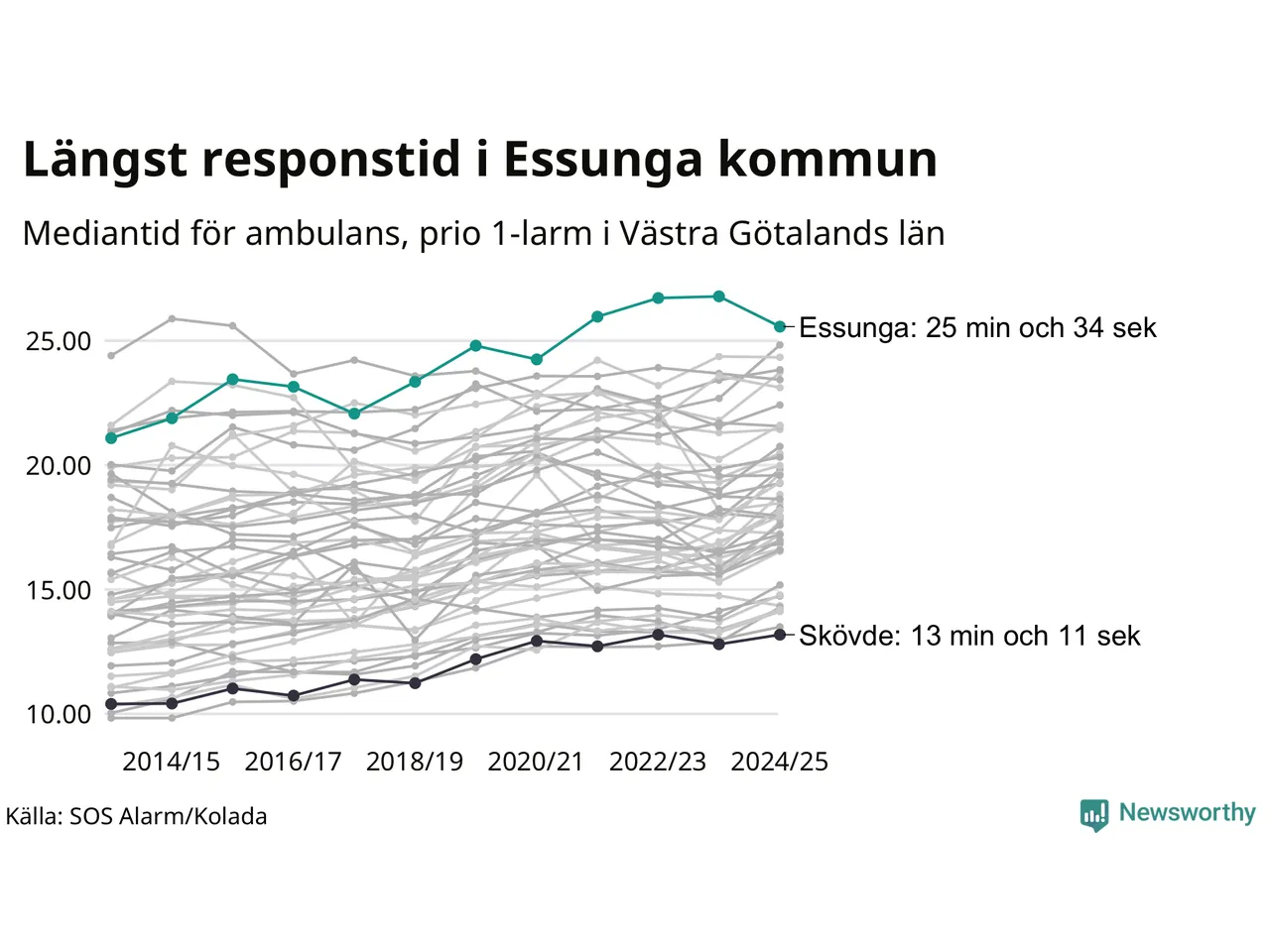 Det tar 25 minuter och 34 sekunder från att 112-samtalet når larmcentralen till att ambulansen är på plats i Essunga kommun. Det visar de senaste siffrorna från SOS Alarm. Tiden är en mediantid för alla prio 1-larm mellan 1 juni 2024 och 31 maj 2025 och ett nyckeltal som redovisas varje år.