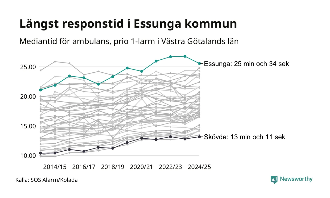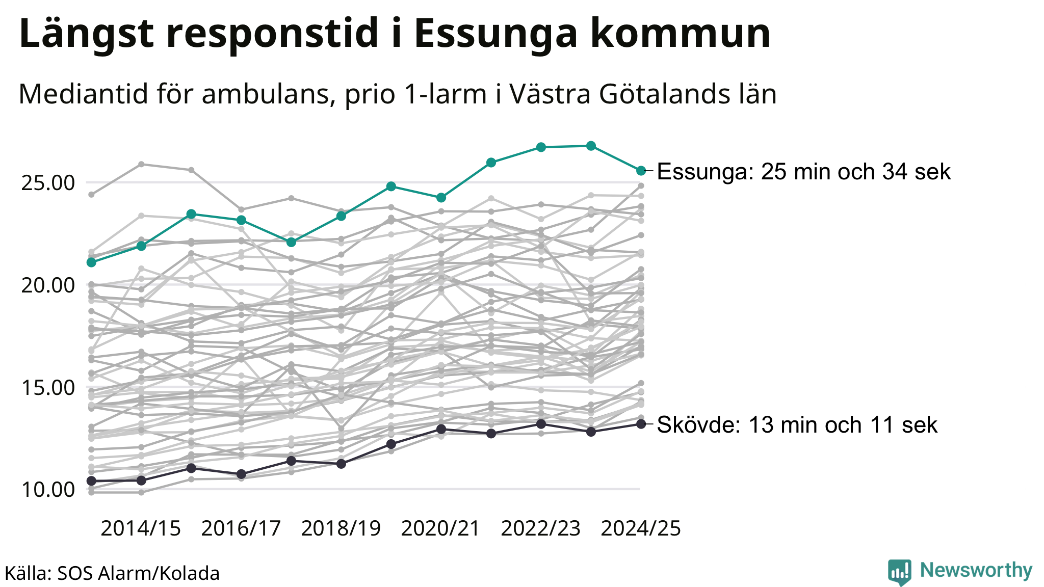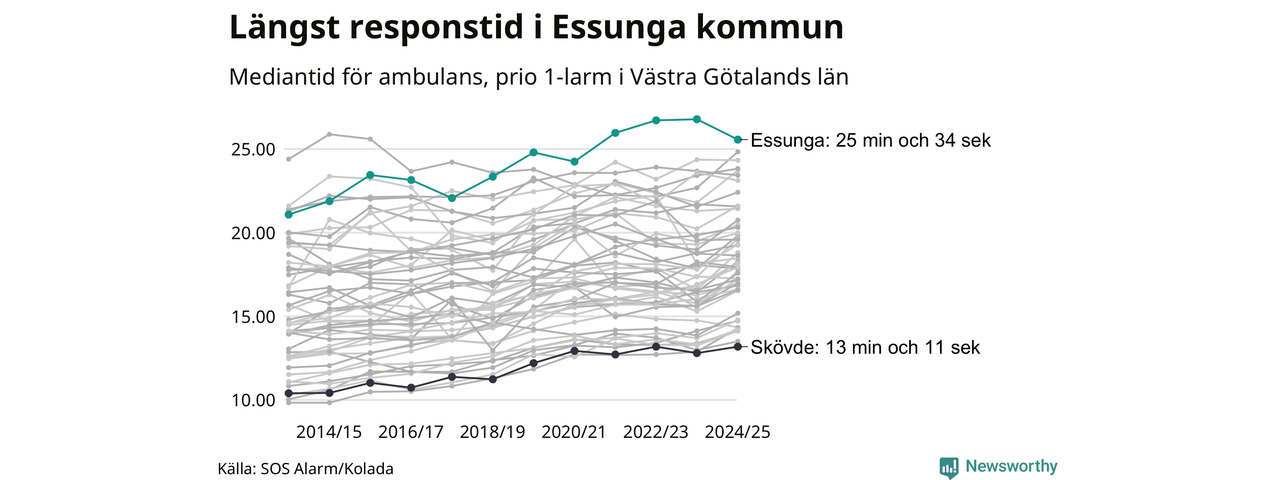 Det tar 25 minuter och 34 sekunder från att 112-samtalet når larmcentralen till att ambulansen är på plats i Essunga kommun. Det visar de senaste siffrorna från SOS Alarm. Tiden är en mediantid för alla prio 1-larm mellan 1 juni 2024 och 31 maj 2025 och ett nyckeltal som redovisas varje år.