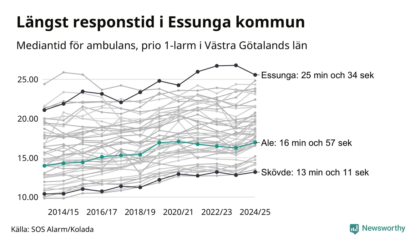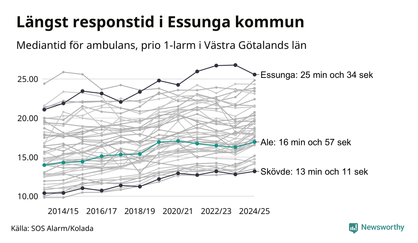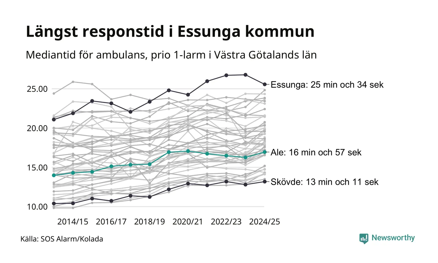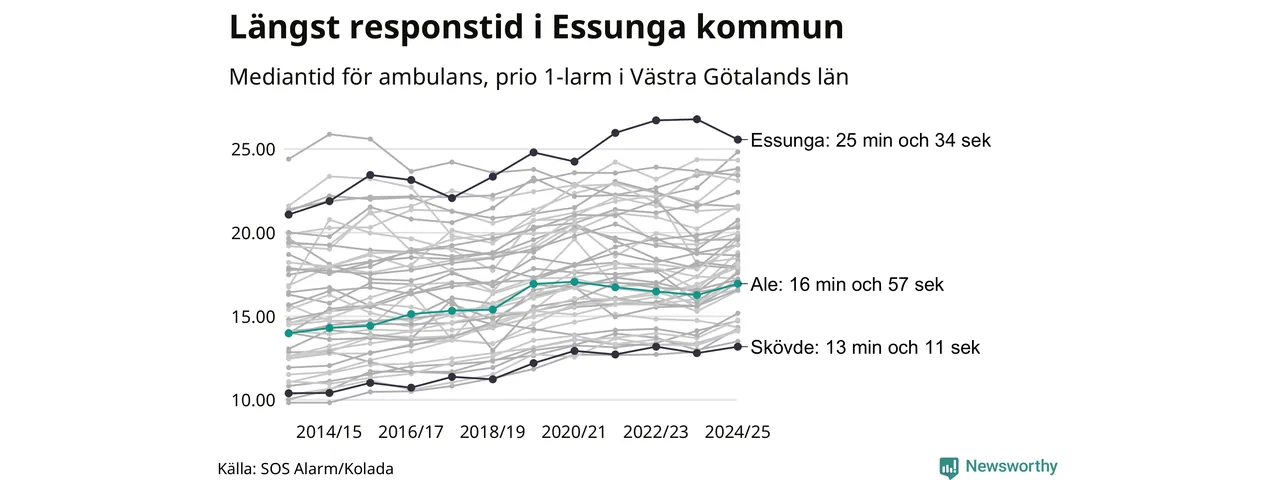 Ale tillhör inte de kommuner i Västra Götalandsregionen som får vänta längst på ambulans – men inte heller de som får snabbast hjälp. Längst är väntetiden i Essunga kommun, som också tillhör de tio kommuner i landet som får vänta längst på ambulans: 25 minuter och 34 sekunder. Snabbast var ambulansen framme i Skövde, där det tog 13 minuter och 11 sekunder från larmsamtalet 2024/2025.
