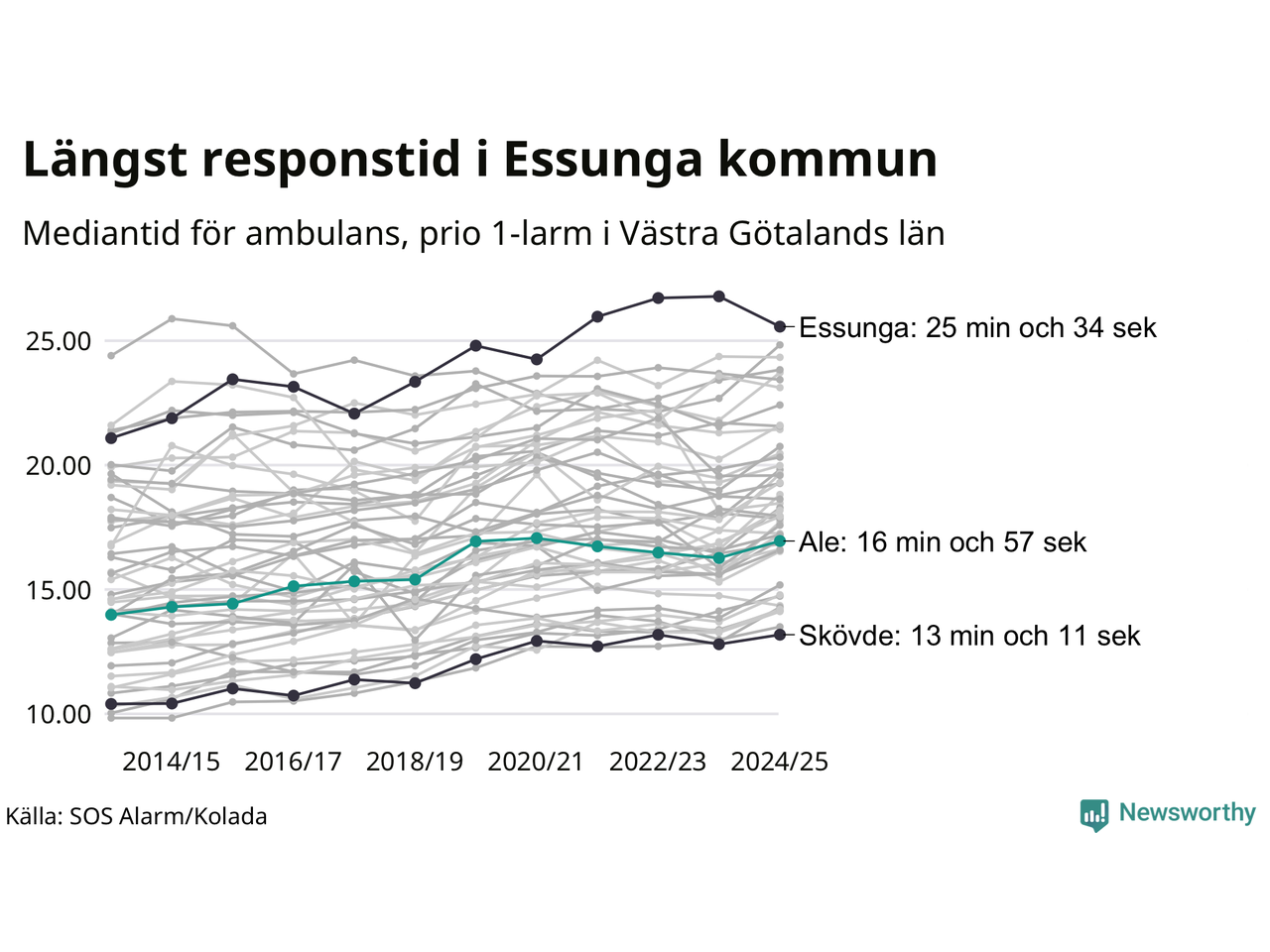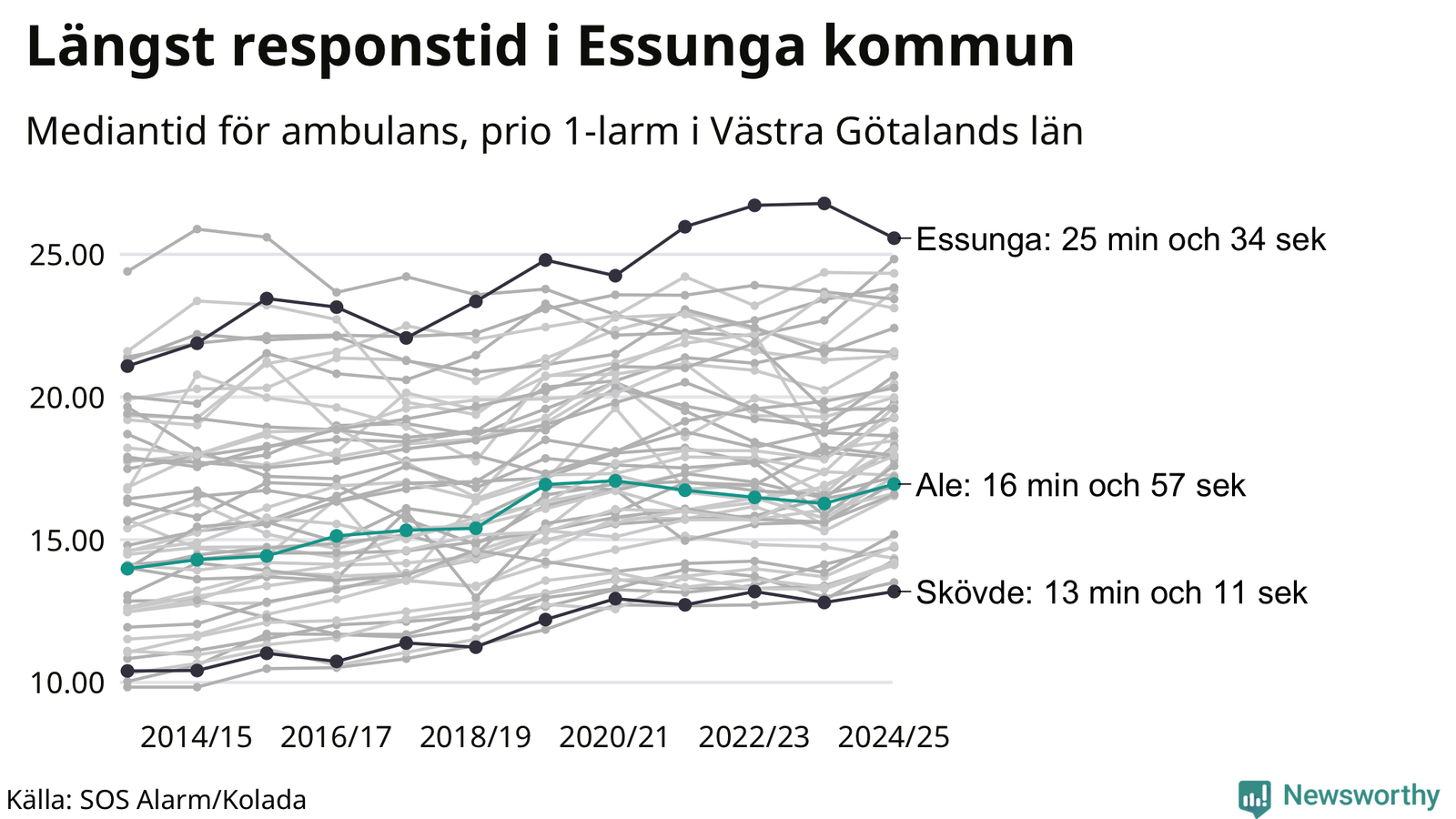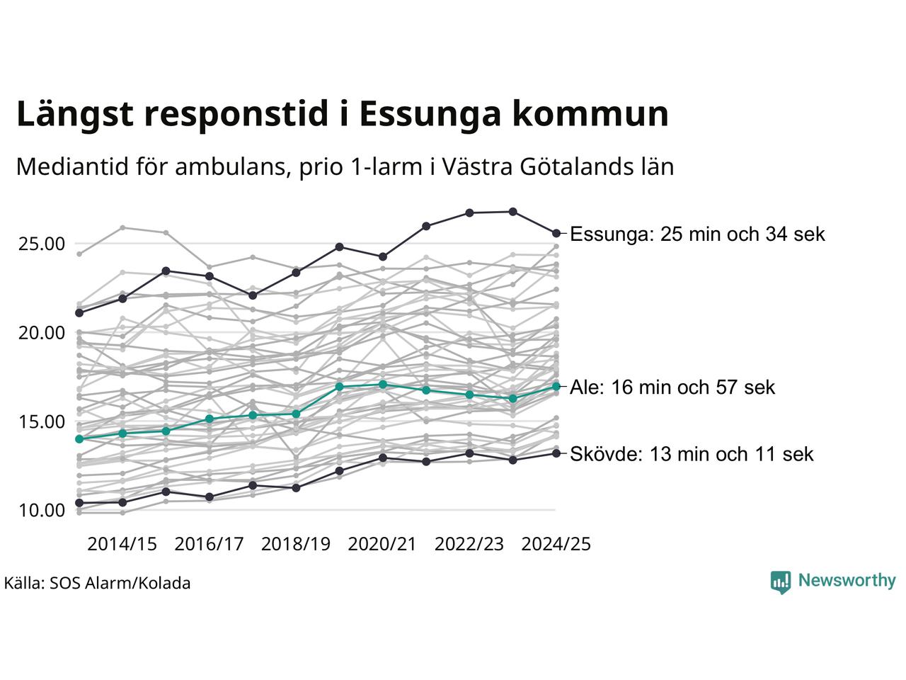 Ale tillhör inte de kommuner i Västra Götalandsregionen som får vänta längst på ambulans – men inte heller de som får snabbast hjälp. Längst är väntetiden i Essunga kommun, som också tillhör de tio kommuner i landet som får vänta längst på ambulans: 25 minuter och 34 sekunder. Snabbast var ambulansen framme i Skövde, där det tog 13 minuter och 11 sekunder från larmsamtalet 2024/2025.