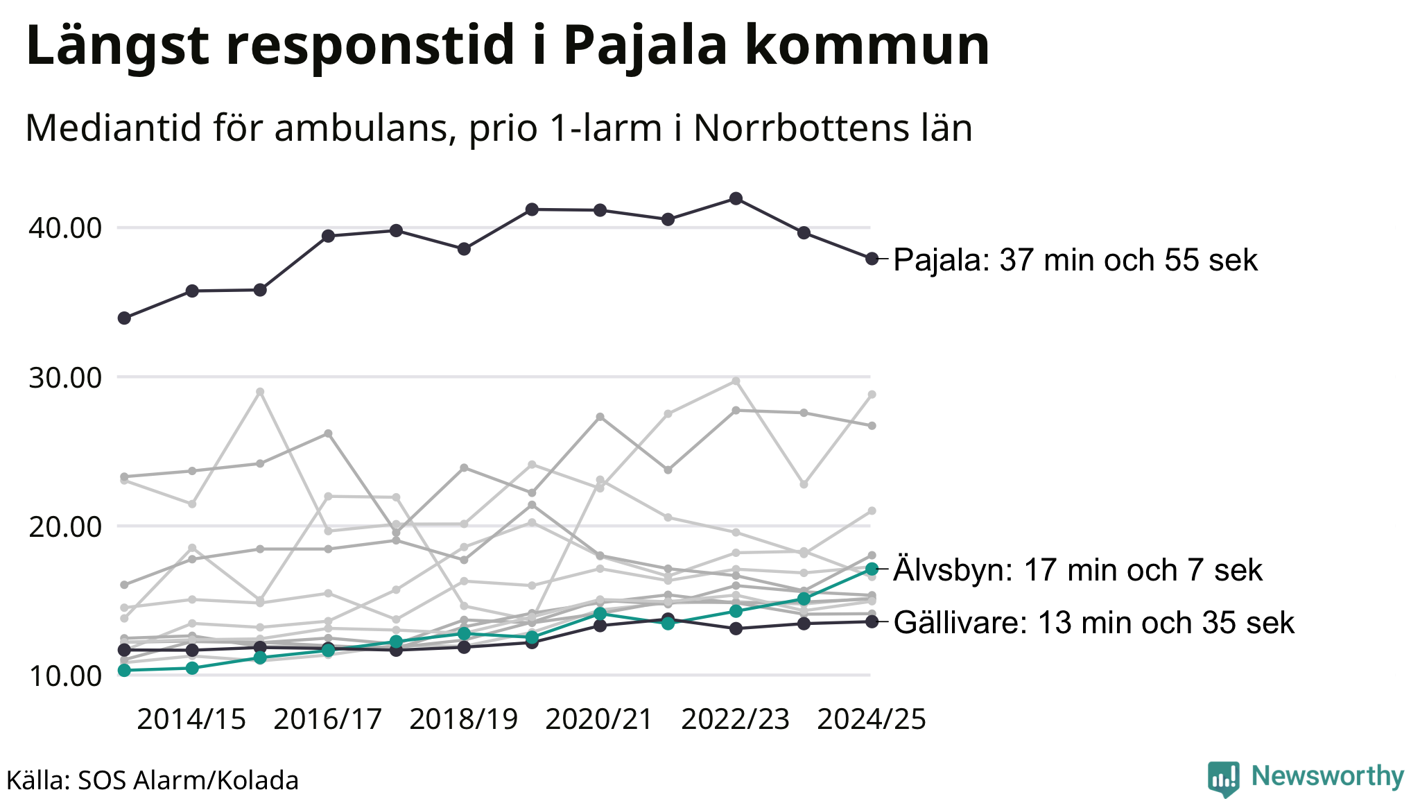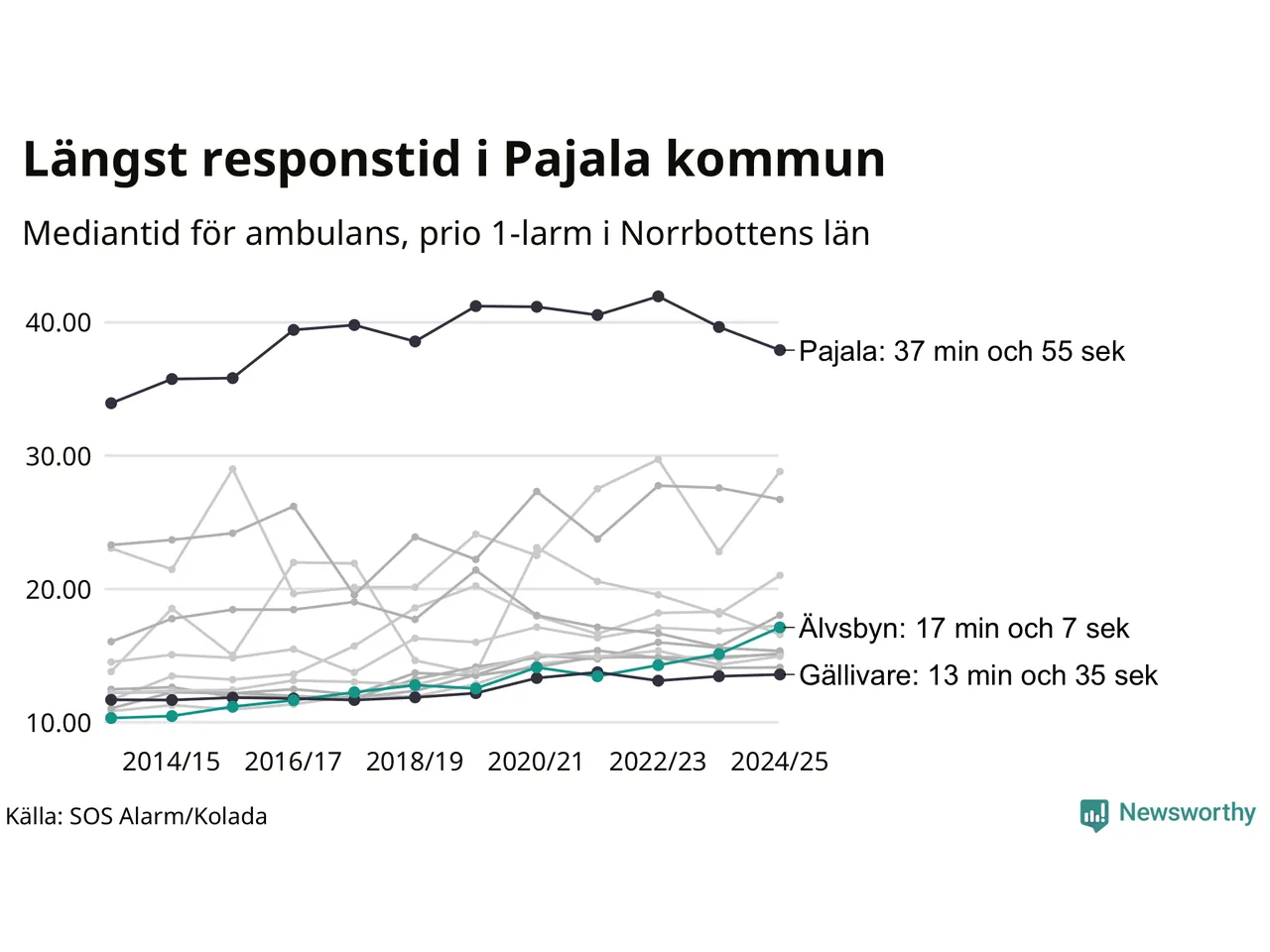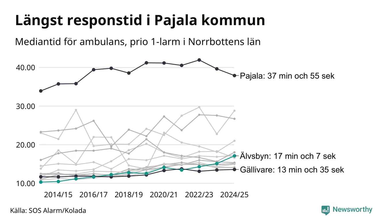 Det tar 17 minuter och 7 sekunder från att 112-samtalet når larmcentralen till att ambulansen är på plats i Älvsbyns kommun. Det visar de senaste siffrorna från SOS Alarm. Tiden är en mediantid för alla prio 1-larm mellan 1 juni 2024 och 31 maj 2025 och ett nyckeltal som redovisas varje år.
