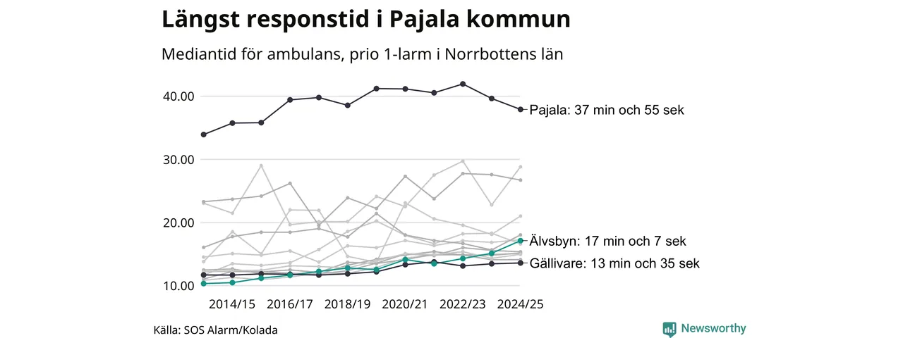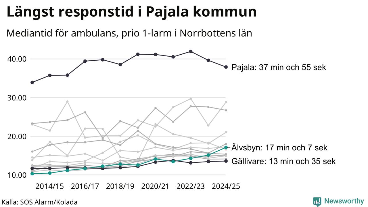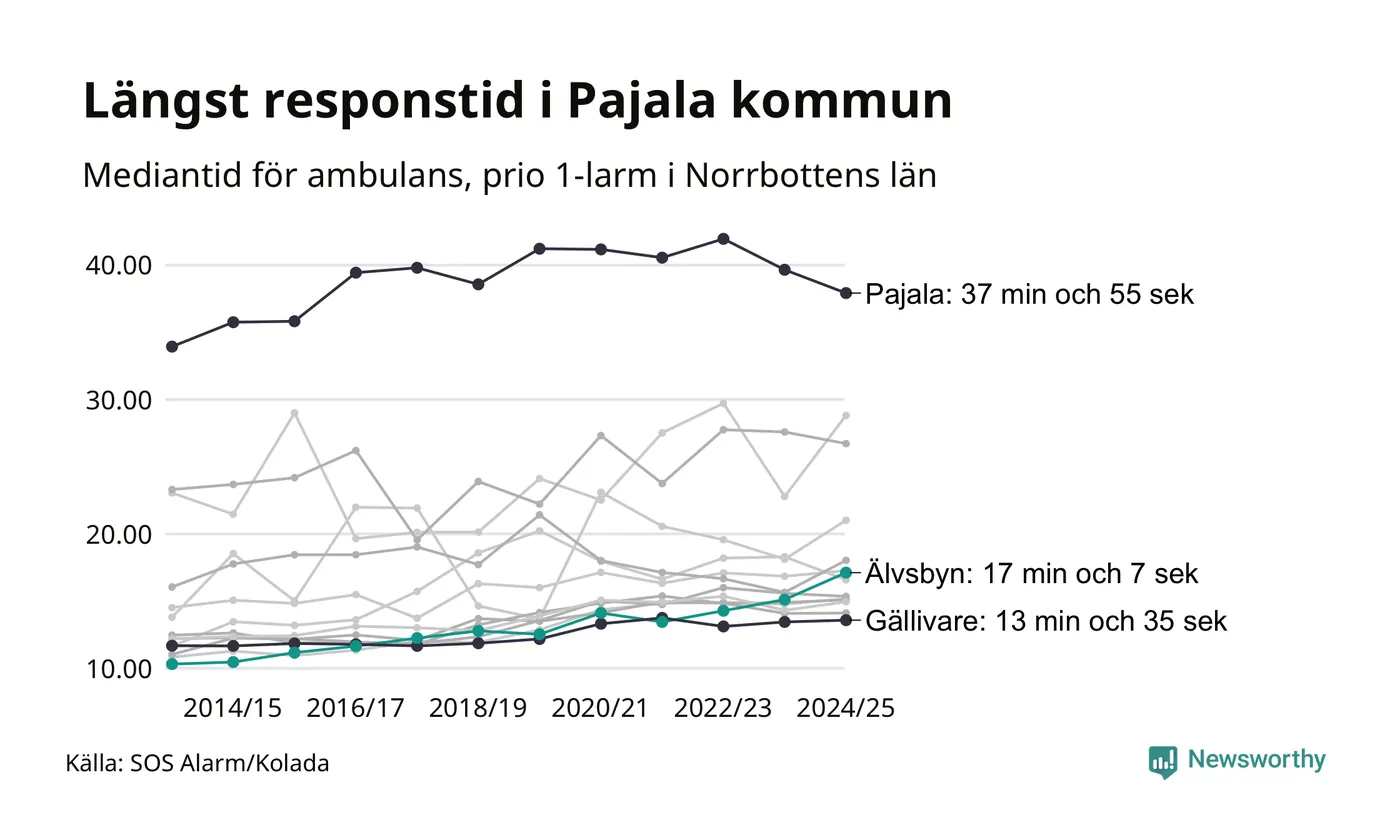 Älvsbyn tillhör inte de kommuner i Region Norrbotten som får vänta längst på ambulans – men inte heller de som får snabbast hjälp. Längst är väntetiden i Pajala kommun, som också är den kommun i hela landet som får vänta längst på ambulans: 37 minuter och 55 sekunder. Snabbast var ambulansen framme i Gällivare, där det tog 13 minuter och 35 sekunder från larmsamtalet 2024/2025.