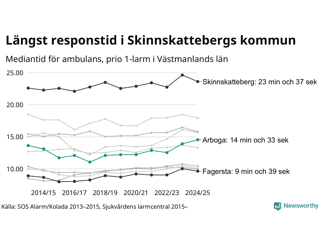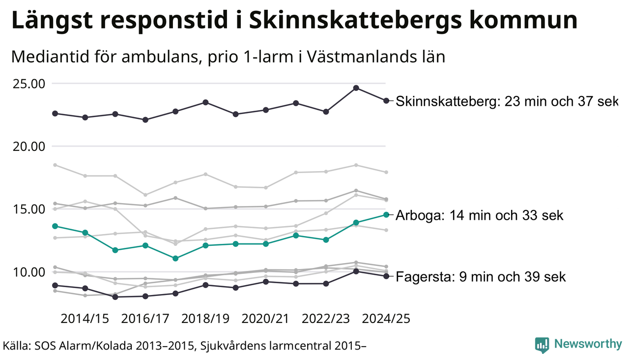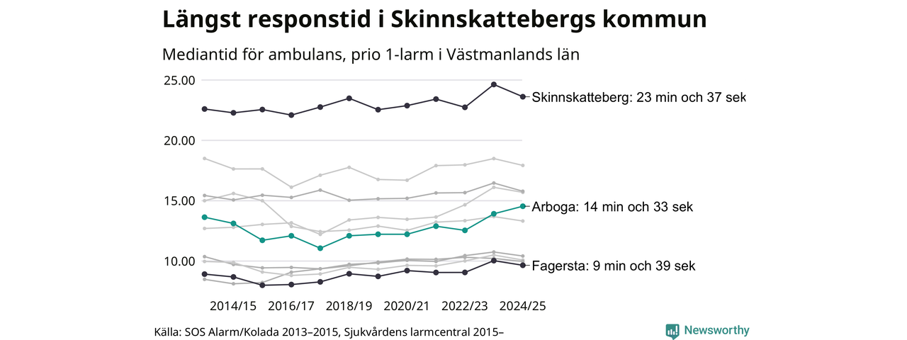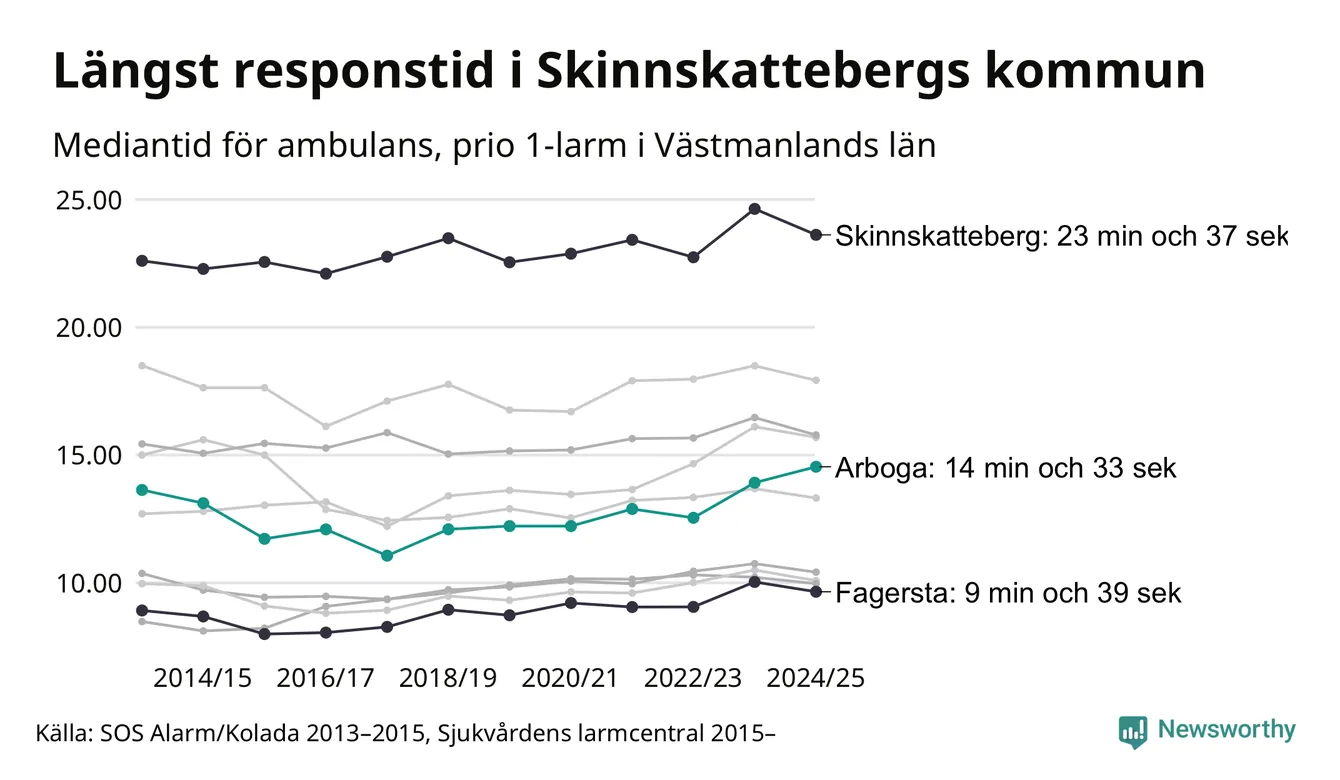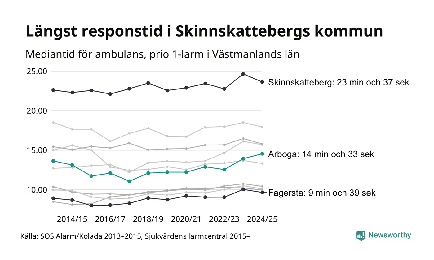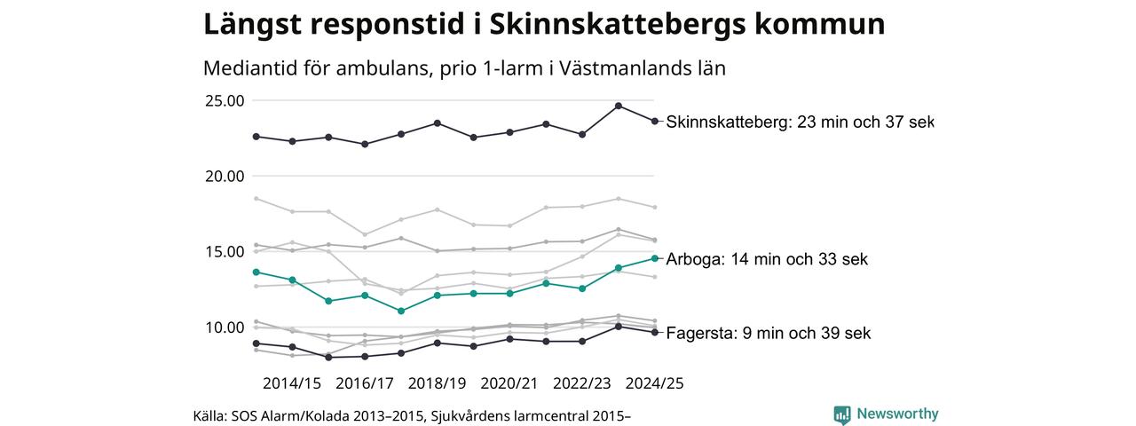 Det tar 14 minuter och 33 sekunder från att 112-samtalet når larmcentralen till att ambulansen är på plats i Arboga kommun. Det visar de senaste siffrorna från Sjukvårdens larmcentral. Tiden är en mediantid för alla prio 1-larm mellan 1 juni 2024 och 31 maj 2025 och ett nyckeltal som redovisas varje år.
