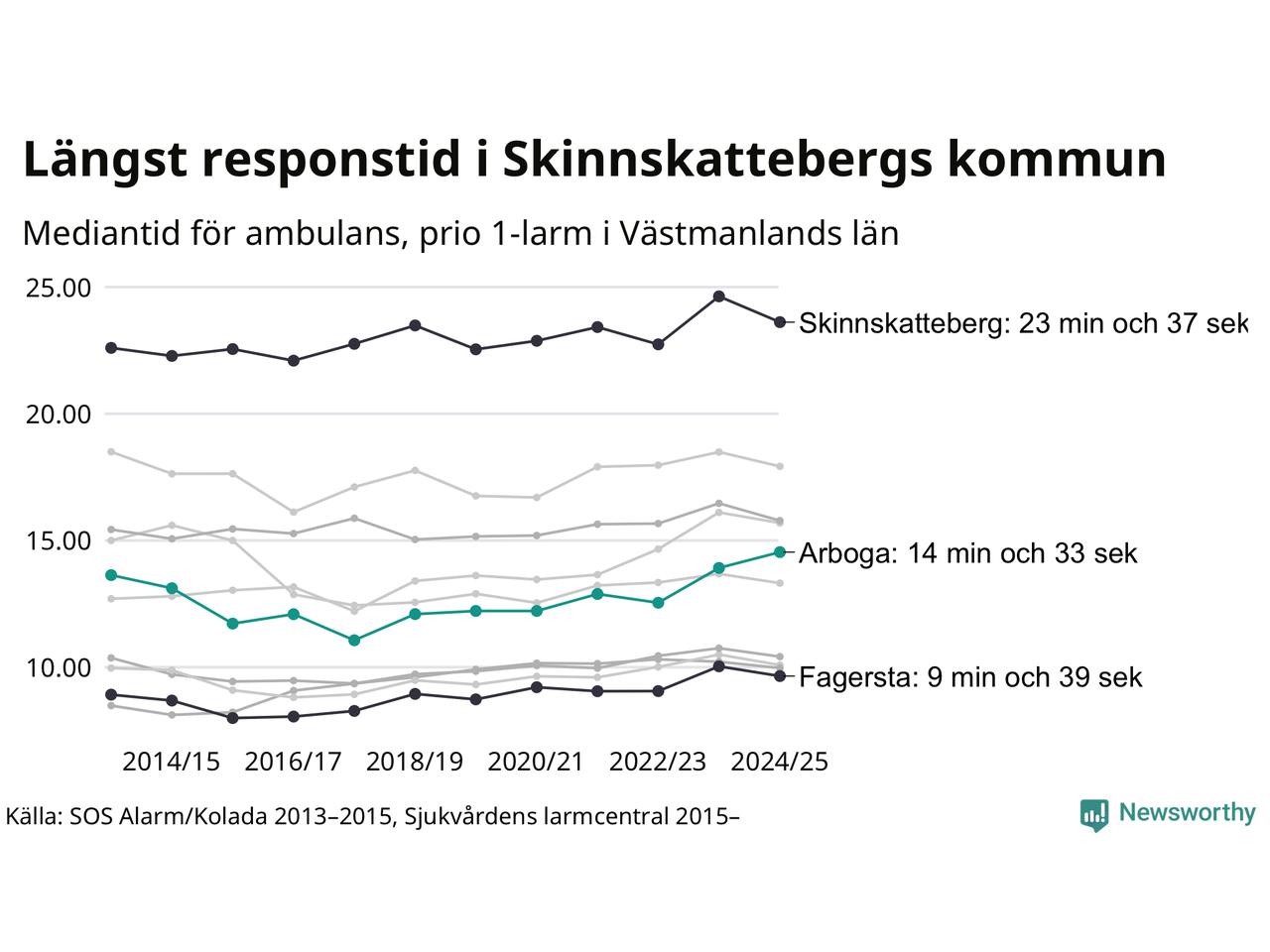 Även om väntan i Skinnskatteberg är lång för att vara Region Västmanland krävs ytterligare 1 minut och 29 sekunder för att ta sig in på topp tiolistan över kommuerna i landet med längst väntetid. Längst är väntan på ambulans i Pajala kommun, 37 minuter och 55 sekunder. Kommunerna med längst responstid finns i Norrlands inland eller i glesbygd.
