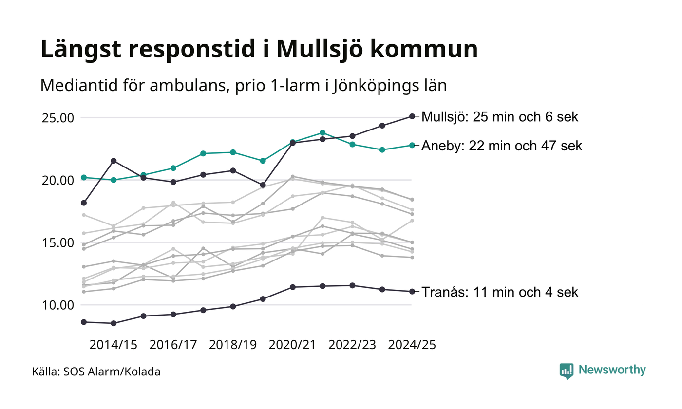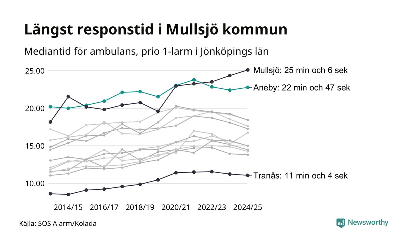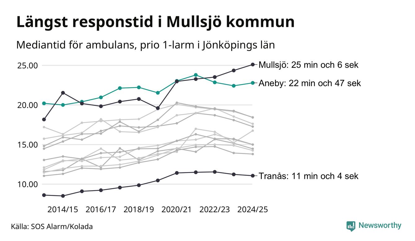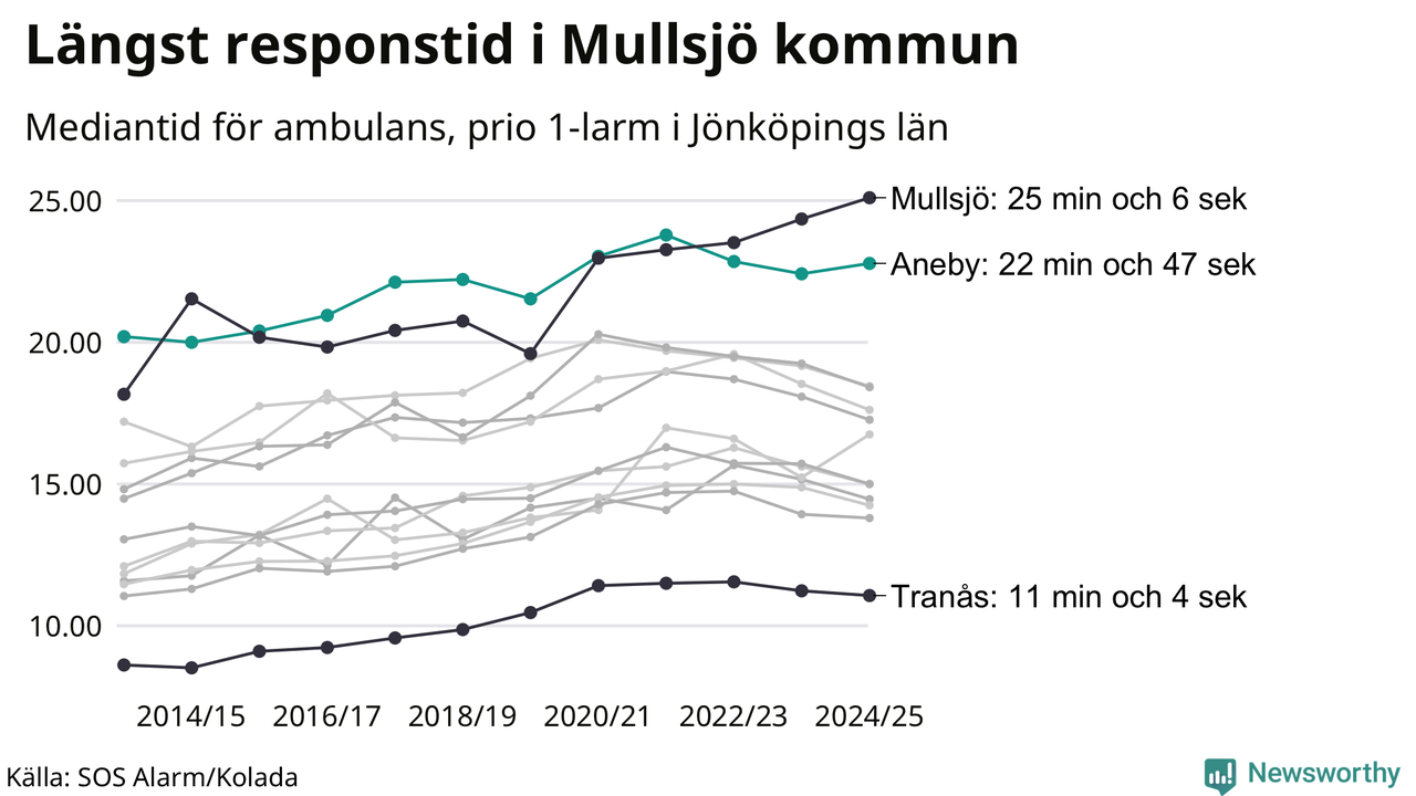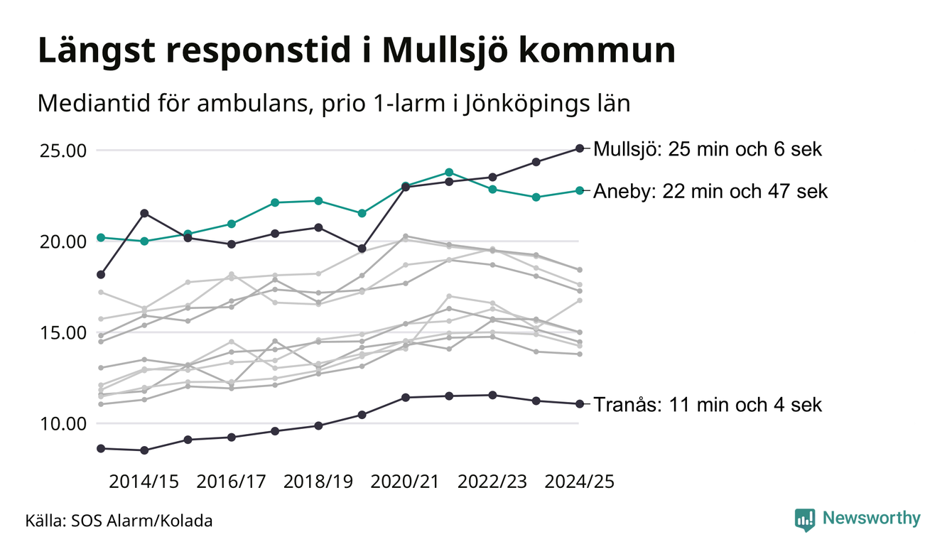 Det tar 22 minuter och 47 sekunder från att 112-samtalet når larmcentralen till att ambulansen är på plats i Aneby kommun. Det visar de senaste siffrorna från SOS Alarm. Tiden är en mediantid för alla prio 1-larm mellan 1 juni 2024 och 31 maj 2025 och ett nyckeltal som redovisas varje år.