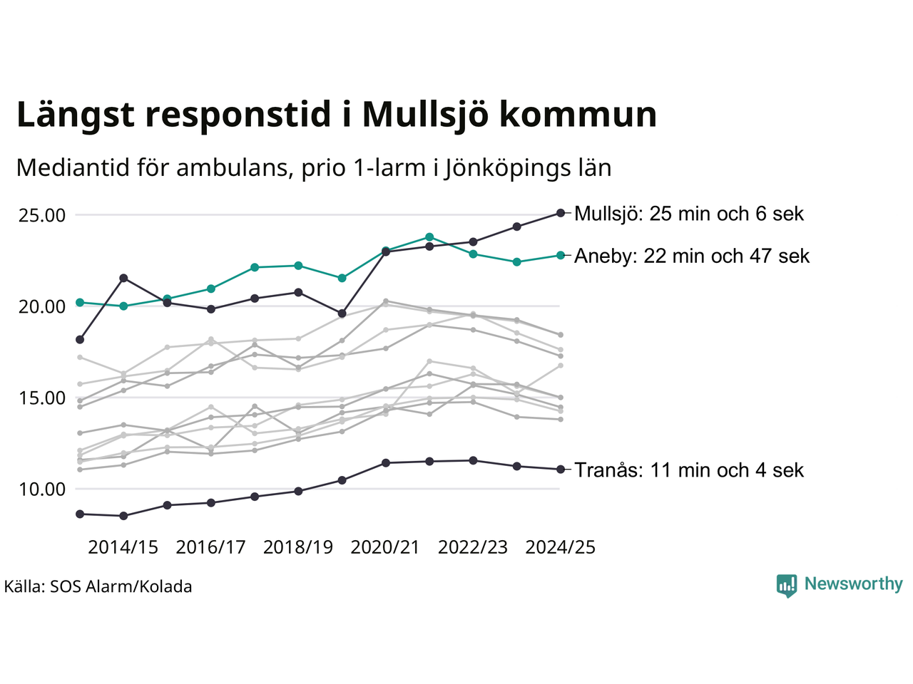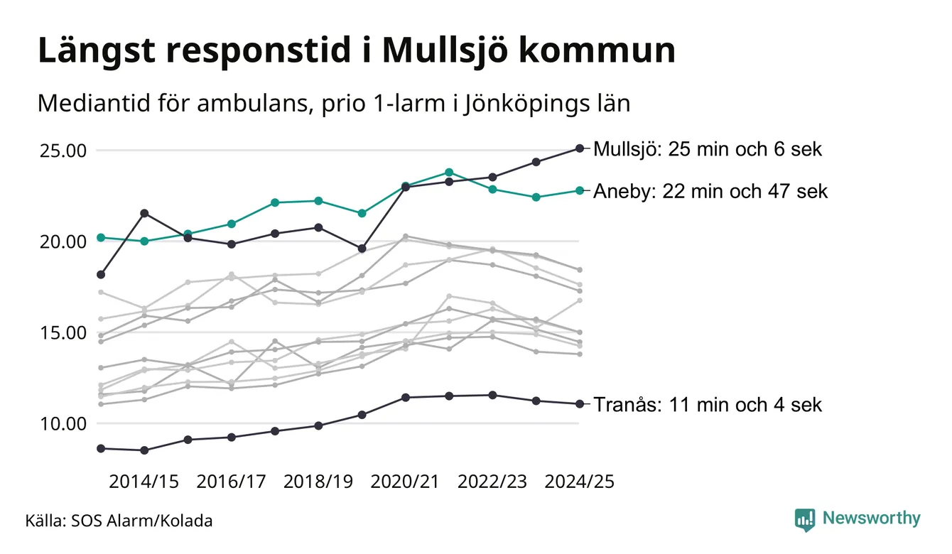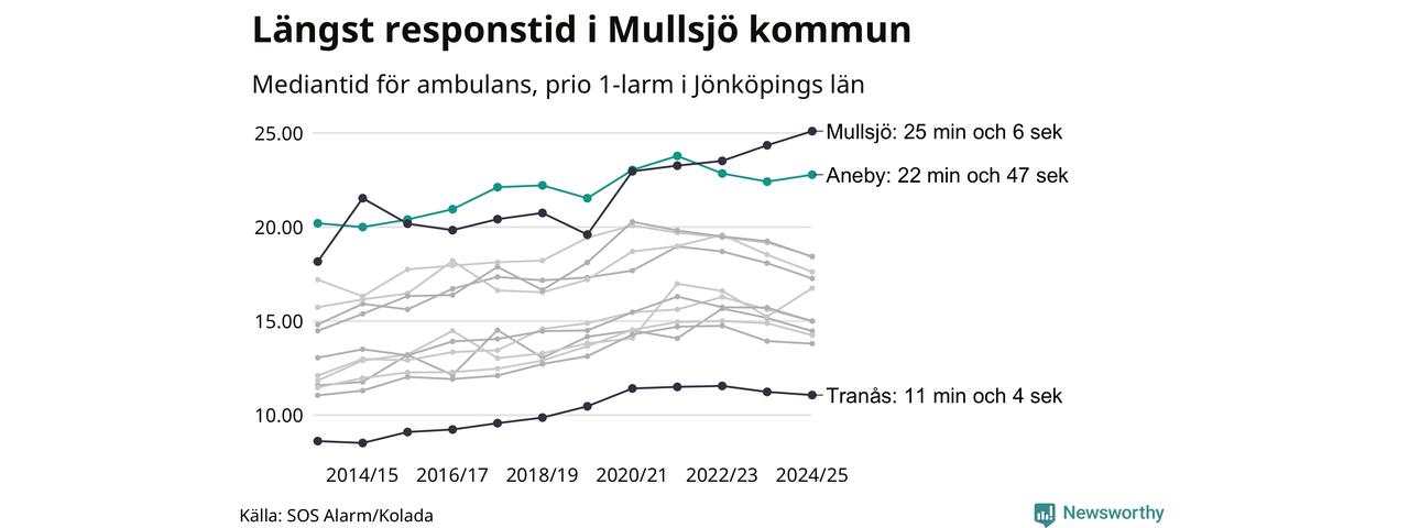 Bara i Mullsjö (25 minuter och 6 sekunder) får man vänta längre på ambulansen i Region Jönköping. Snabbast är den framme i Tranås: 11 minuter och 4 sekunder.
