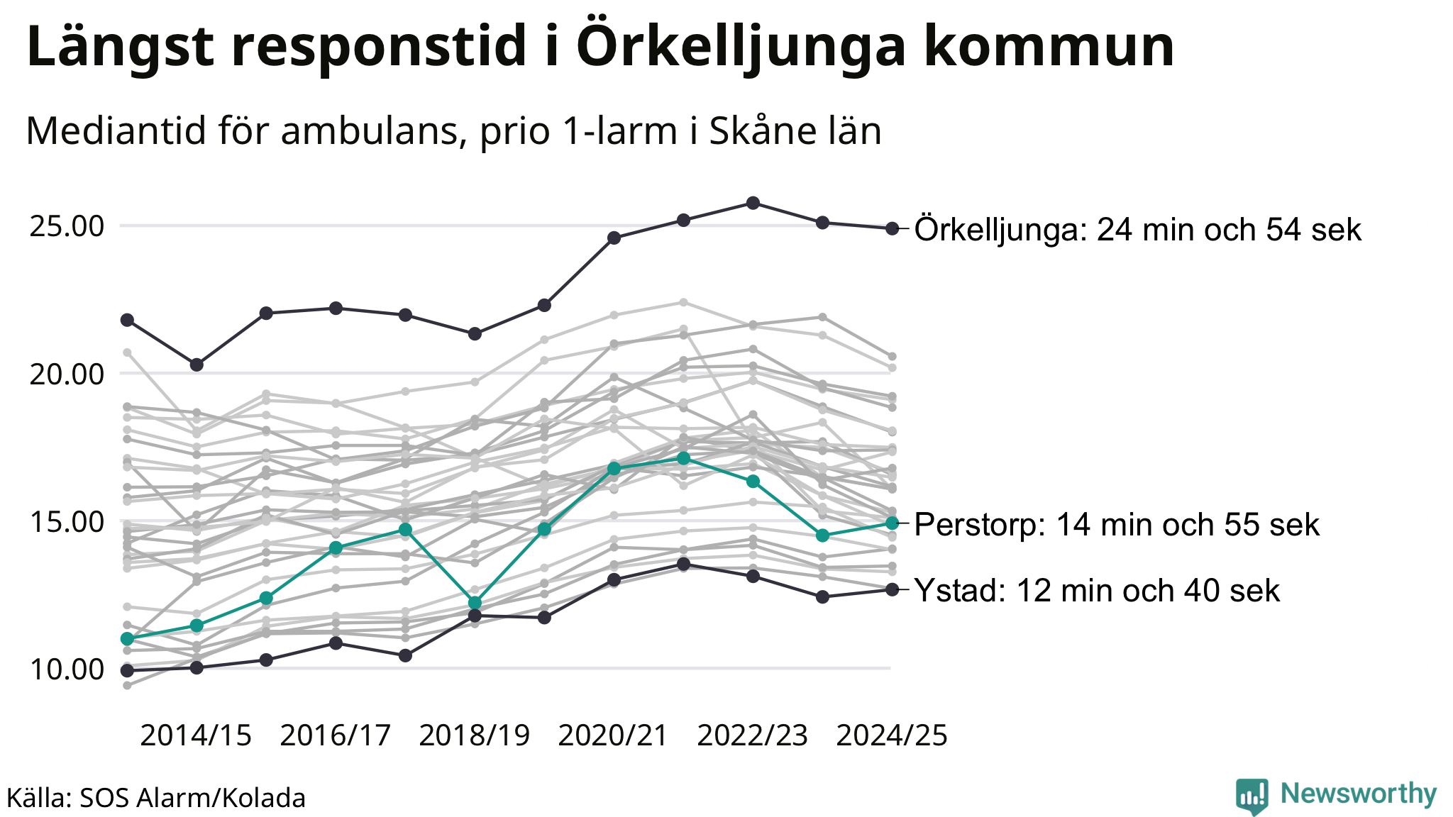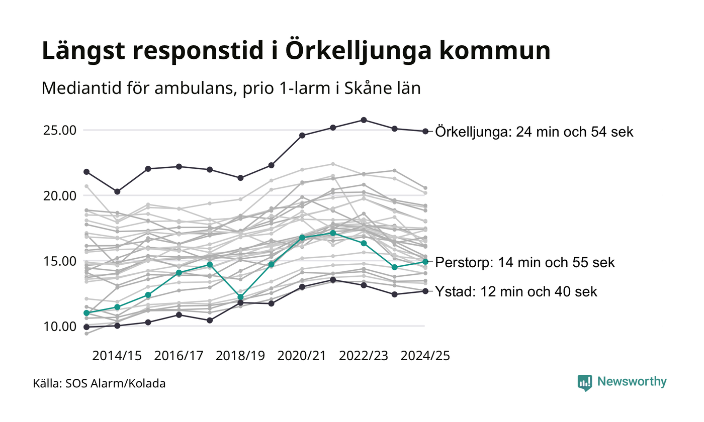 Det tar 14 minuter och 55 sekunder från att 112-samtalet når larmcentralen till att ambulansen är på plats i Perstorps kommun. Det visar de senaste siffrorna från SOS Alarm. Tiden är en mediantid för alla prio 1-larm mellan 1 juni 2024 och 31 maj 2025 och ett nyckeltal som redovisas varje år.