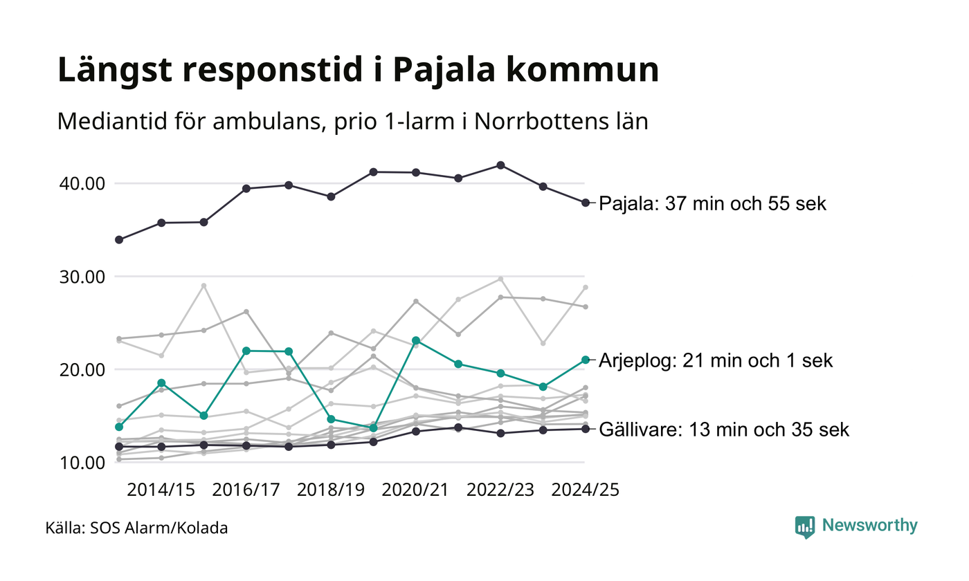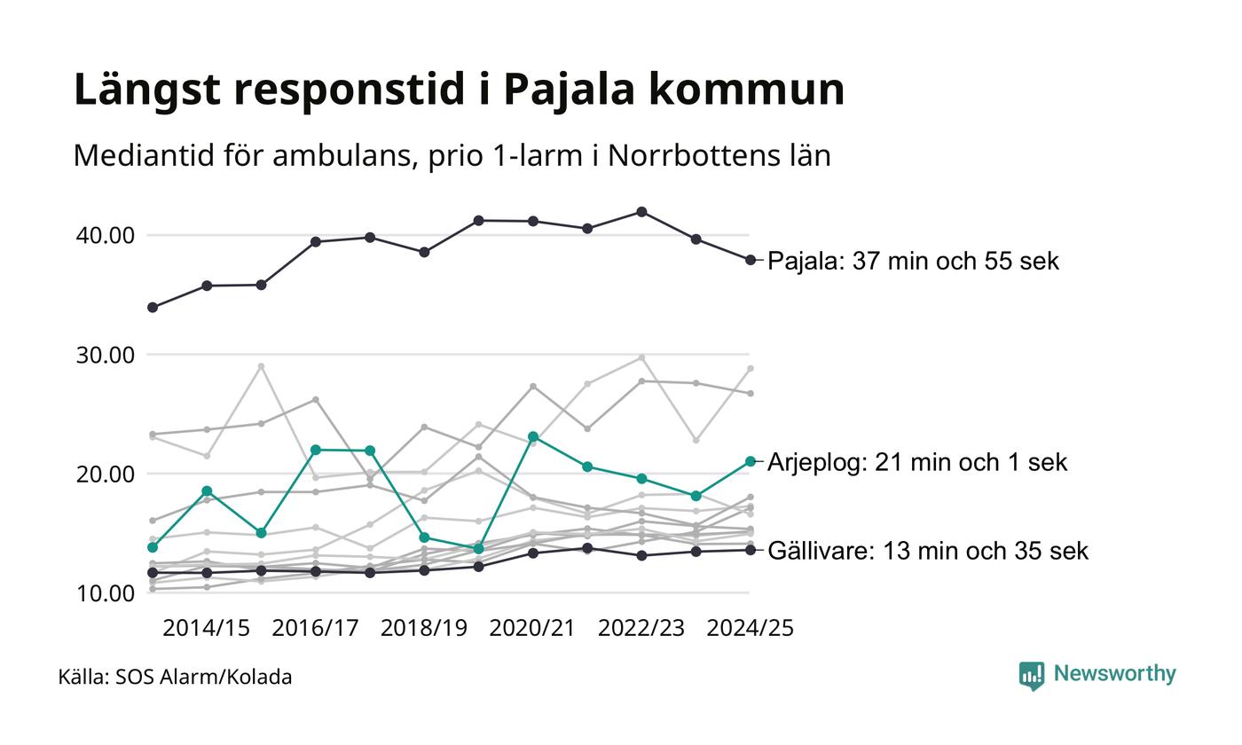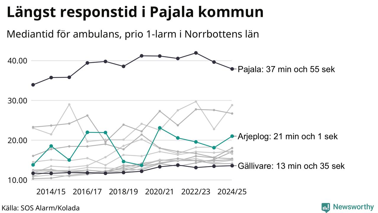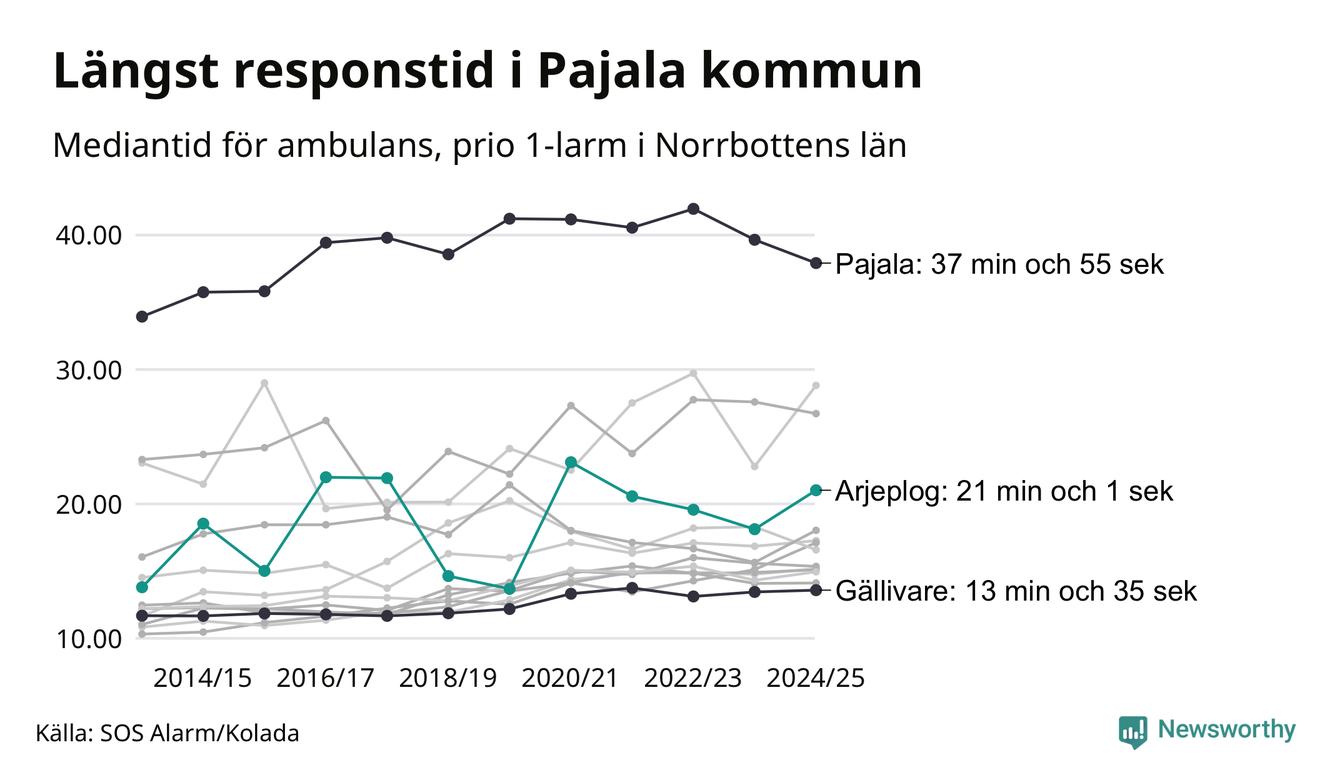 Det tar 21 minuter och 1 sekund från att 112-samtalet når larmcentralen till att ambulansen är på plats i Arjeplogs kommun. Det visar de senaste siffrorna från SOS Alarm. Tiden är en mediantid för alla prio 1-larm mellan 1 juni 2024 och 31 maj 2025 och ett nyckeltal som redovisas varje år.