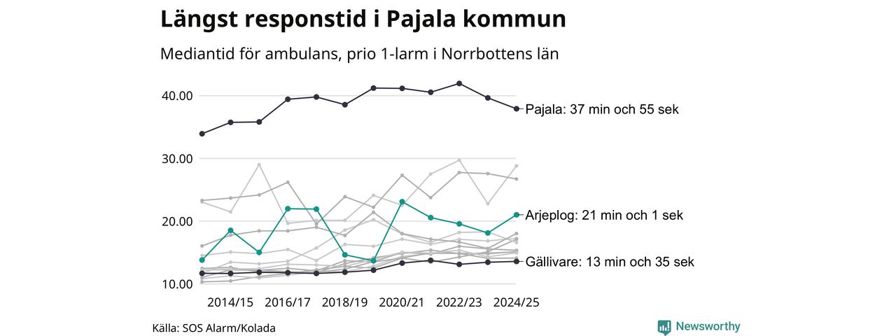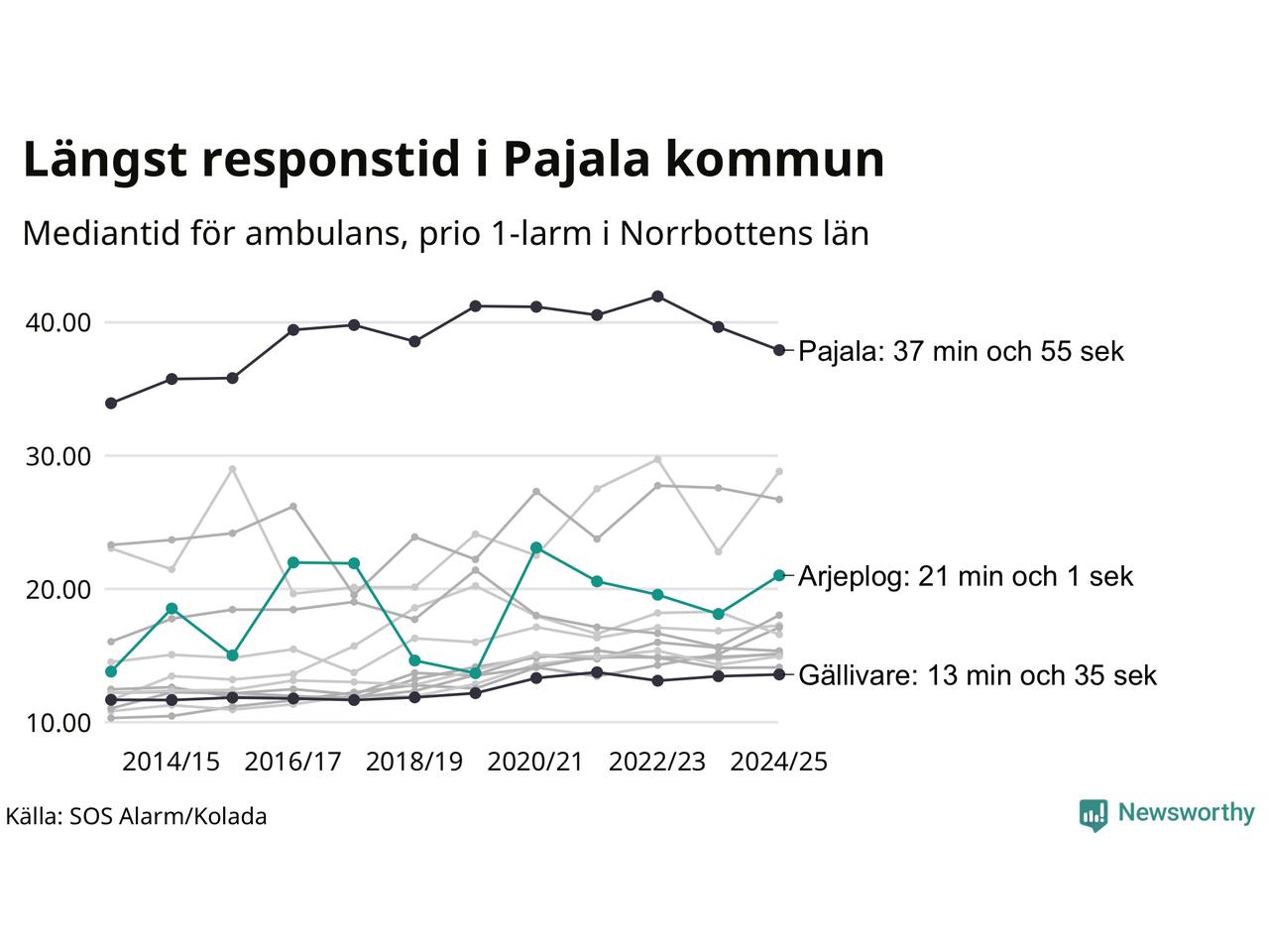 Arjeplog tillhör de kommuner i Region Norrbotten som får vänta längst på ambulansen. Längst är väntetiden i Pajala kommun, som också är den kommun i hela landet som får vänta längst på ambulans: 37 minuter och 55 sekunder. Snabbast var ambulansen framme i Gällivare, där det tog 13 minuter och 35 sekunder från larmsamtalet 2024/2025.