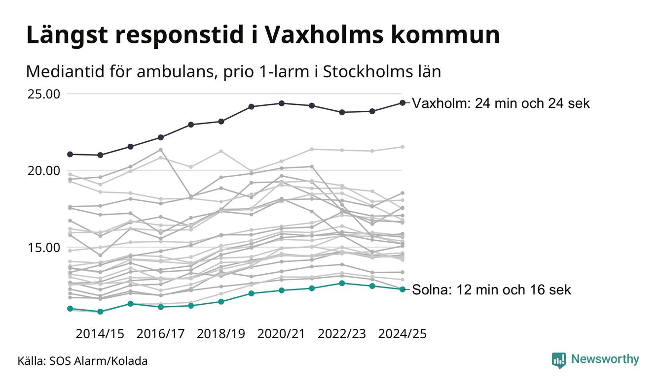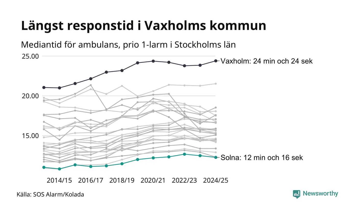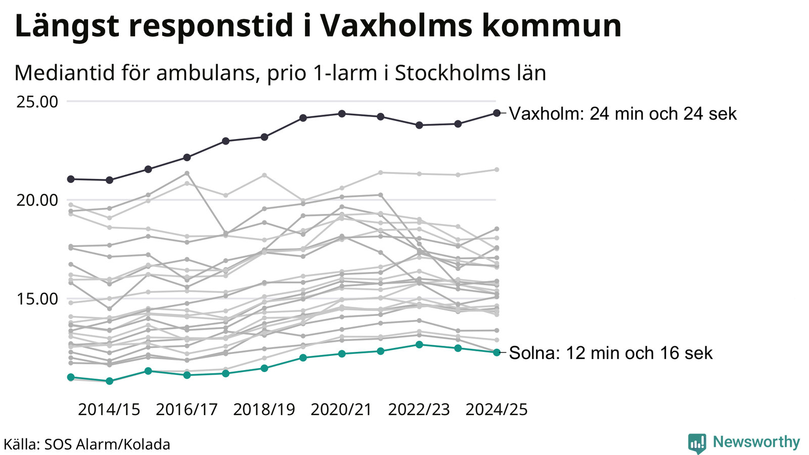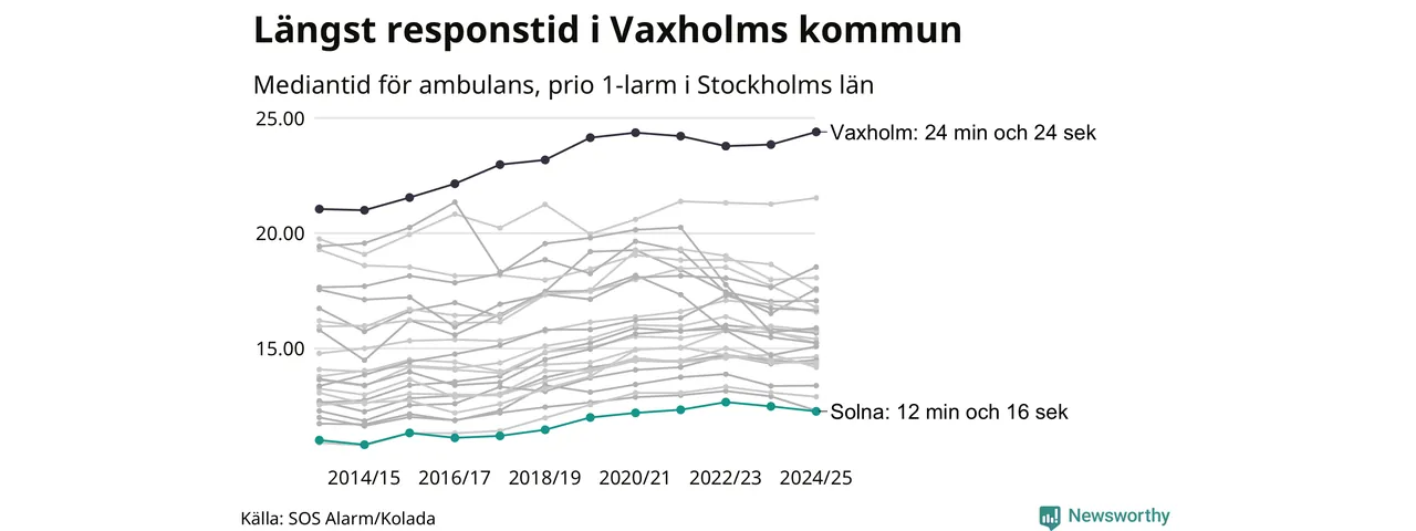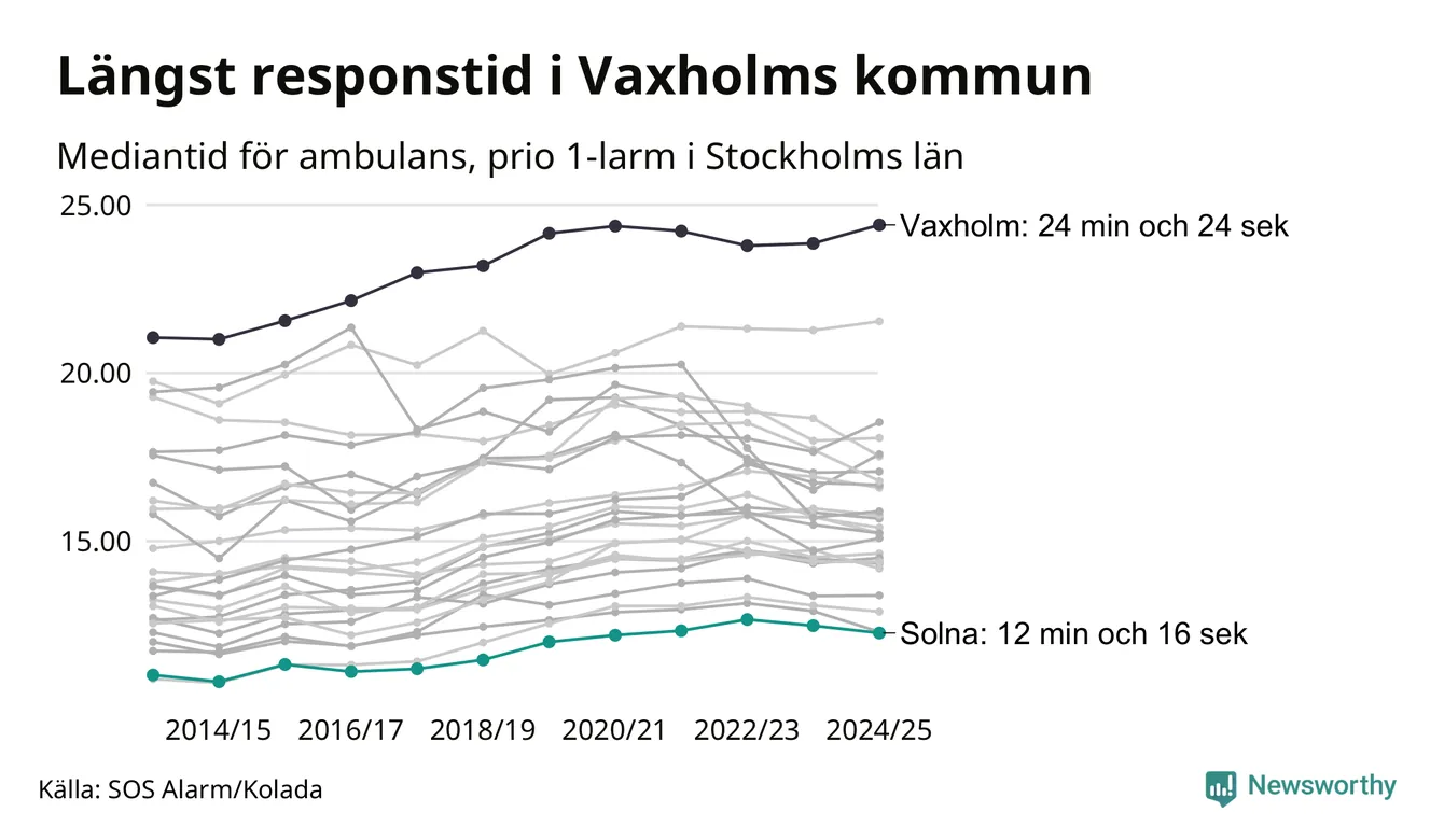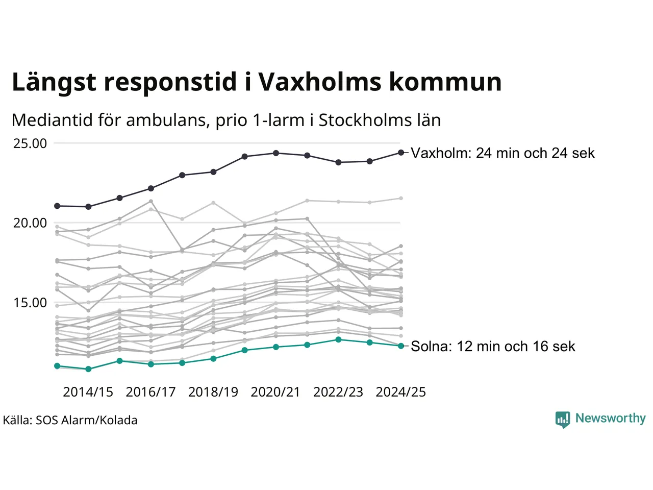 Bland kommunerna i Region Stockholm nåddes Solna snabbast av ambulans under 2024/2025. Längst är väntetiden i Vaxholms kommun: 24 minuter och 24 sekunder.