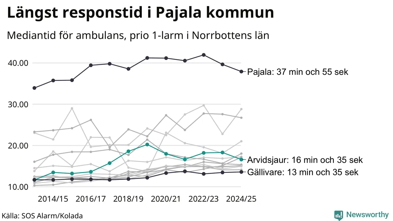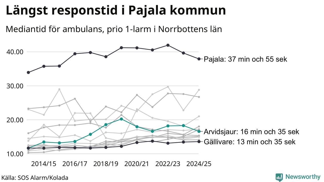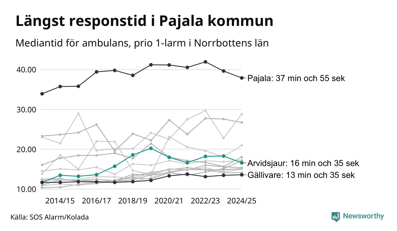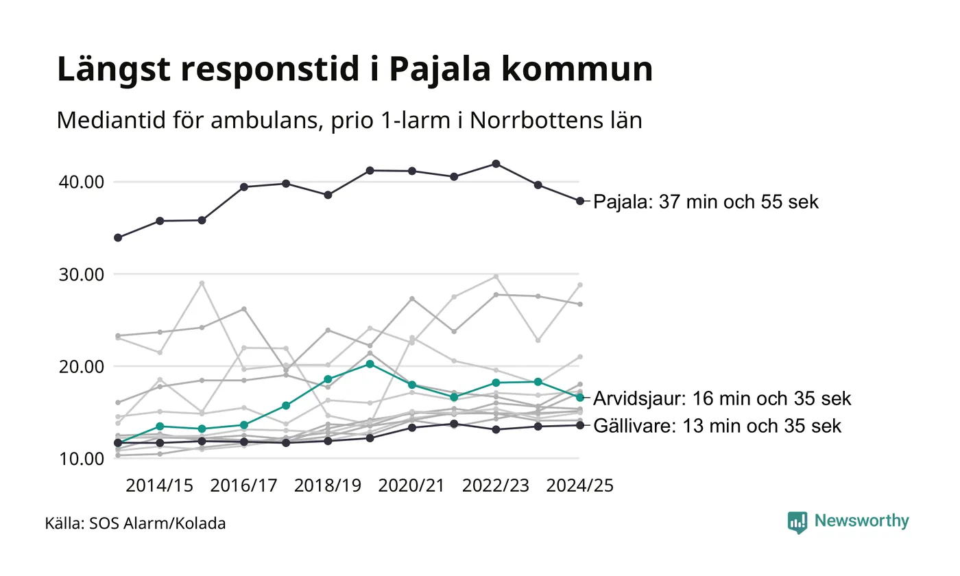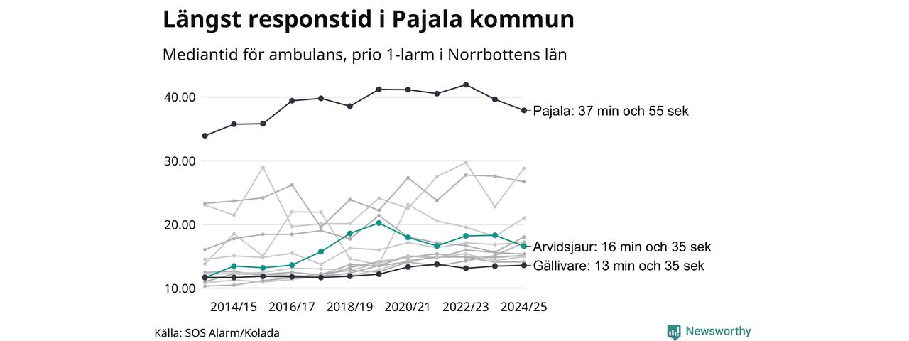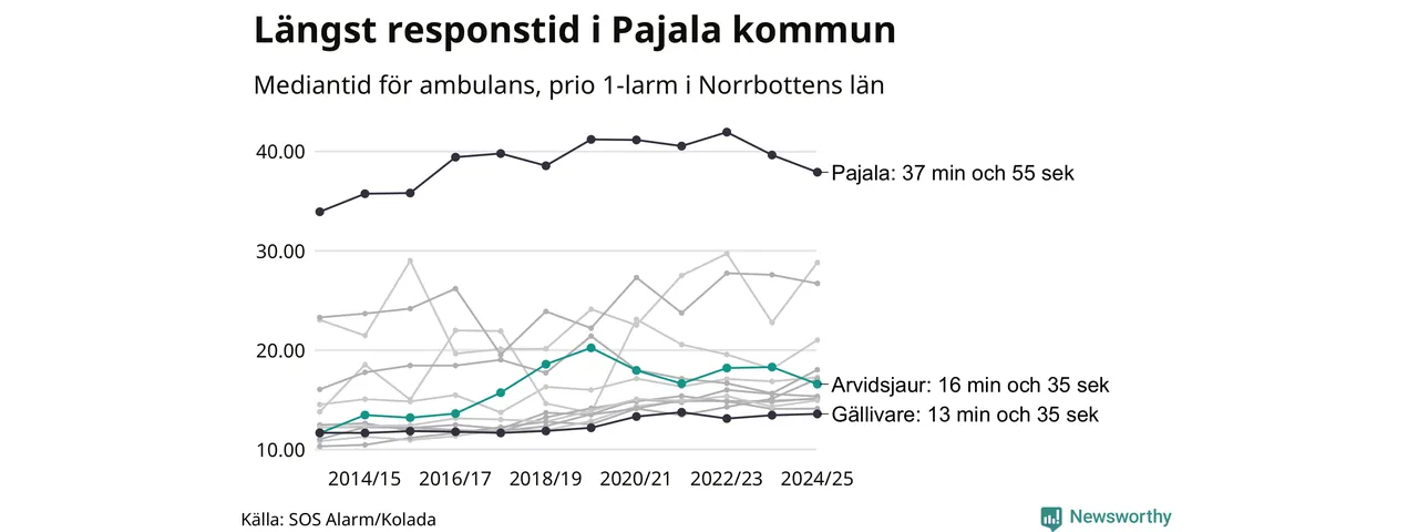 Det tar 16 minuter och 35 sekunder från att 112-samtalet når larmcentralen till att ambulansen är på plats i Arvidsjaurs kommun. Det visar de senaste siffrorna från SOS Alarm. Tiden är en mediantid för alla prio 1-larm mellan 1 juni 2024 och 31 maj 2025 och ett nyckeltal som redovisas varje år.