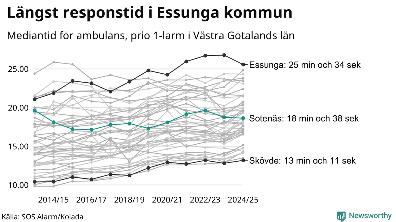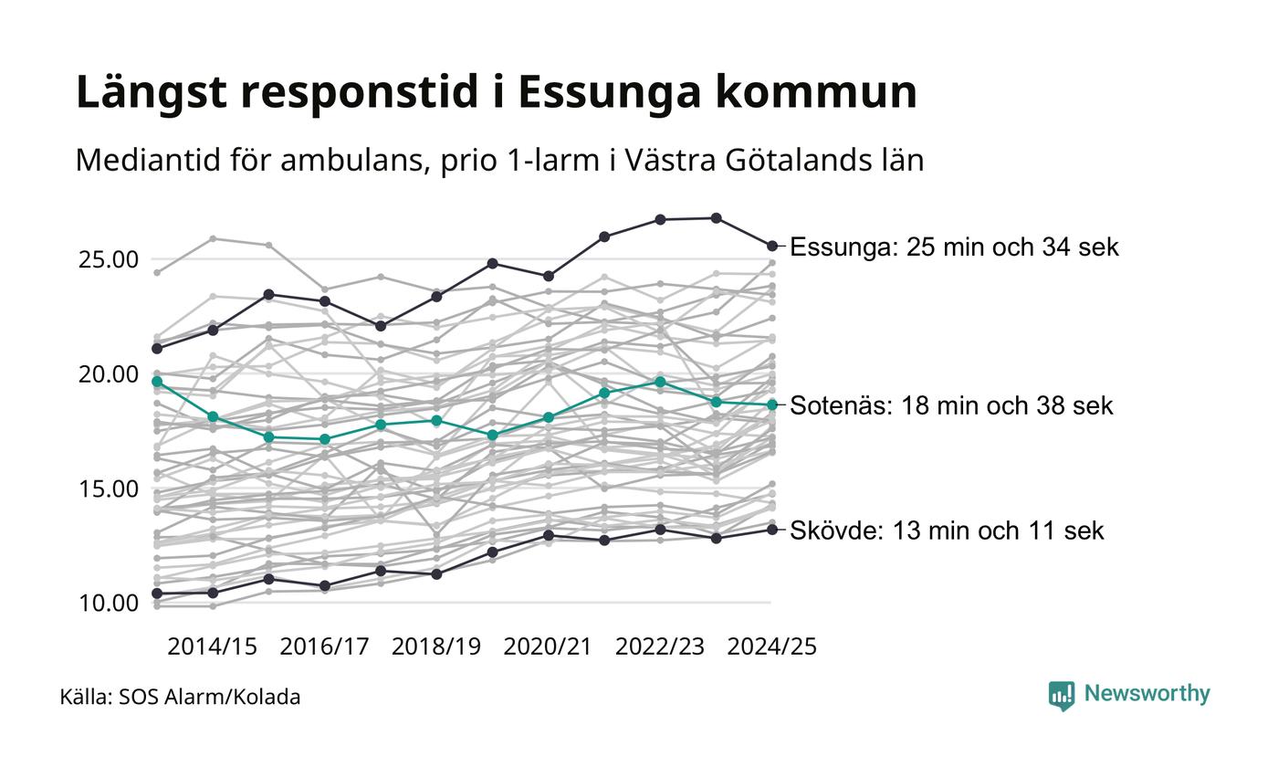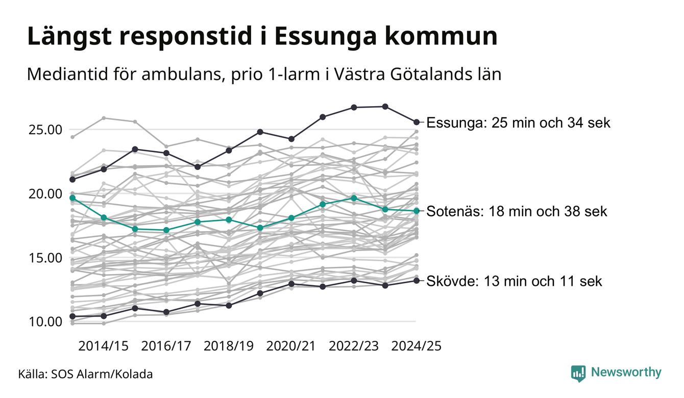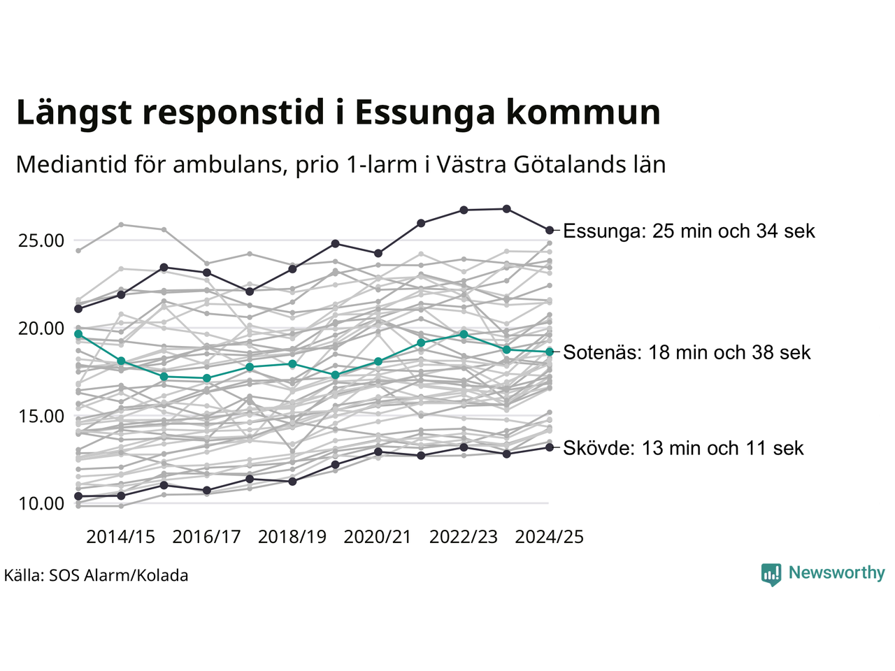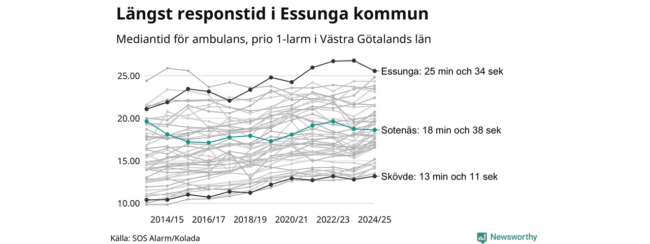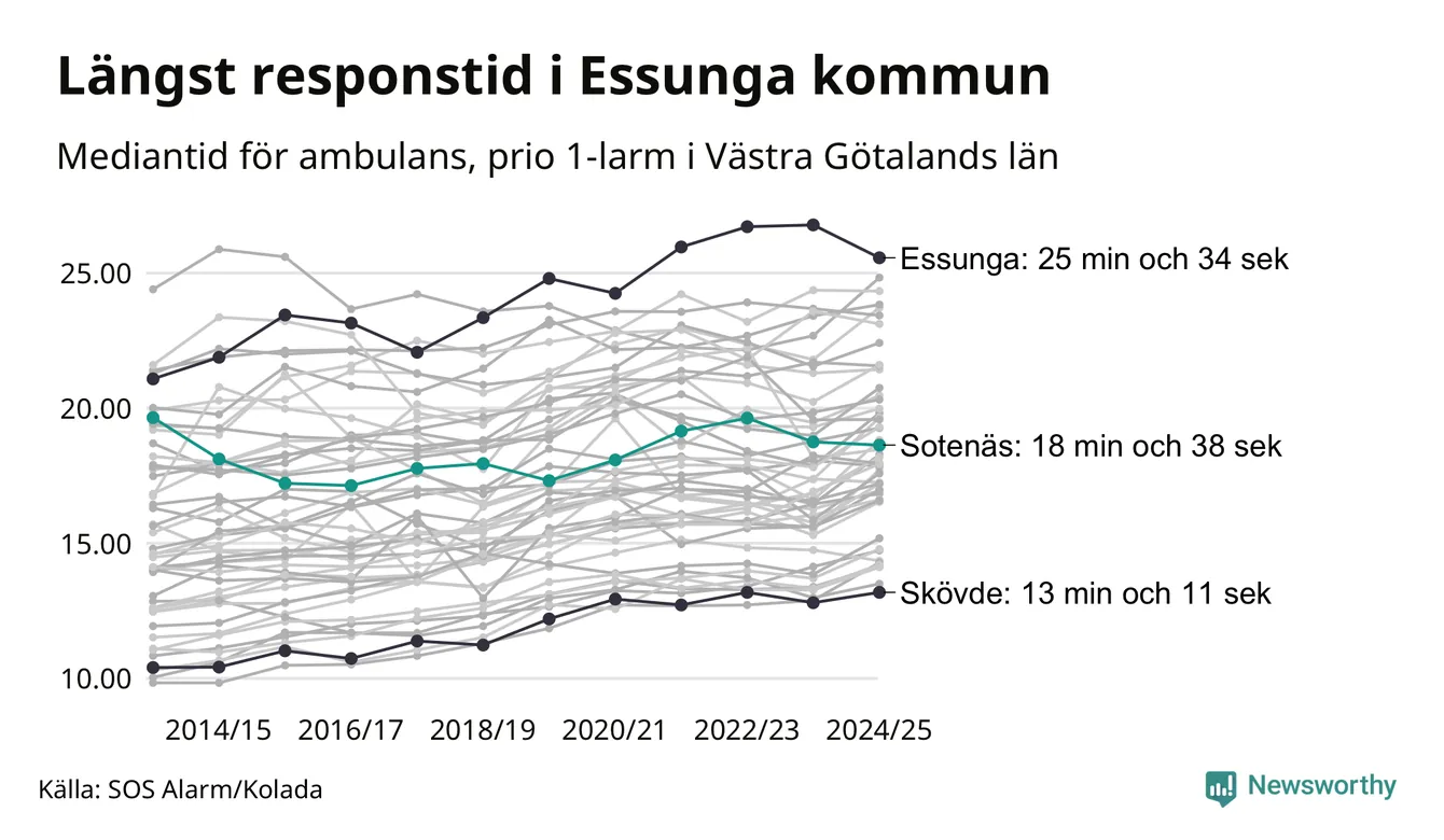Essunga är alltså en av de kommuner som får vänta längst på ambulans i landet. Längst är väntan på ambulans i Pajala kommun, 37 minuter och 55 sekunder. Kommunerna med längst responstid finns i Norrlands inland eller i glesbygd.