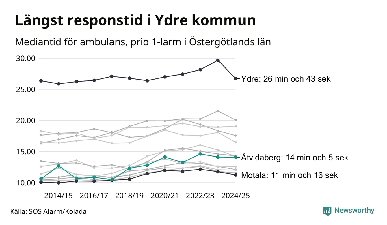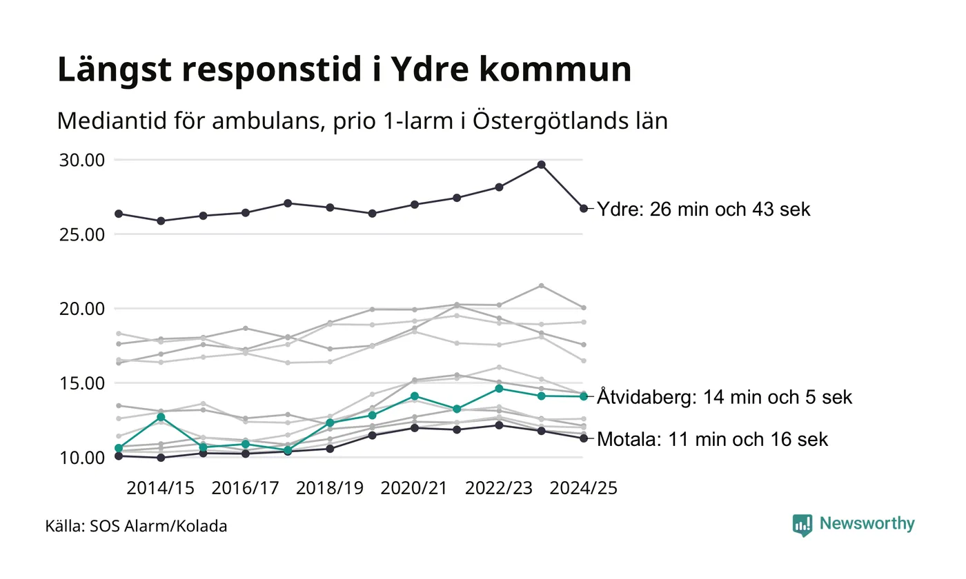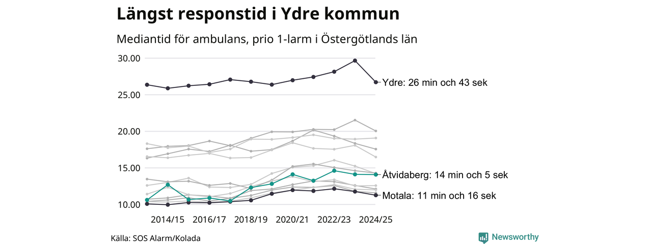 Det tar 14 minuter och 5 sekunder från att 112-samtalet når larmcentralen till att ambulansen är på plats i Åtvidabergs kommun. Det visar de senaste siffrorna från SOS Alarm. Tiden är en mediantid för alla prio 1-larm mellan 1 juni 2024 och 31 maj 2025 och ett nyckeltal som redovisas varje år.