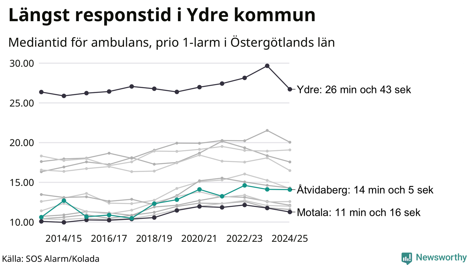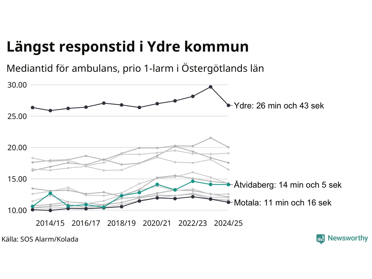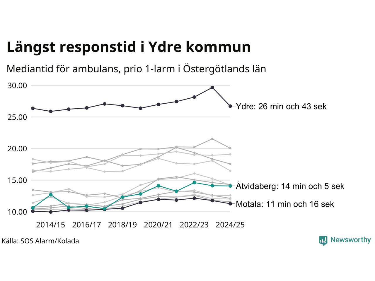 Det tar 14 minuter och 5 sekunder från att 112-samtalet når larmcentralen till att ambulansen är på plats i Åtvidabergs kommun. Det visar de senaste siffrorna från SOS Alarm. Tiden är en mediantid för alla prio 1-larm mellan 1 juni 2024 och 31 maj 2025 och ett nyckeltal som redovisas varje år.
