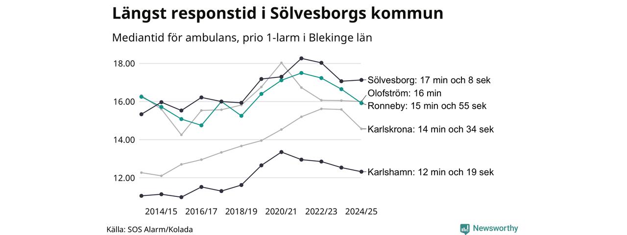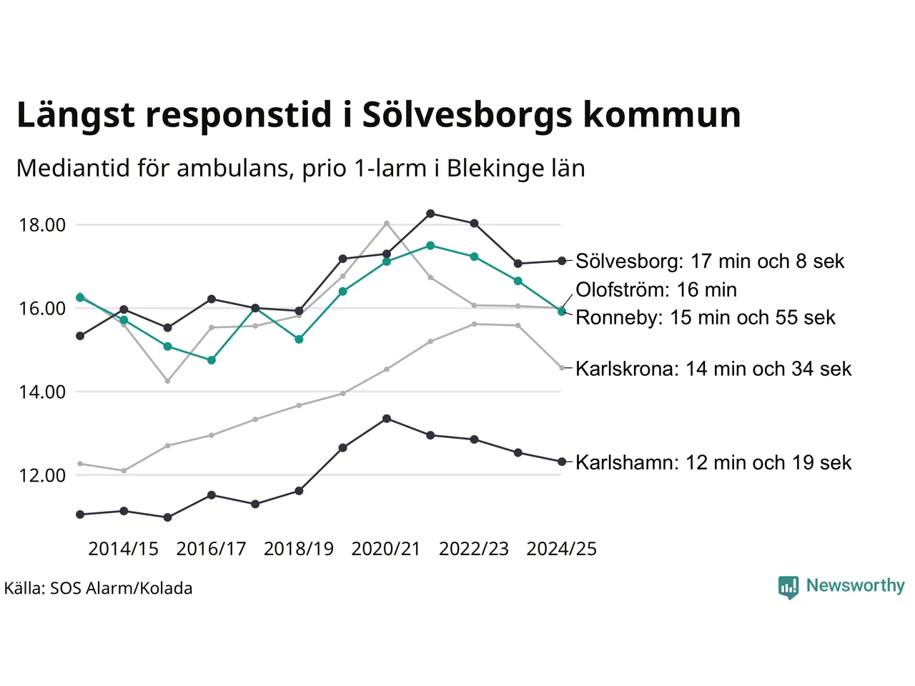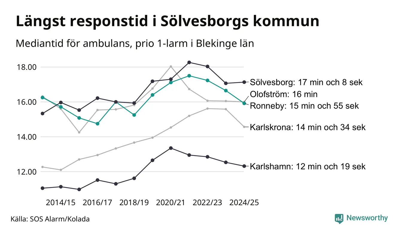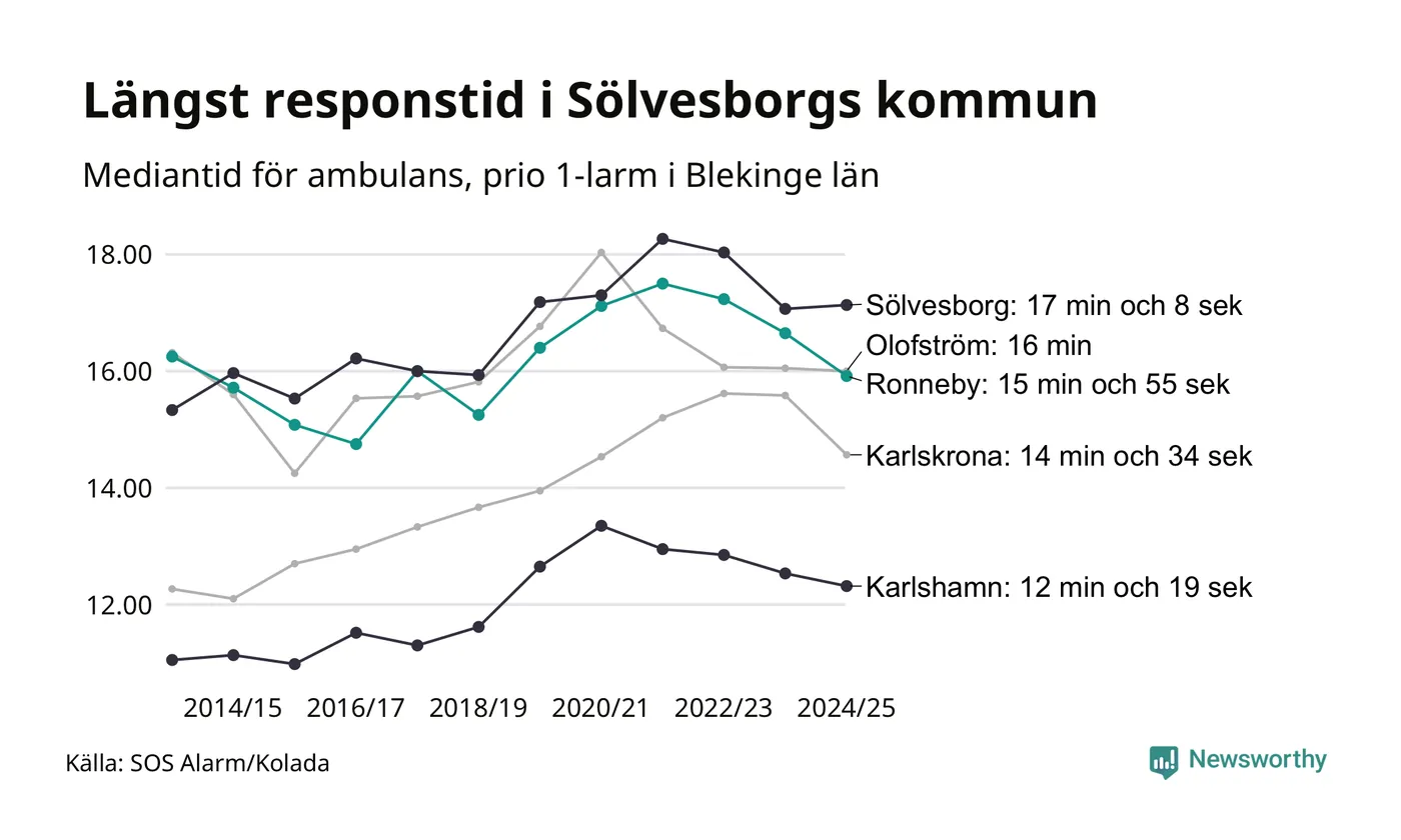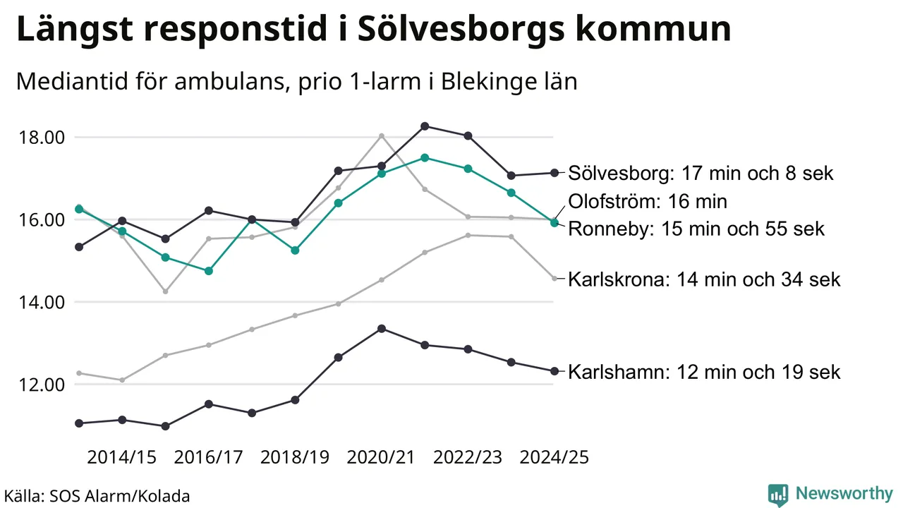 Det tar 15 minuter och 55 sekunder från att 112-samtalet når larmcentralen till att ambulansen är på plats i Ronneby kommun. Det visar de senaste siffrorna från SOS Alarm. Tiden är en mediantid för alla prio 1-larm mellan 1 juni 2024 och 31 maj 2025 och ett nyckeltal som redovisas varje år.