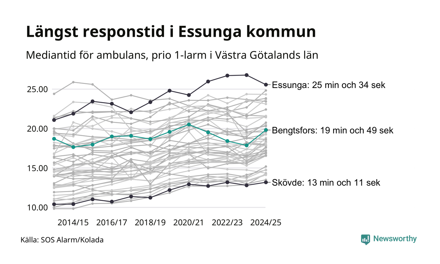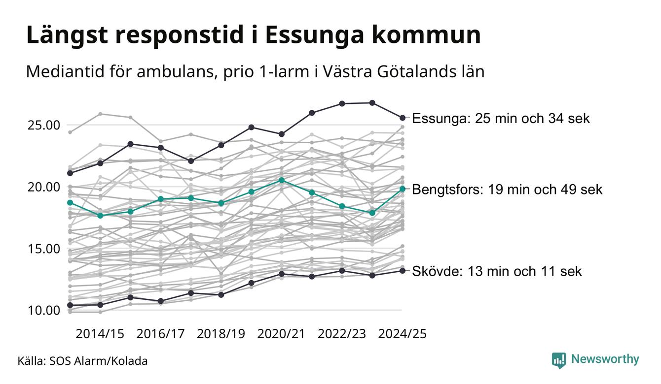 Essunga är alltså en av de kommuner som får vänta längst på ambulans i landet. Längst är väntan på ambulans i Pajala kommun, 37 minuter och 55 sekunder. Kommunerna med längst responstid finns i Norrlands inland eller i glesbygd.