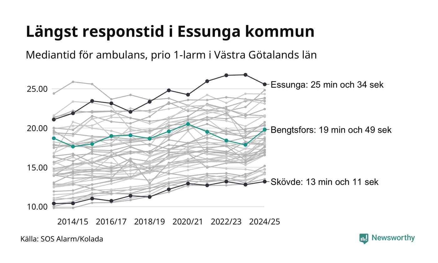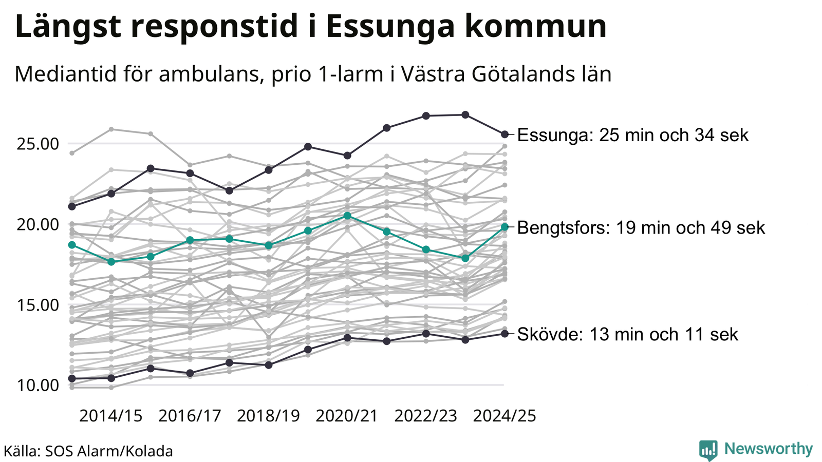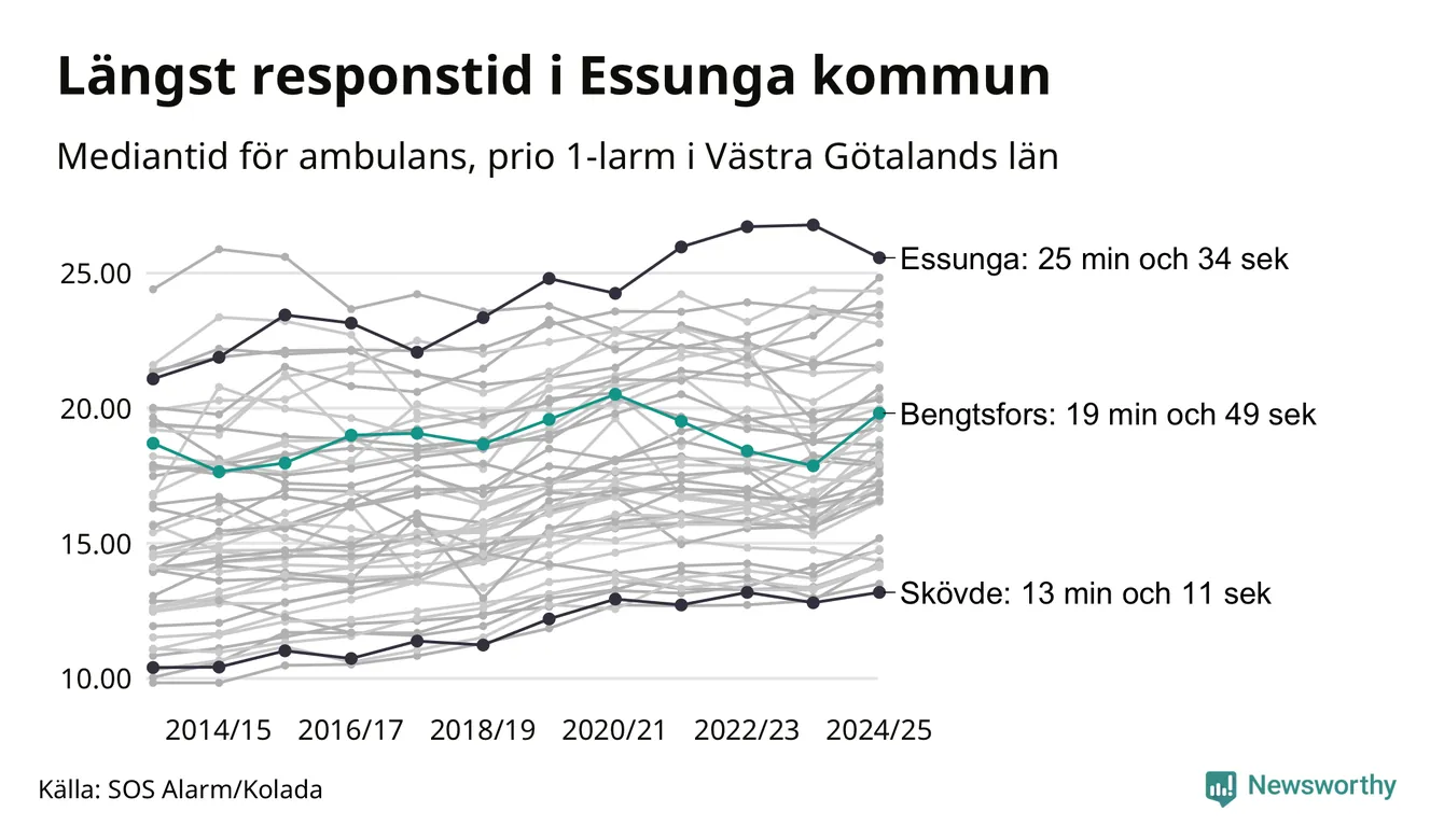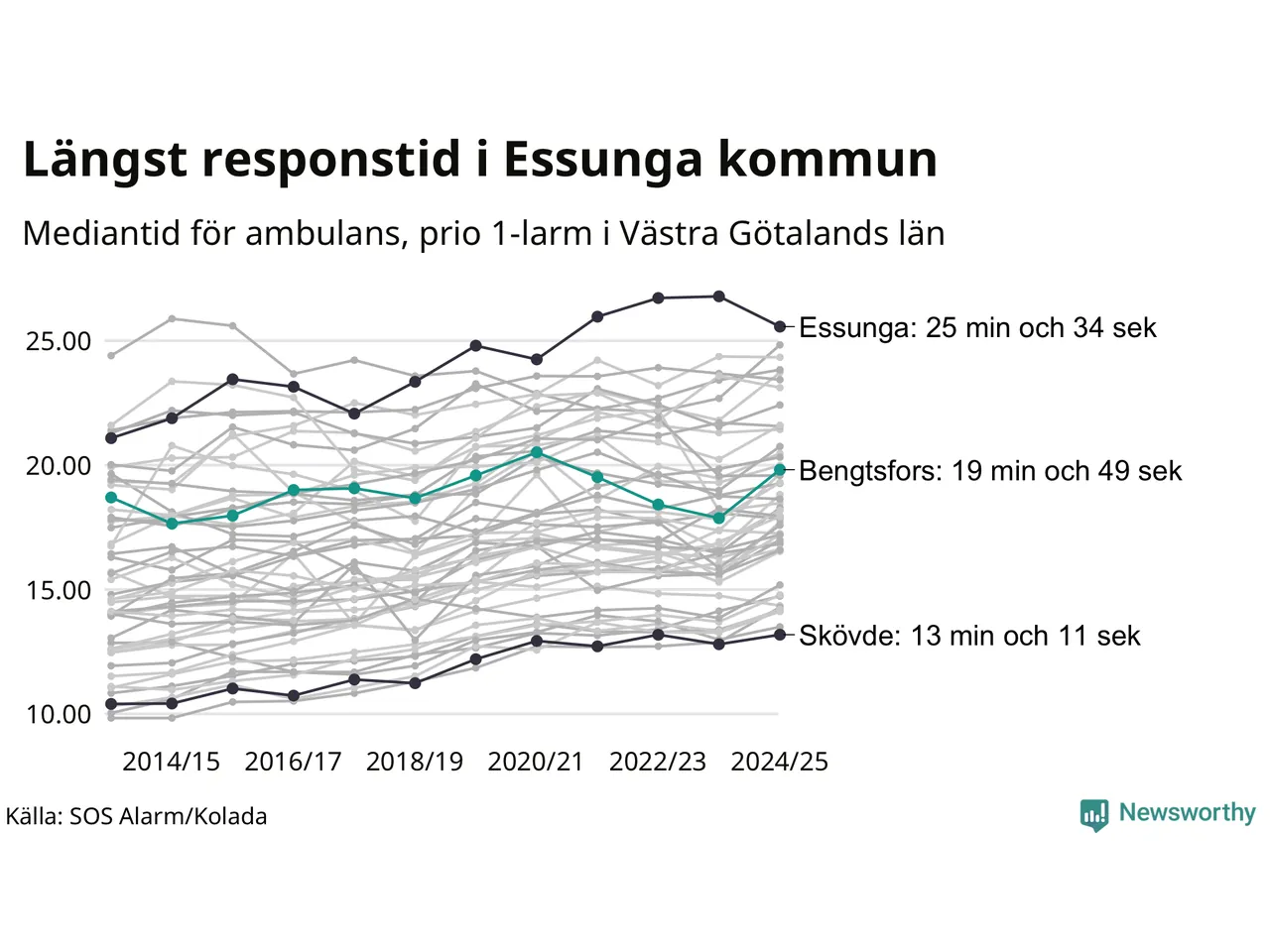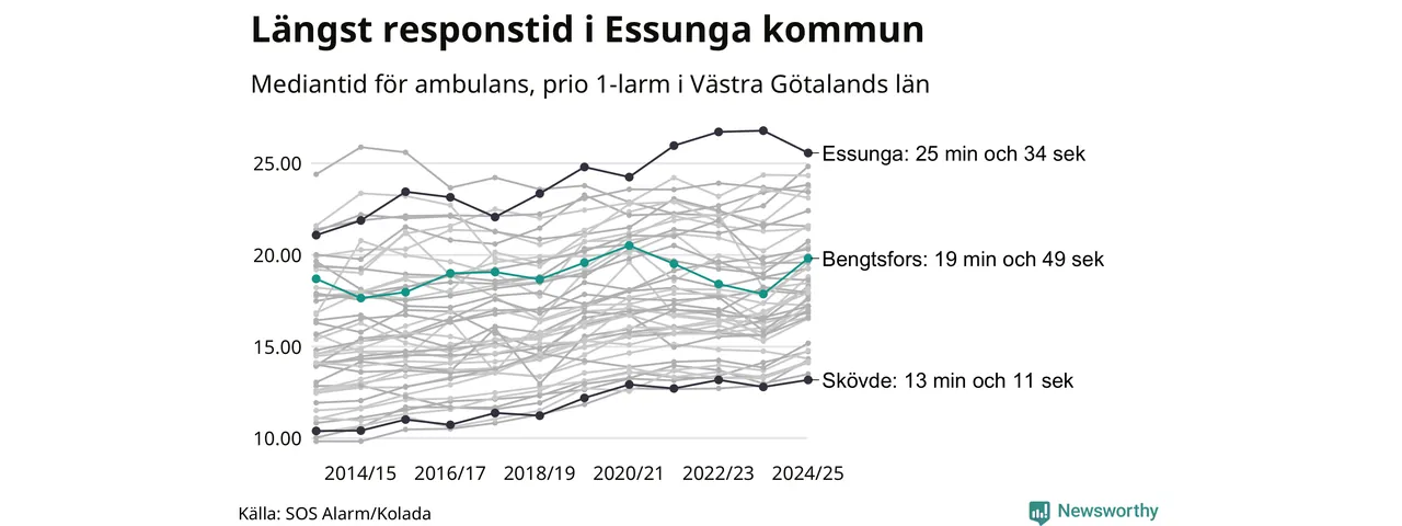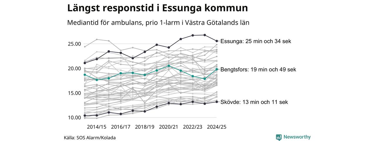 Bengtsfors tillhör inte de kommuner i Västra Götalandsregionen som får vänta längst på ambulans – men inte heller de som får snabbast hjälp. Längst är väntetiden i Essunga kommun, som också tillhör de tio kommuner i landet som får vänta längst på ambulans: 25 minuter och 34 sekunder. Snabbast var ambulansen framme i Skövde, där det tog 13 minuter och 11 sekunder från larmsamtalet 2024/2025.