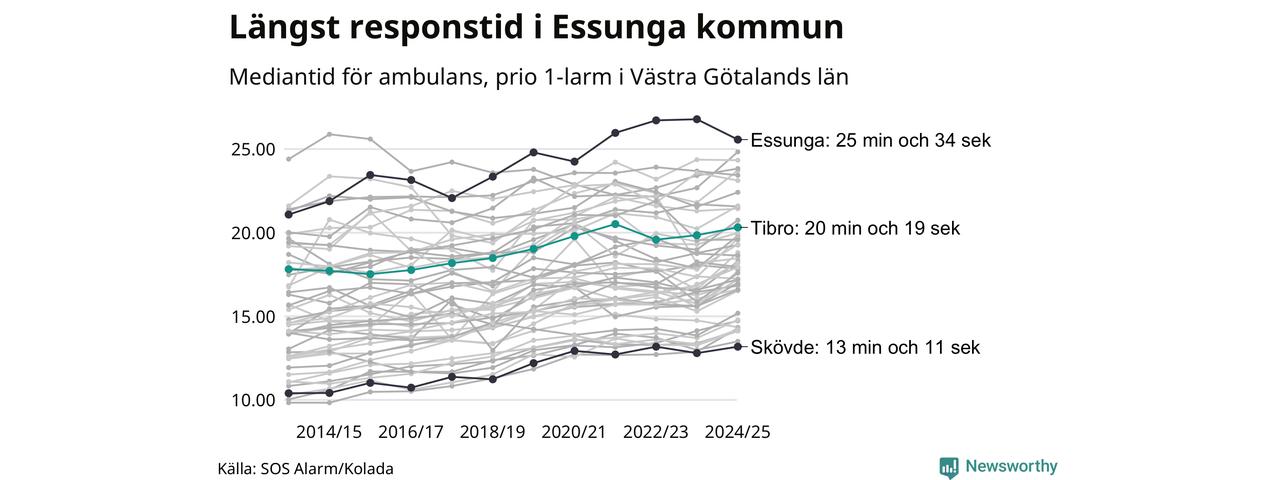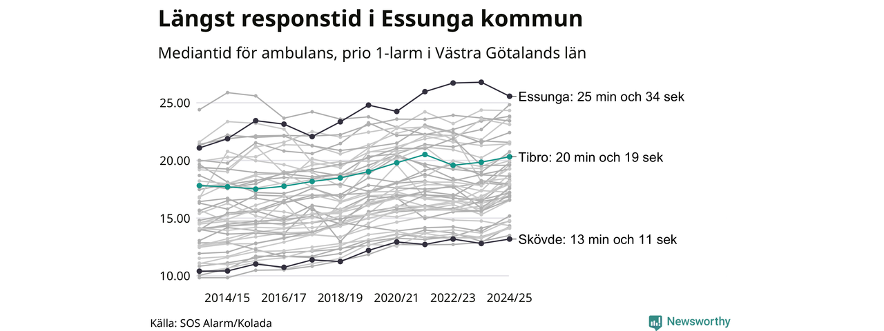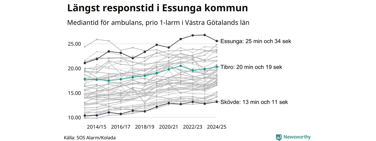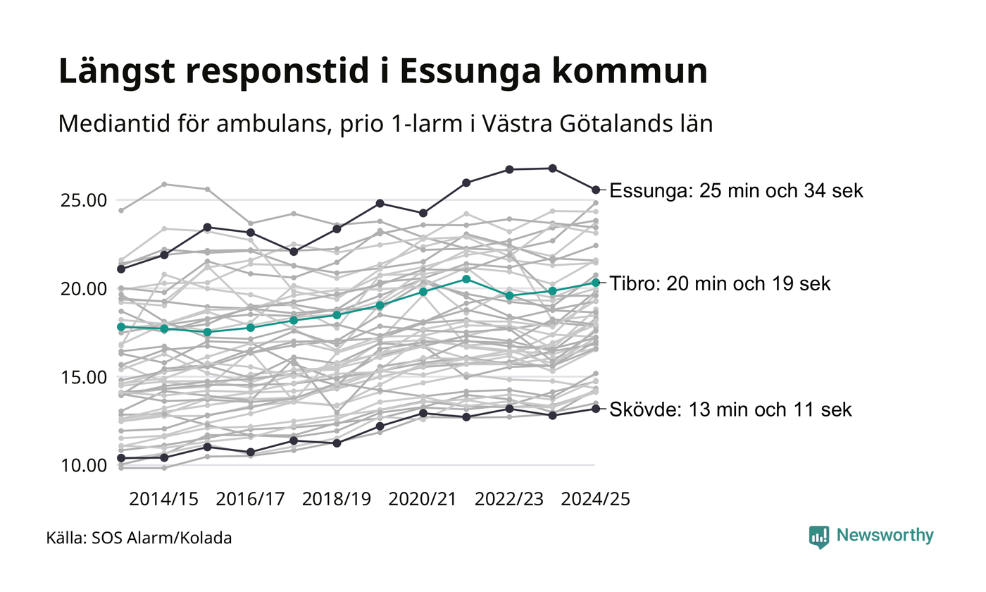 Det tar 20 minuter och 19 sekunder från att 112-samtalet når larmcentralen till att ambulansen är på plats i Tibro kommun. Det visar de senaste siffrorna från SOS Alarm. Tiden är en mediantid för alla prio 1-larm mellan 1 juni 2024 och 31 maj 2025 och ett nyckeltal som redovisas varje år.