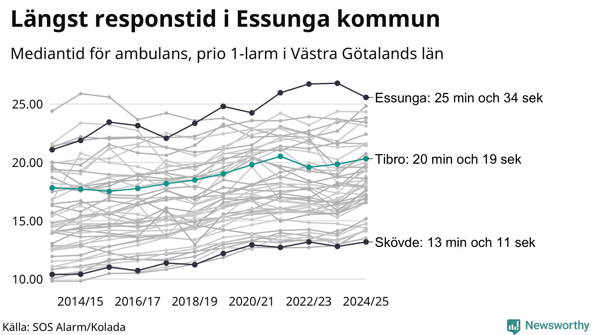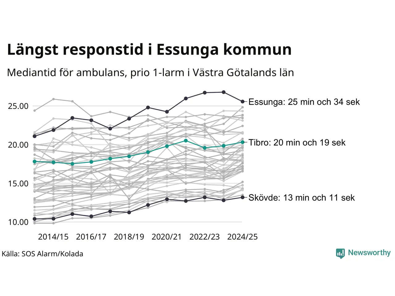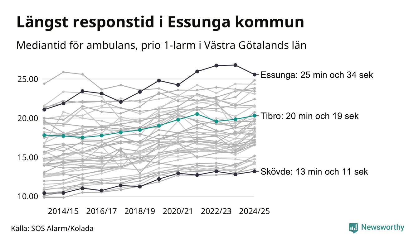 Det tar 20 minuter och 19 sekunder från att 112-samtalet når larmcentralen till att ambulansen är på plats i Tibro kommun. Det visar de senaste siffrorna från SOS Alarm. Tiden är en mediantid för alla prio 1-larm mellan 1 juni 2024 och 31 maj 2025 och ett nyckeltal som redovisas varje år.