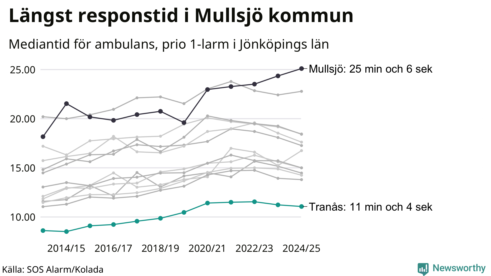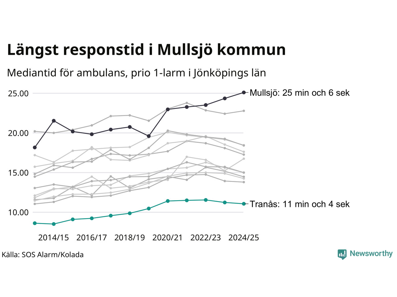 Det tar 11 minuter och 4 sekunder från att 112-samtalet når larmcentralen till att ambulansen är på plats i Tranås kommun. Det visar de senaste siffrorna från SOS Alarm. Tiden är en mediantid för alla prio 1-larm mellan 1 juni 2024 och 31 maj 2025 och ett nyckeltal som redovisas varje år.