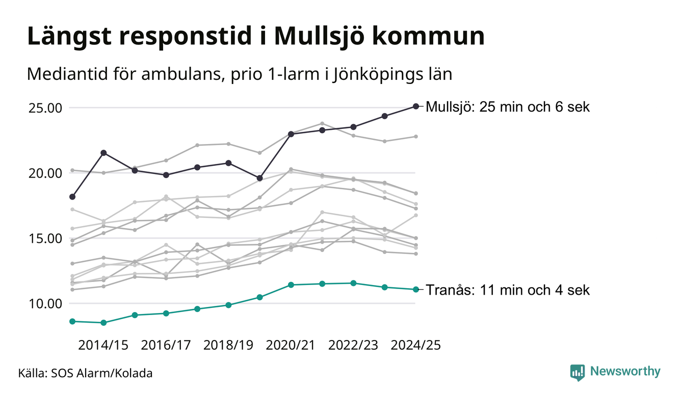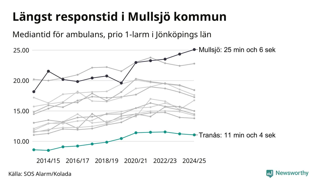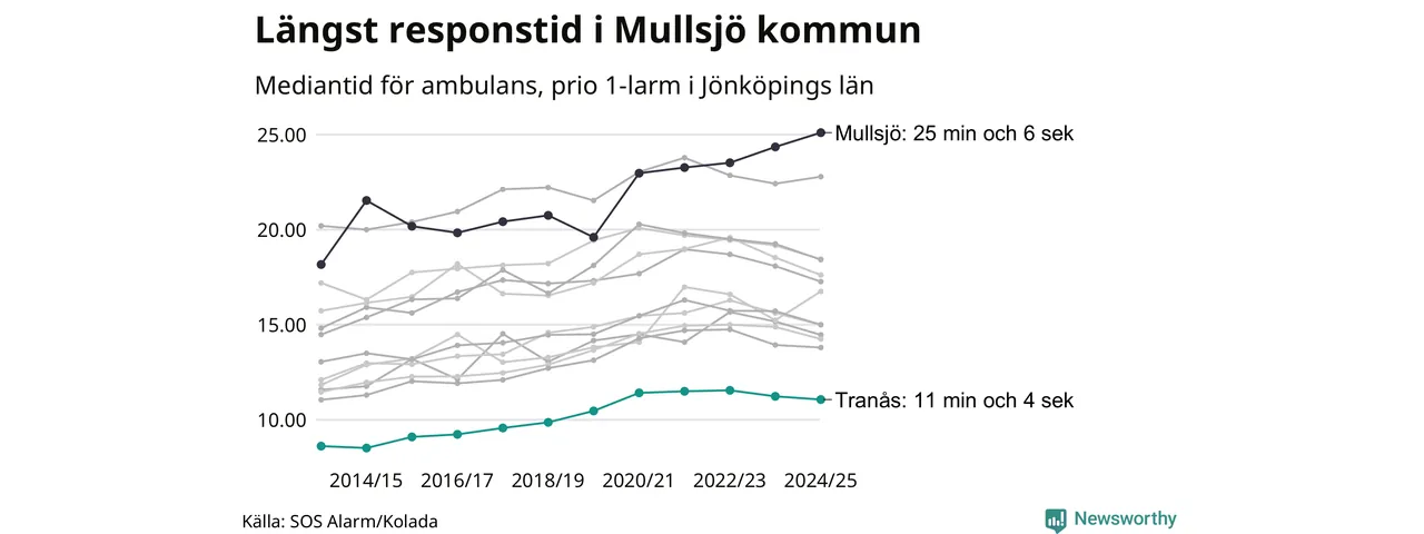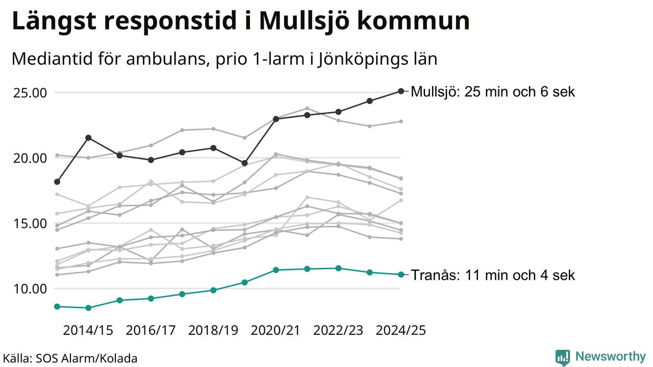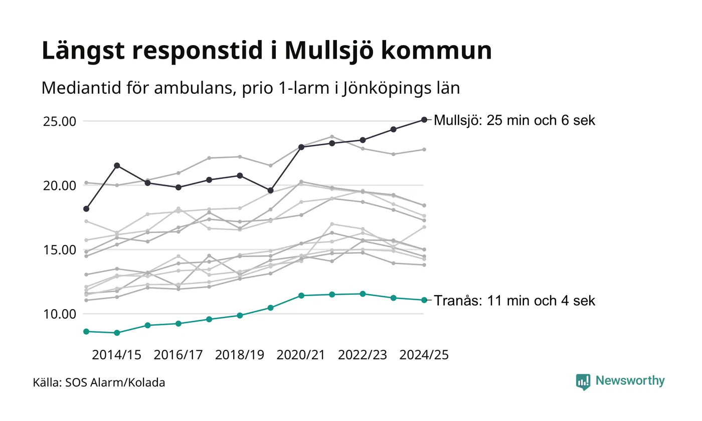 Bland kommunerna i Region Jönköping nåddes Tranås snabbast av ambulans under 2024/2025. Längst är väntetiden i Mullsjö kommun, som också tillhör de tio kommuner i landet som får vänta längst på ambulans: 25 minuter och 6 sekunder.