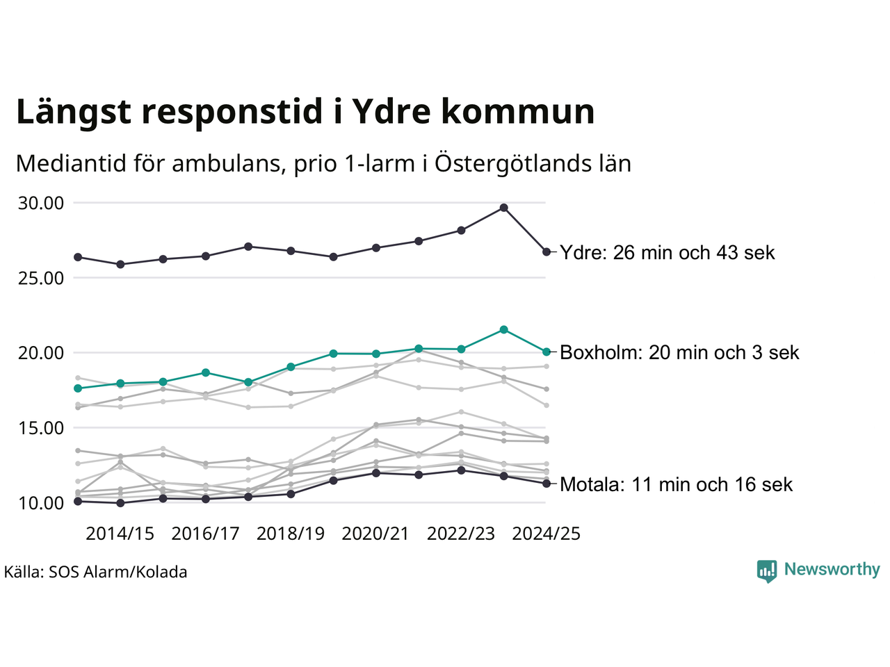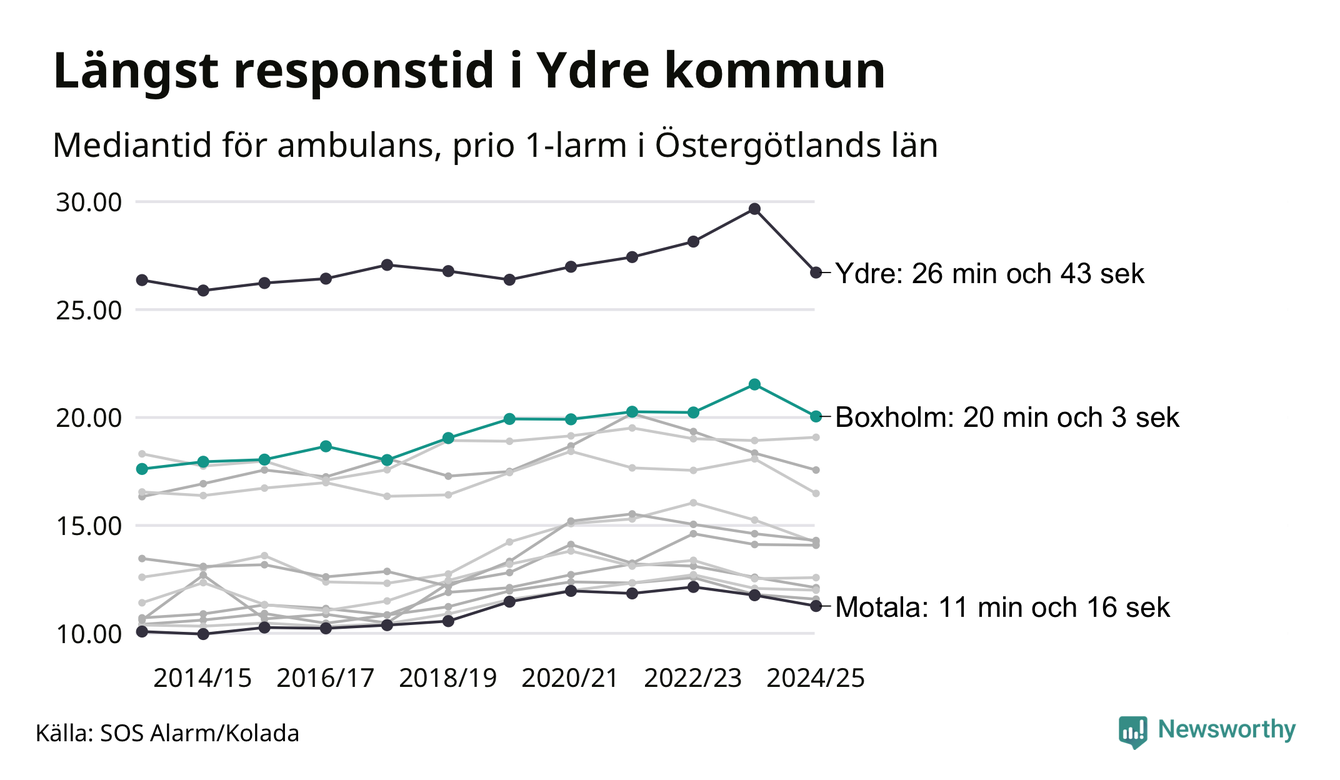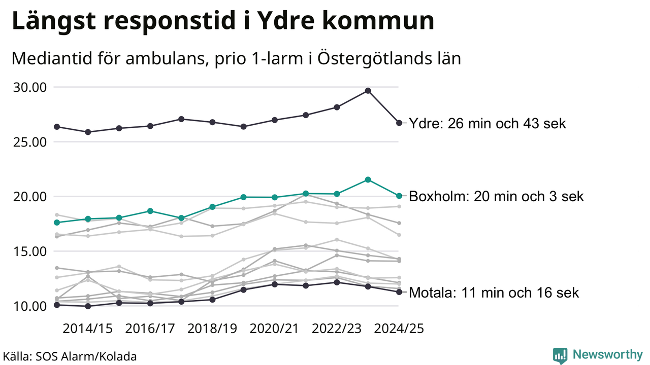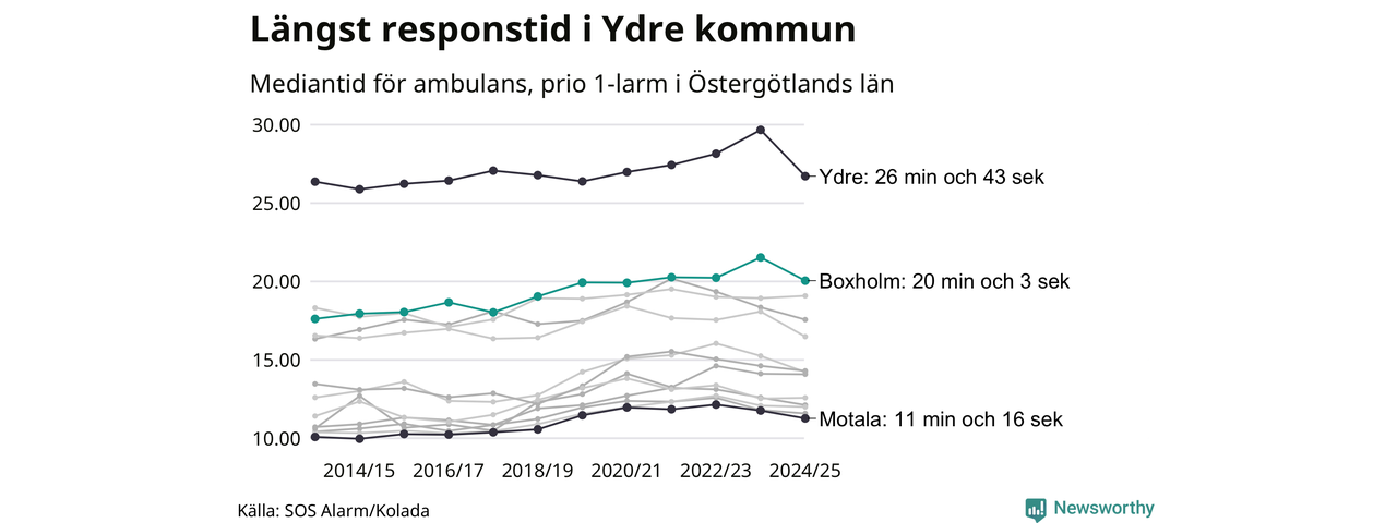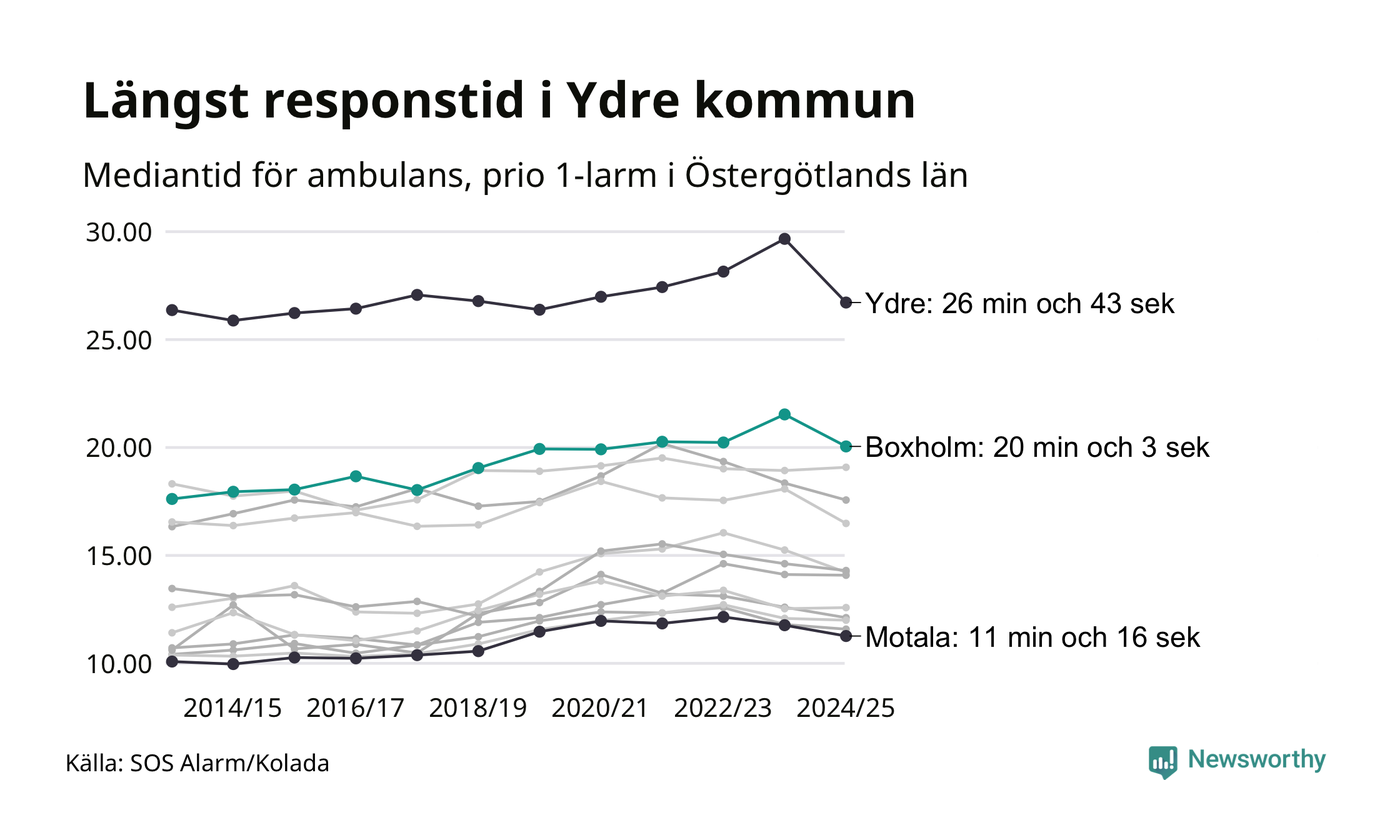Det tar 20 minuter och 3 sekunder från att 112-samtalet når larmcentralen till att ambulansen är på plats i Boxholms kommun. Det visar de senaste siffrorna från SOS Alarm. Tiden är en mediantid för alla prio 1-larm mellan 1 juni 2024 och 31 maj 2025 och ett nyckeltal som redovisas varje år.