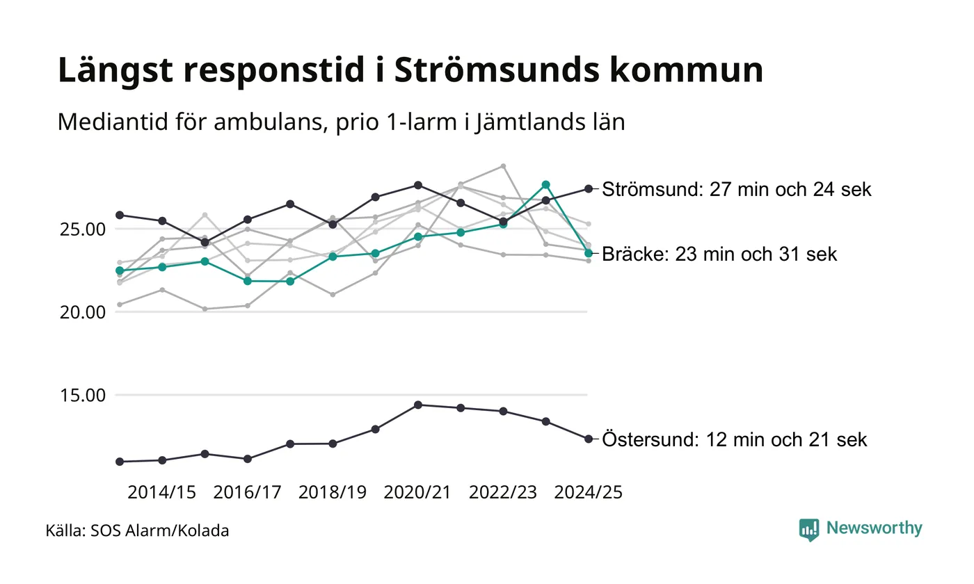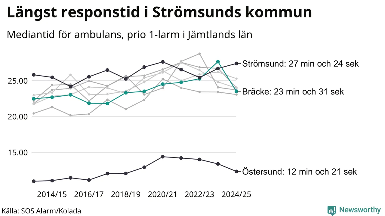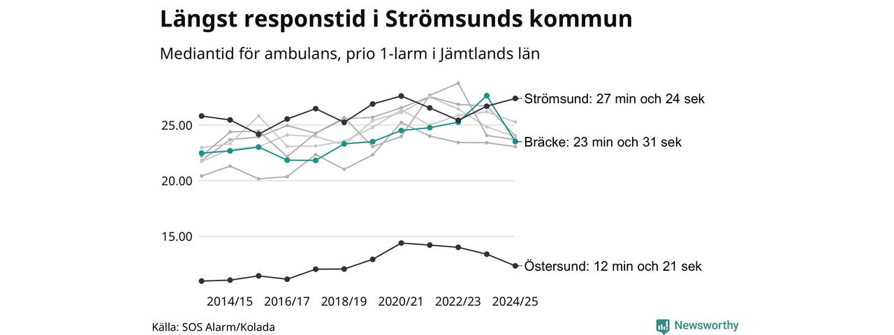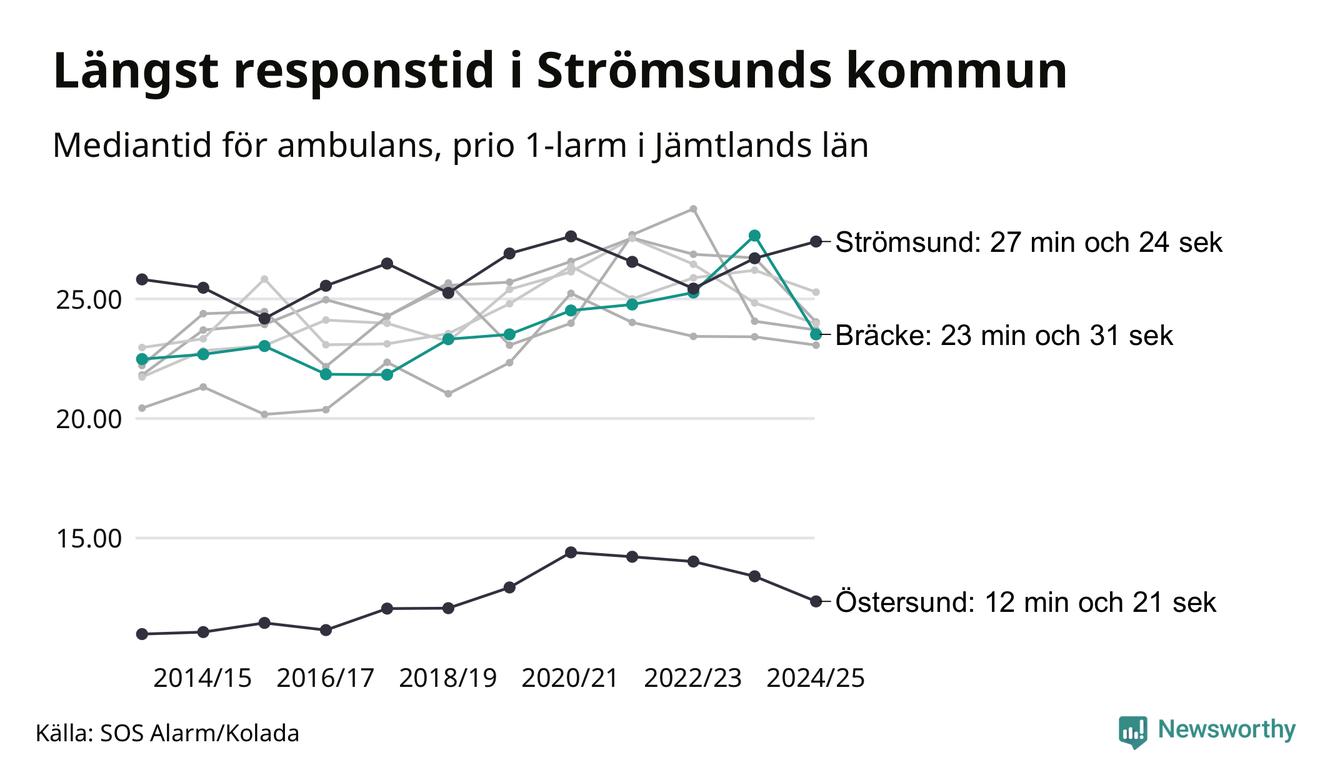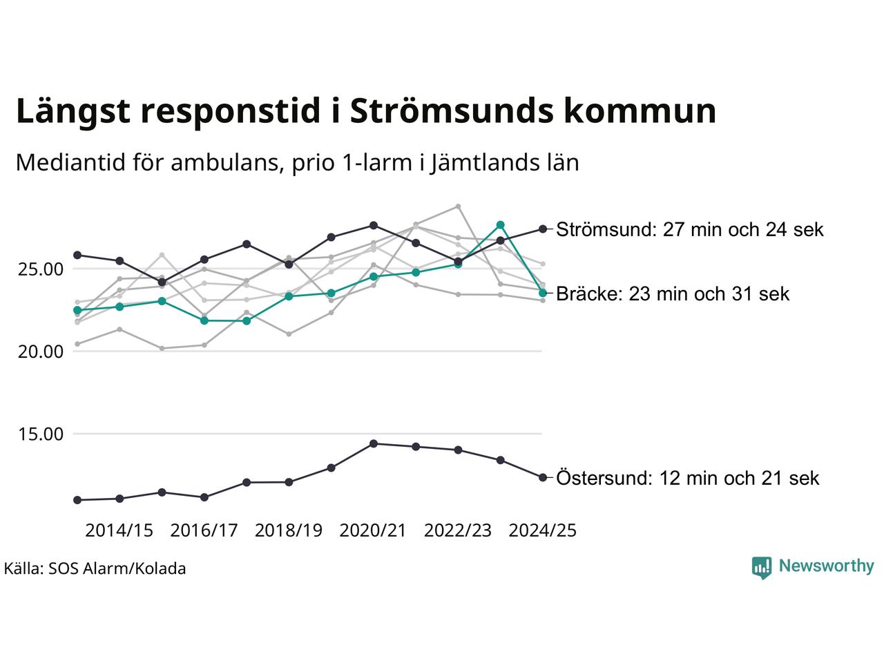 Det tar 23 minuter och 31 sekunder från att 112-samtalet når larmcentralen till att ambulansen är på plats i Bräcke kommun. Det visar de senaste siffrorna från SOS Alarm. Tiden är en mediantid för alla prio 1-larm mellan 1 juni 2024 och 31 maj 2025 och ett nyckeltal som redovisas varje år.