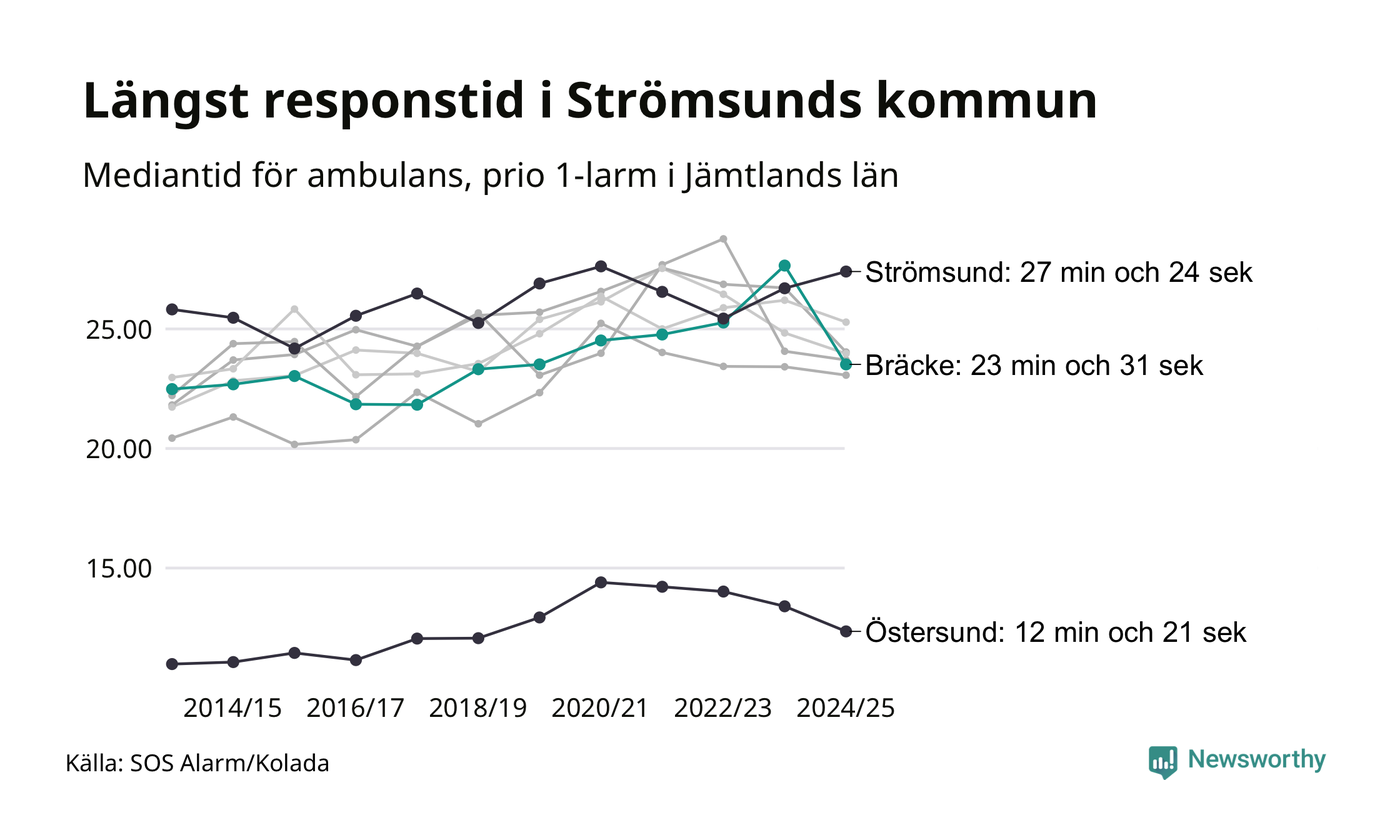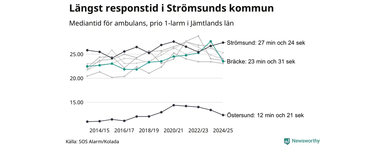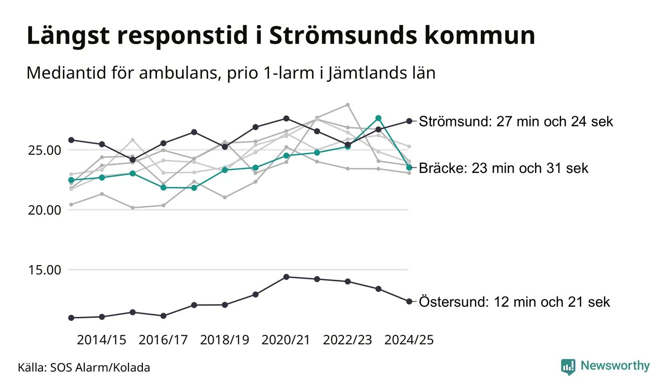 Bräcke tillhör inte de kommuner i Region Jämtland Härjedalen som får vänta längst på ambulans – men inte heller de som får snabbast hjälp. Längst är väntetiden i Strömsunds kommun, som också tillhör de tio kommuner i landet som får vänta längst på ambulans: 27 minuter och 24 sekunder. Snabbast var ambulansen framme i Östersund, där det tog 12 minuter och 21 sekunder från larmsamtalet 2024/2025.