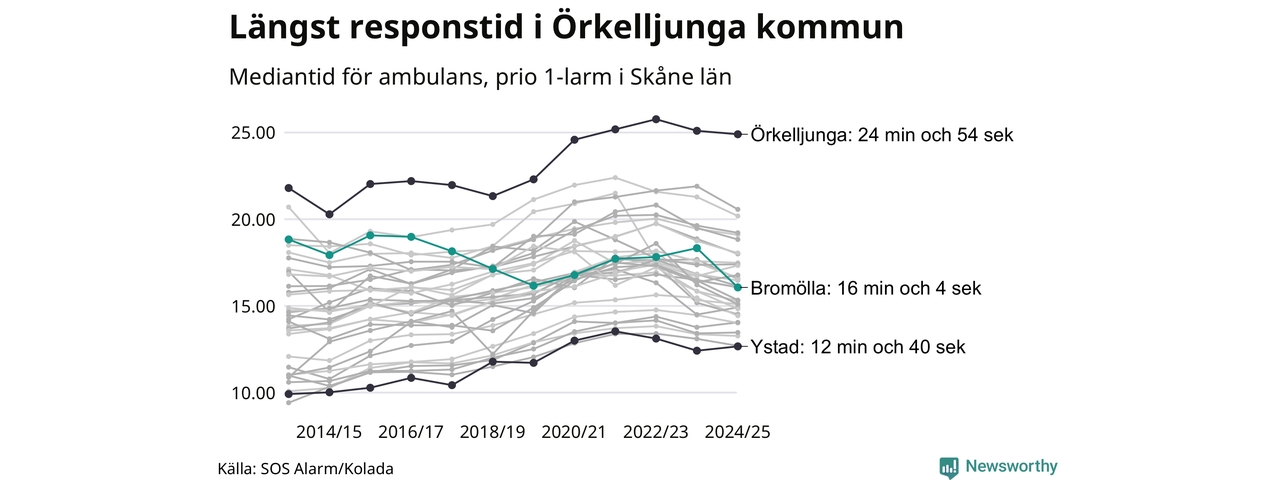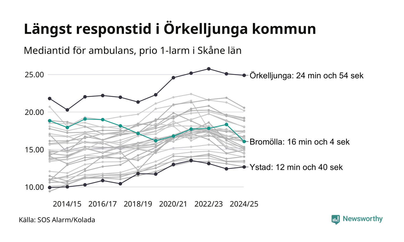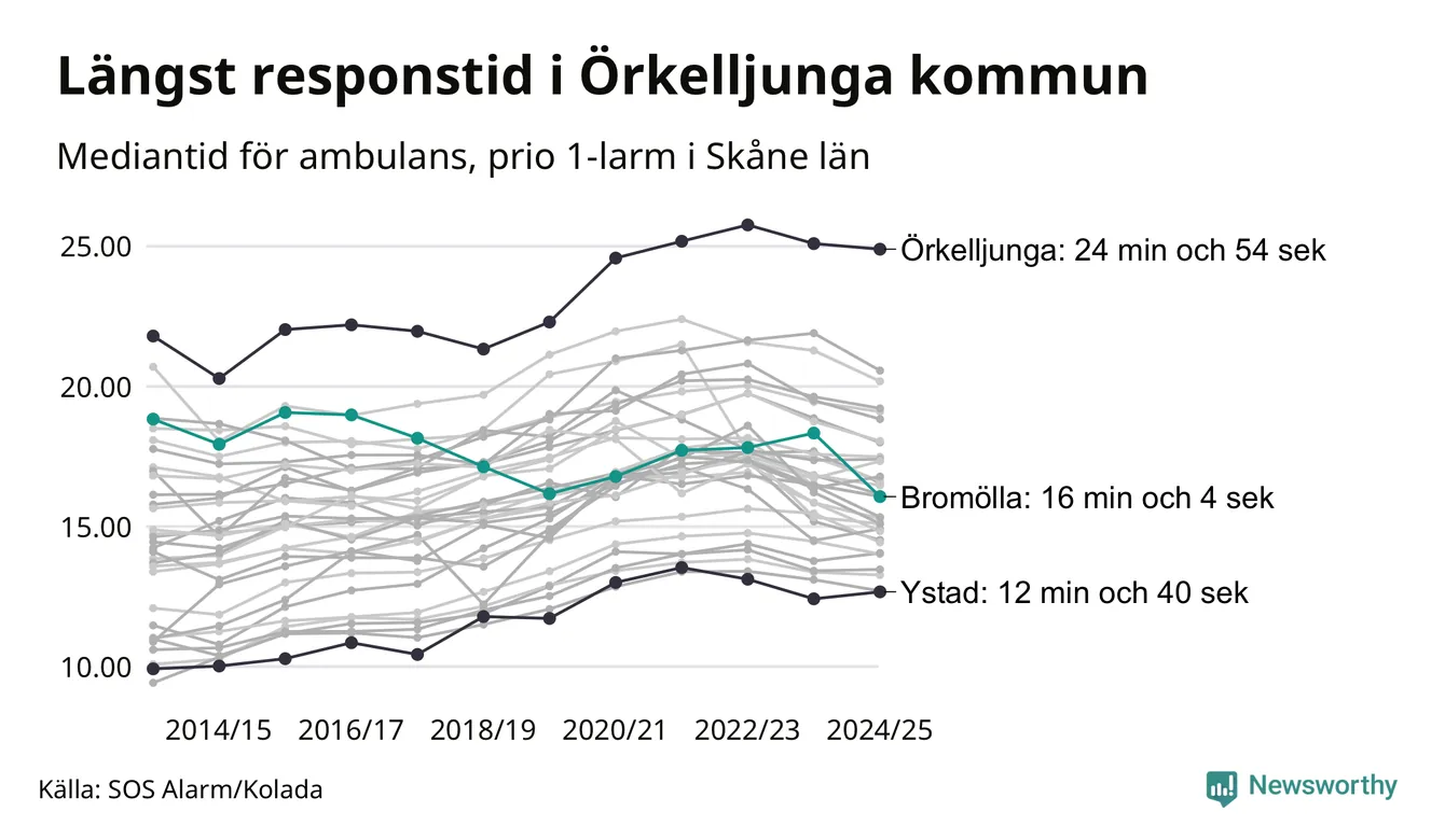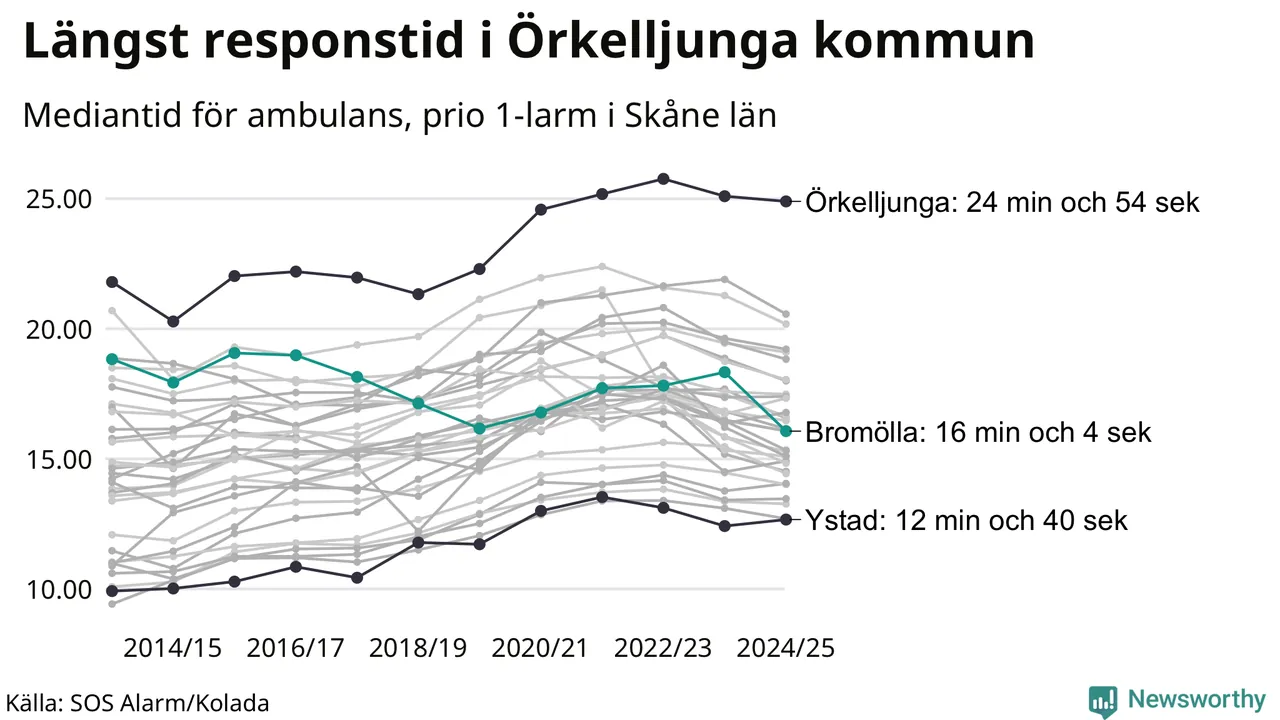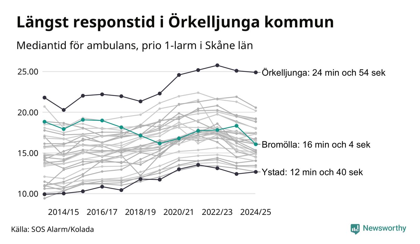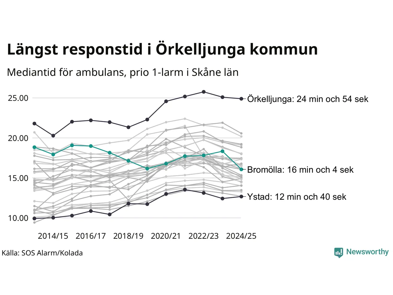 Det tar 16 minuter och 4 sekunder från att 112-samtalet når larmcentralen till att ambulansen är på plats i Bromölla kommun. Det visar de senaste siffrorna från SOS Alarm. Tiden är en mediantid för alla prio 1-larm mellan 1 juni 2024 och 31 maj 2025 och ett nyckeltal som redovisas varje år.