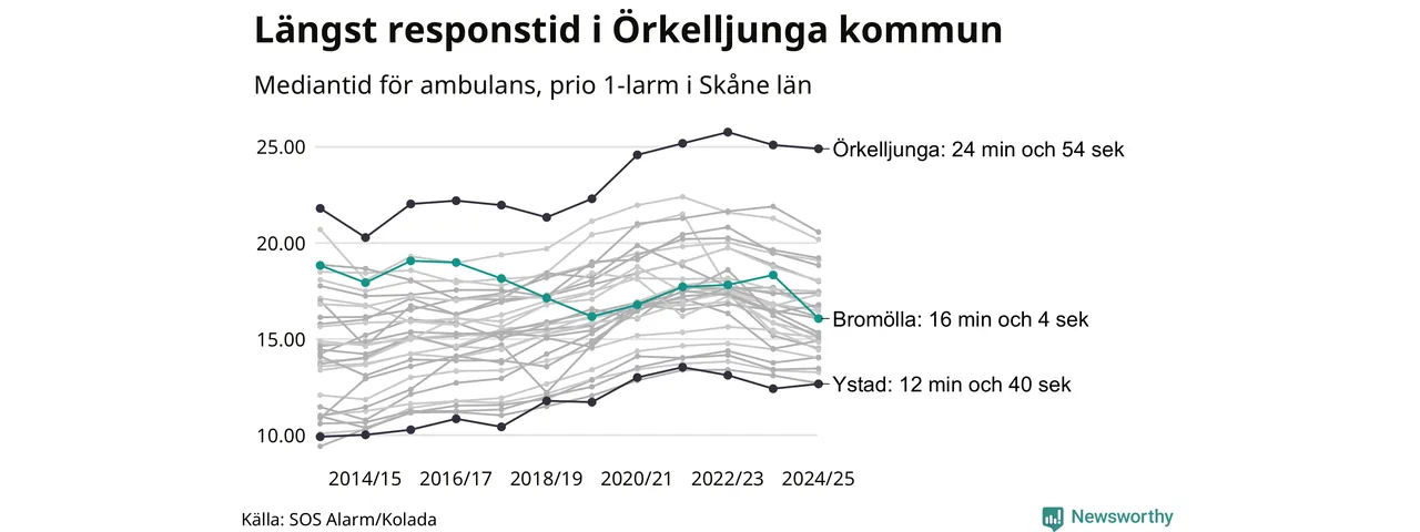 Bromölla tillhör inte de kommuner i Region Skåne som får vänta längst på ambulans – men inte heller de som får snabbast hjälp. Längst är väntetiden i Örkelljunga kommun: 24 minuter och 54 sekunder. Snabbast var ambulansen framme i Ystad, där det tog 12 minuter och 40 sekunder från larmsamtalet 2024/2025.