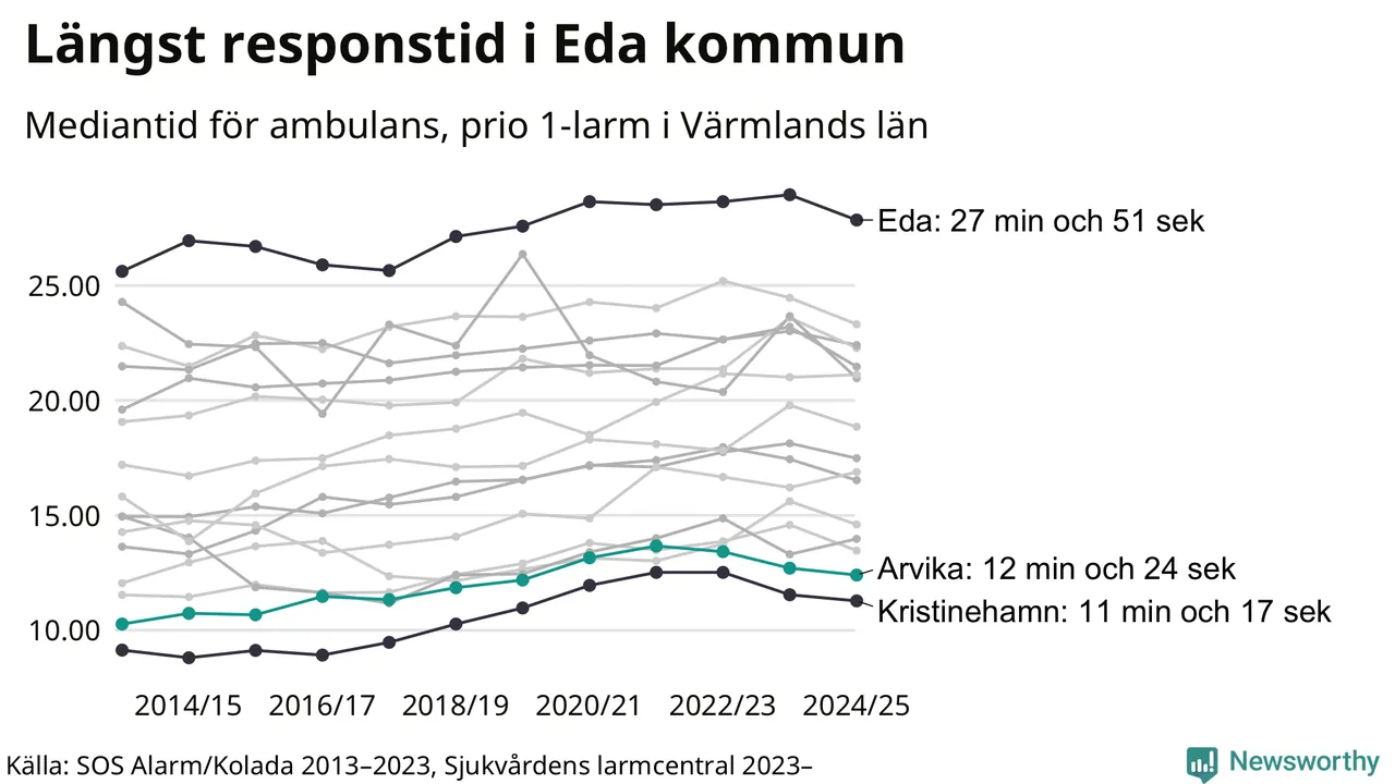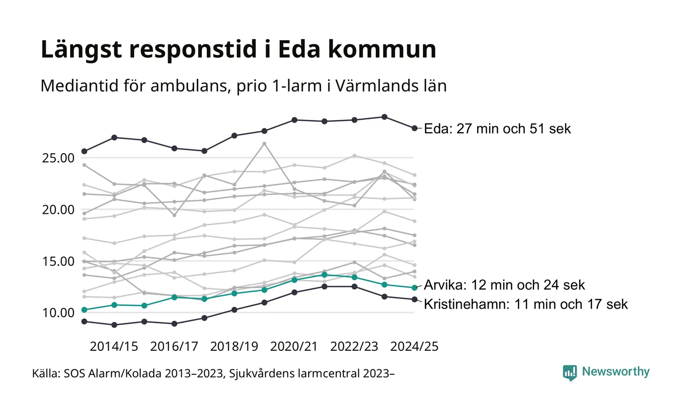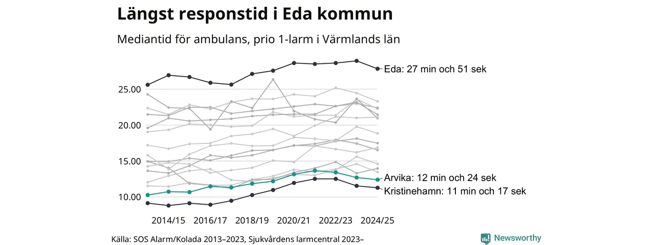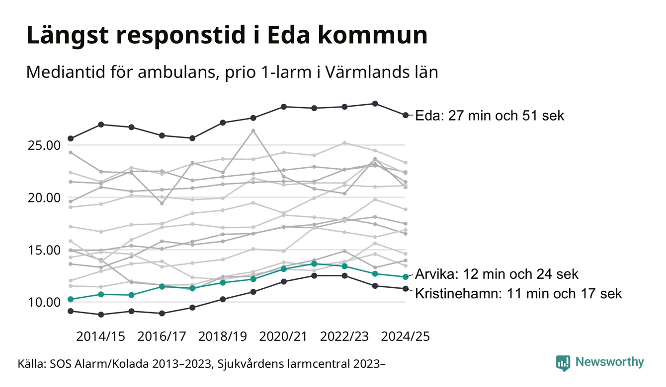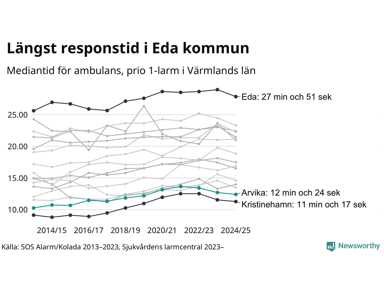 Bland kommunerna i Region Värmland nåddes Arvika näst snabbast av ambulans under 2024/2025. Bara i Kristinehamn kommer ambulansen snabbare. Längst är väntetiden i Eda kommun, som också tillhör de tio kommuner i landet som får vänta längst på ambulans: 27 minuter och 51 sekunder. Där har väntetiden ändå kapats med 1 minut och 6 sekunder jämfört med året innan.
