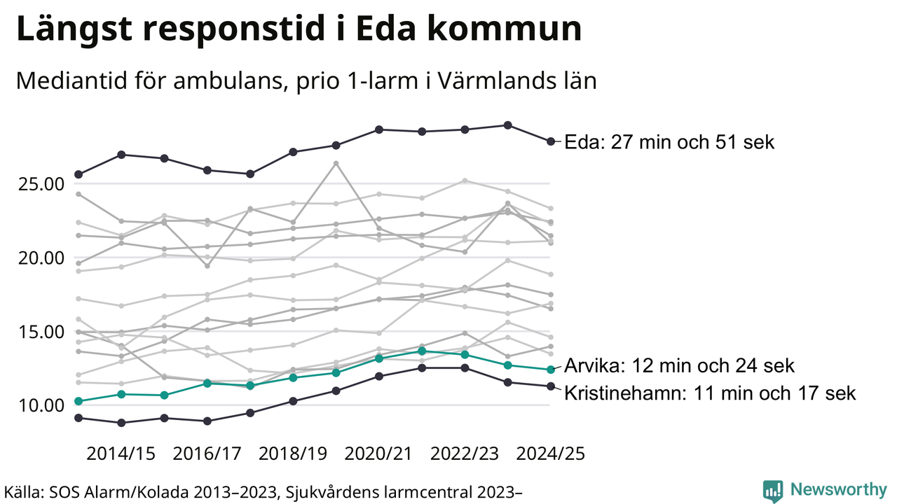Eda är alltså en av de kommuner som får vänta längst på ambulans i landet. Längst är väntan på ambulans i Pajala kommun, 37 minuter och 55 sekunder. Kommunerna med längst responstid finns i Norrlands inland eller i glesbygd.