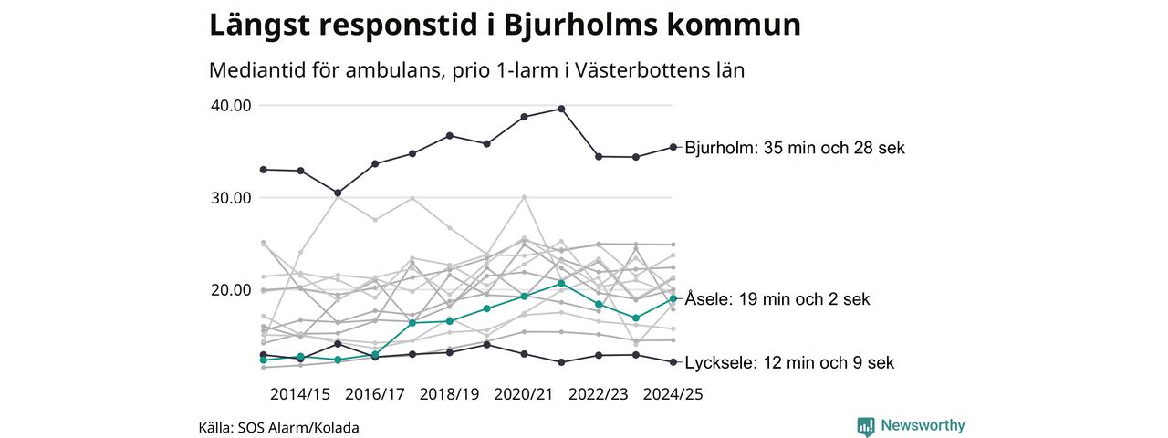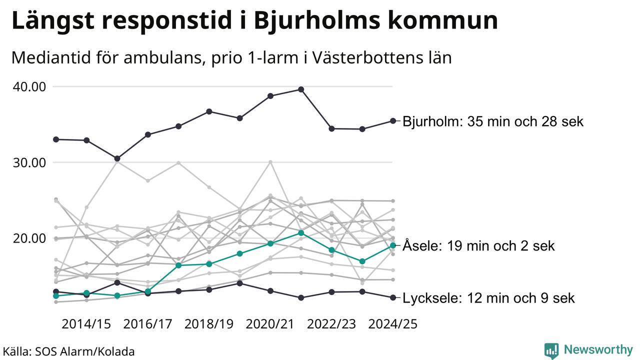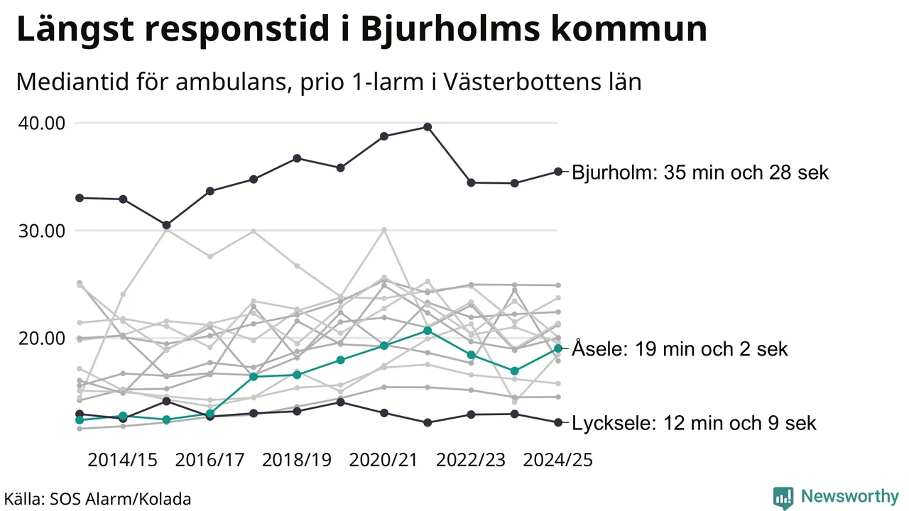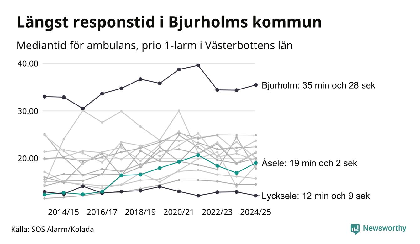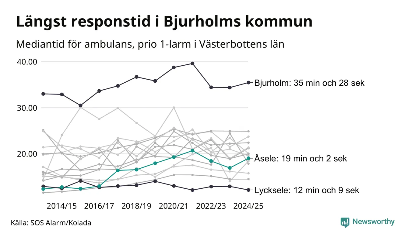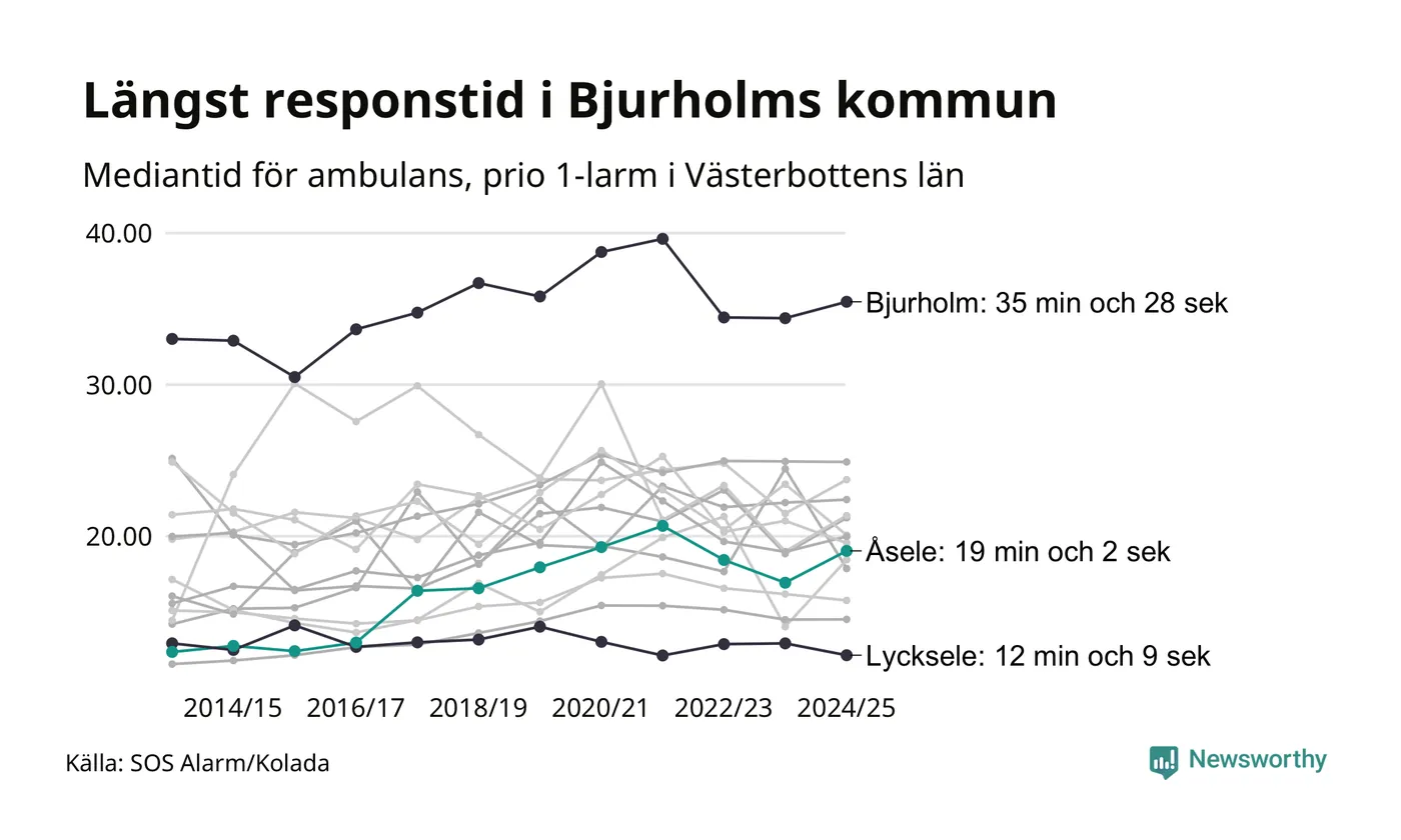 Det tar 19 minuter och 2 sekunder från att 112-samtalet når larmcentralen till att ambulansen är på plats i Åsele kommun. Det visar de senaste siffrorna från SOS Alarm. Tiden är en mediantid för alla prio 1-larm mellan 1 juni 2024 och 31 maj 2025 och ett nyckeltal som redovisas varje år.
