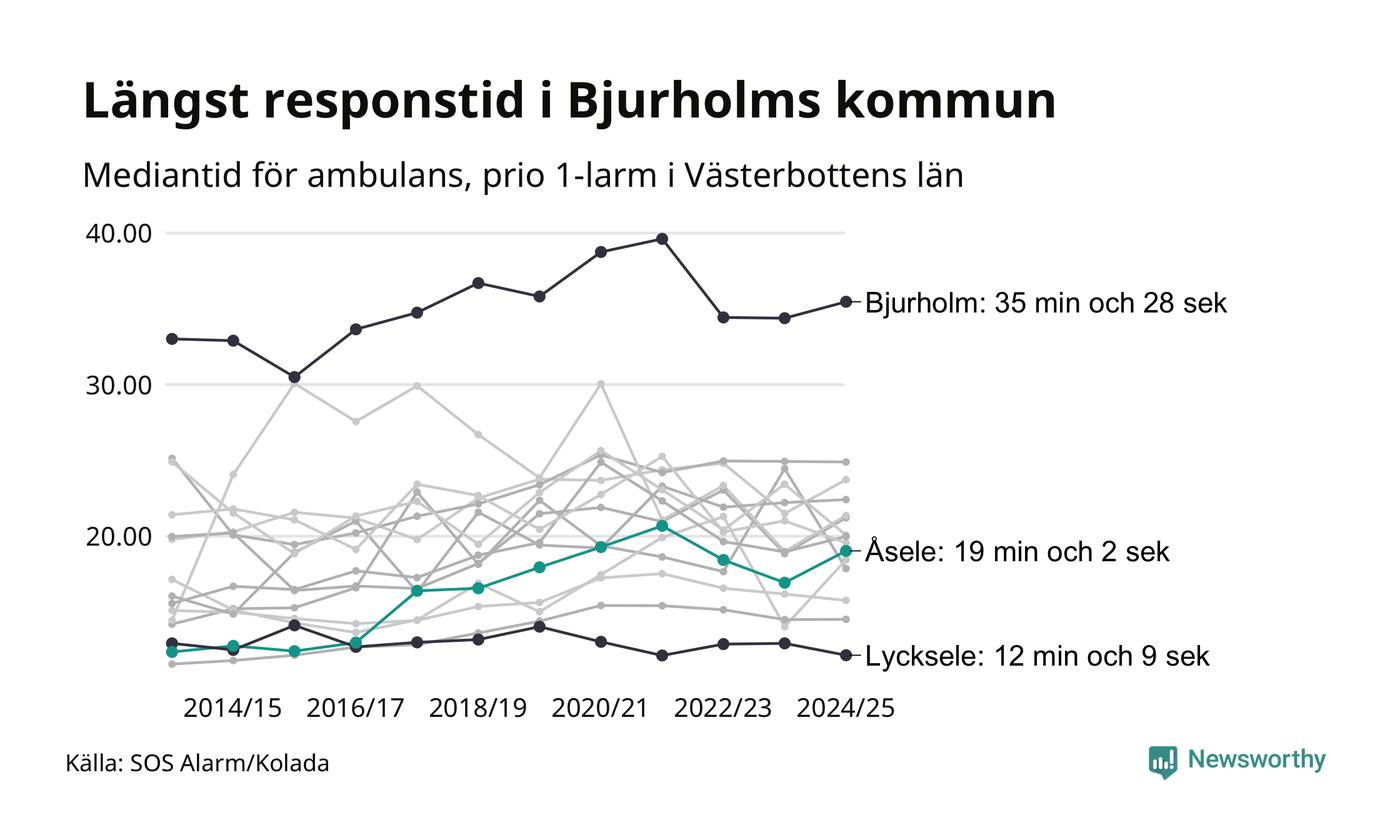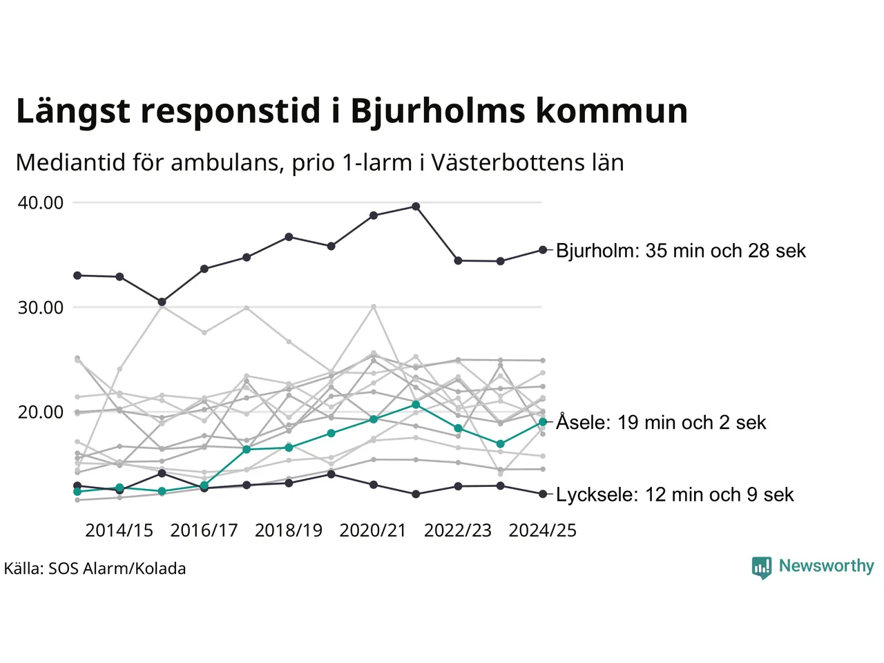 Bjurholm är alltså en av de kommuner som får vänta längst på ambulans i landet. Längst är väntan på ambulans i Pajala kommun, 37 minuter och 55 sekunder. Kommunerna med längst responstid finns i Norrlands inland eller i glesbygd.