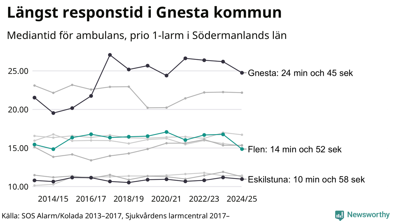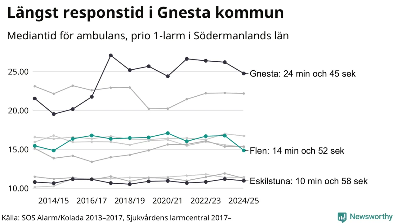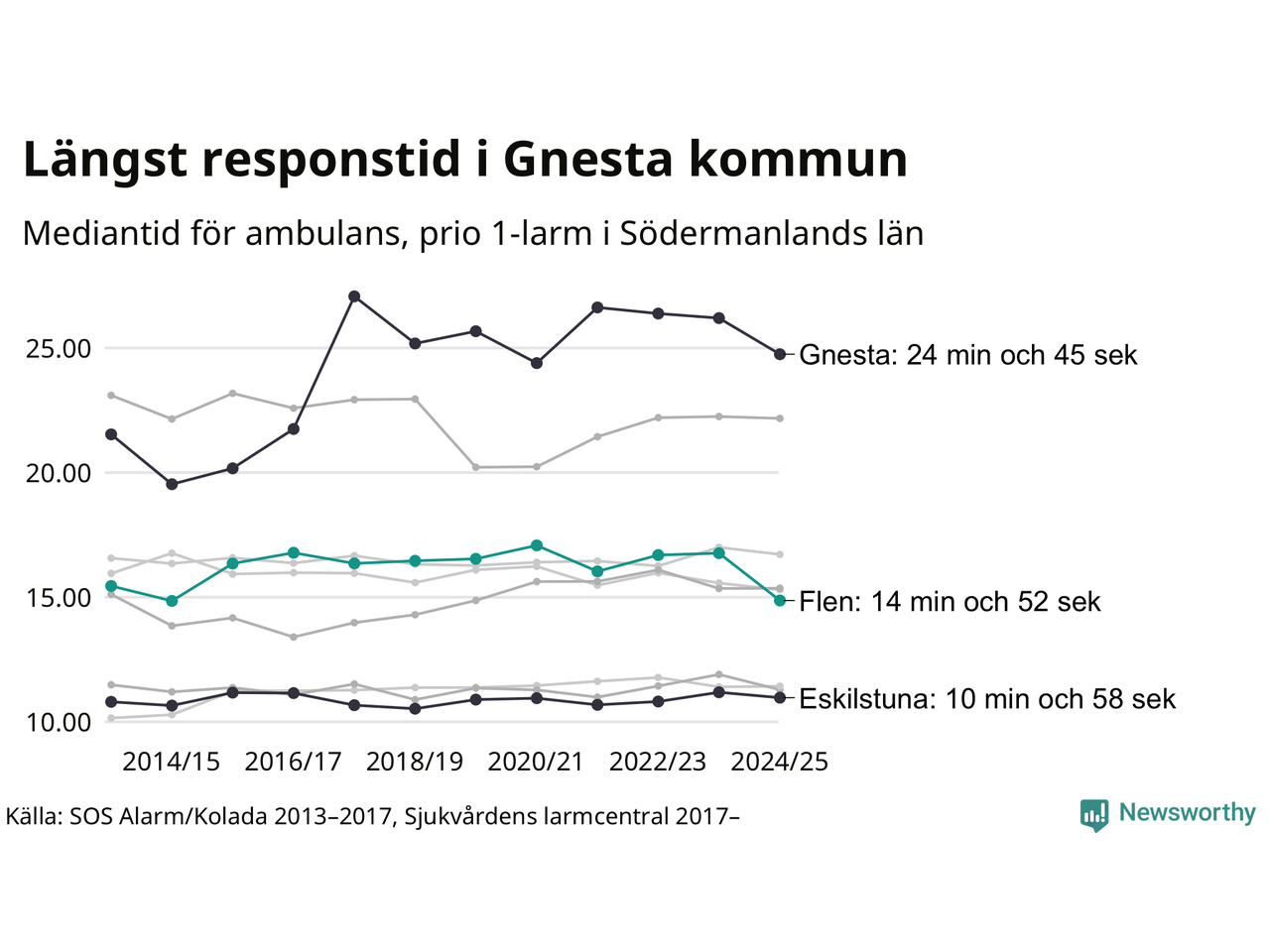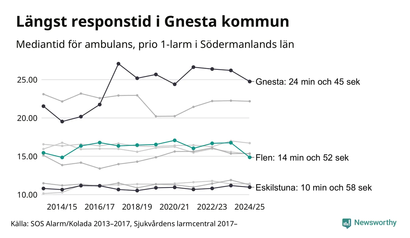 Det tar 14 minuter och 52 sekunder från att 112-samtalet når larmcentralen till att ambulansen är på plats i Flens kommun. Det visar de senaste siffrorna från Sjukvårdens larmcentral. Tiden är en mediantid för alla prio 1-larm mellan 1 juni 2024 och 31 maj 2025 och ett nyckeltal som redovisas varje år.
