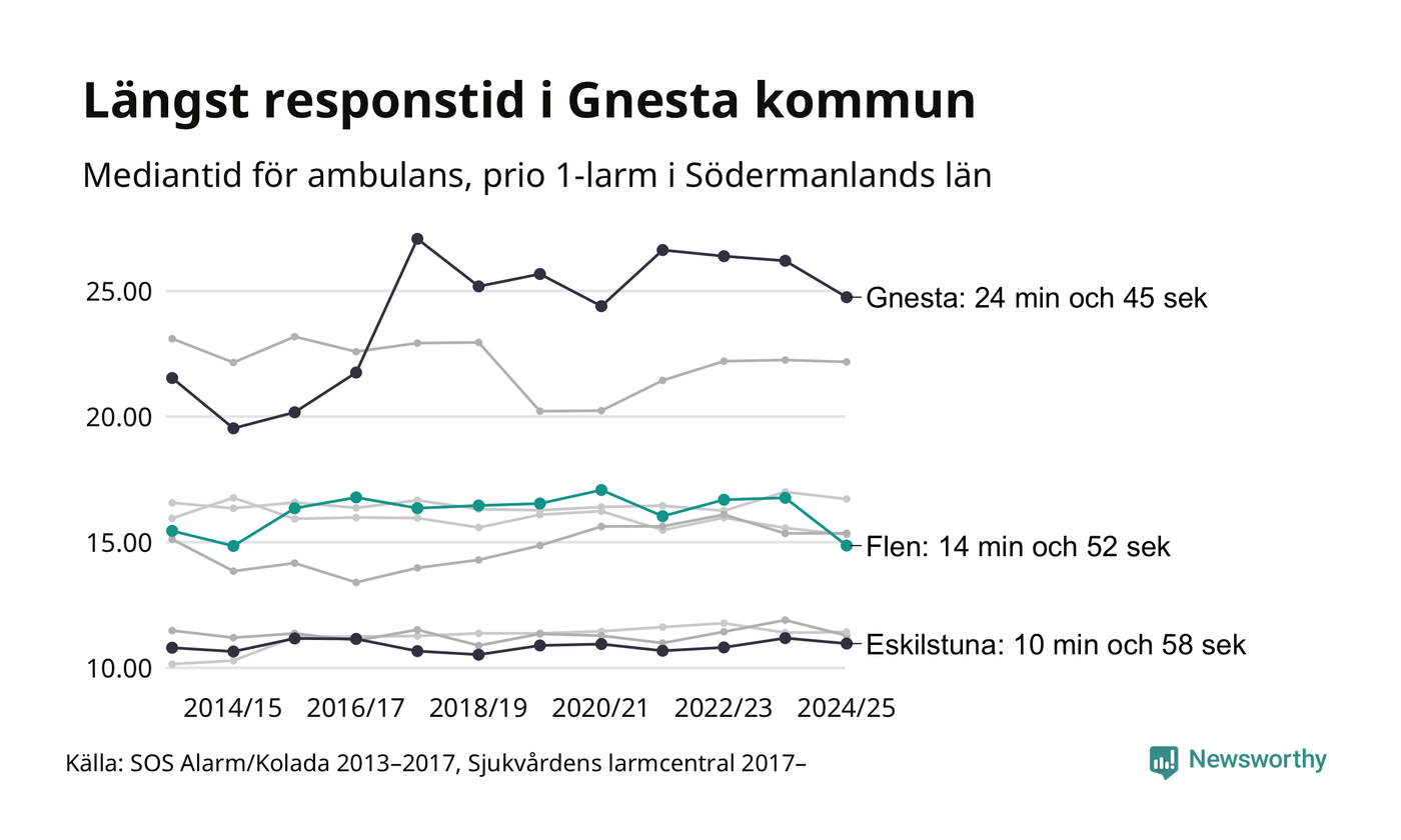 Sedan början av 2010-talet har responstiden generellt blivit längre i landet. Jämför man snittet för åren 2014–2016 med de tre senaste åren har väntan blivit mer än en minut längre i 214 av 290 kommuner. I Flens kommun har förändringen inte varit så dramatisk. Här har responstiden ökat med runt 30 sekunder jämfört med början av perioden.I Region Sörmland tog Sjukvårdens larmcentral över larmcentralen 2017 och vi jämför alltså siffror från två olika källor.