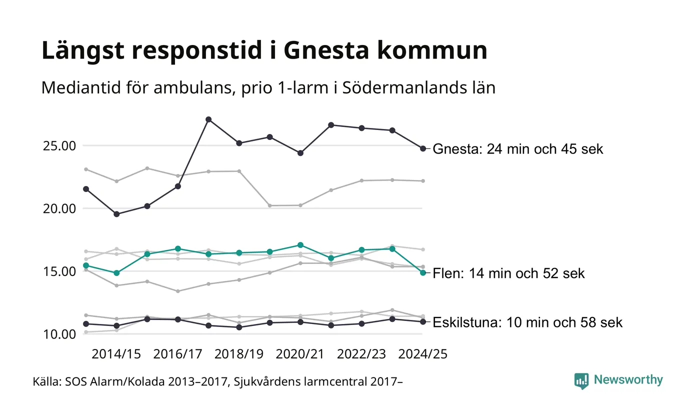 Även om väntan i Gnesta är lång för att vara Region Sörmland krävs ytterligare 21 sekunder för att ta sig in på topp tiolistan över kommuerna i landet med längst väntetid. Längst är väntan på ambulans i Pajala kommun, 37 minuter och 55 sekunder. Kommunerna med längst responstid finns i Norrlands inland eller i glesbygd.
