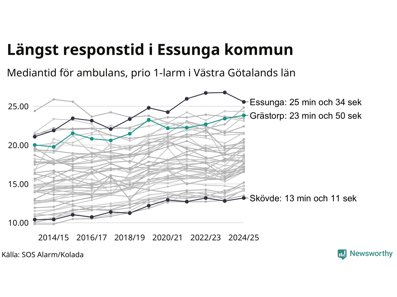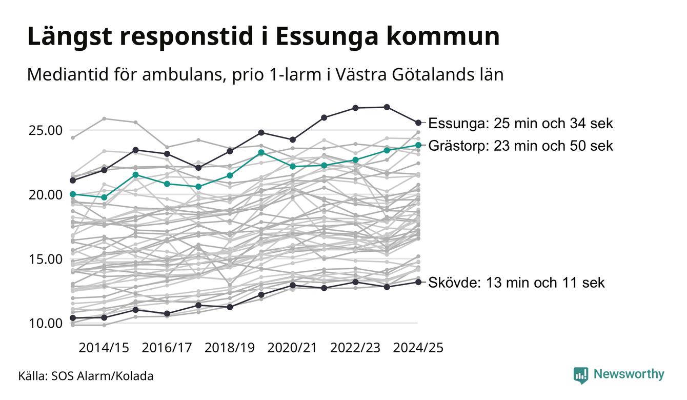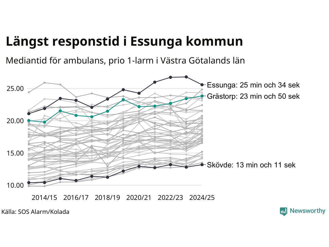 Det tar 23 minuter och 50 sekunder från att 112-samtalet når larmcentralen till att ambulansen är på plats i Grästorps kommun. Det visar de senaste siffrorna från SOS Alarm. Tiden är en mediantid för alla prio 1-larm mellan 1 juni 2024 och 31 maj 2025 och ett nyckeltal som redovisas varje år.
