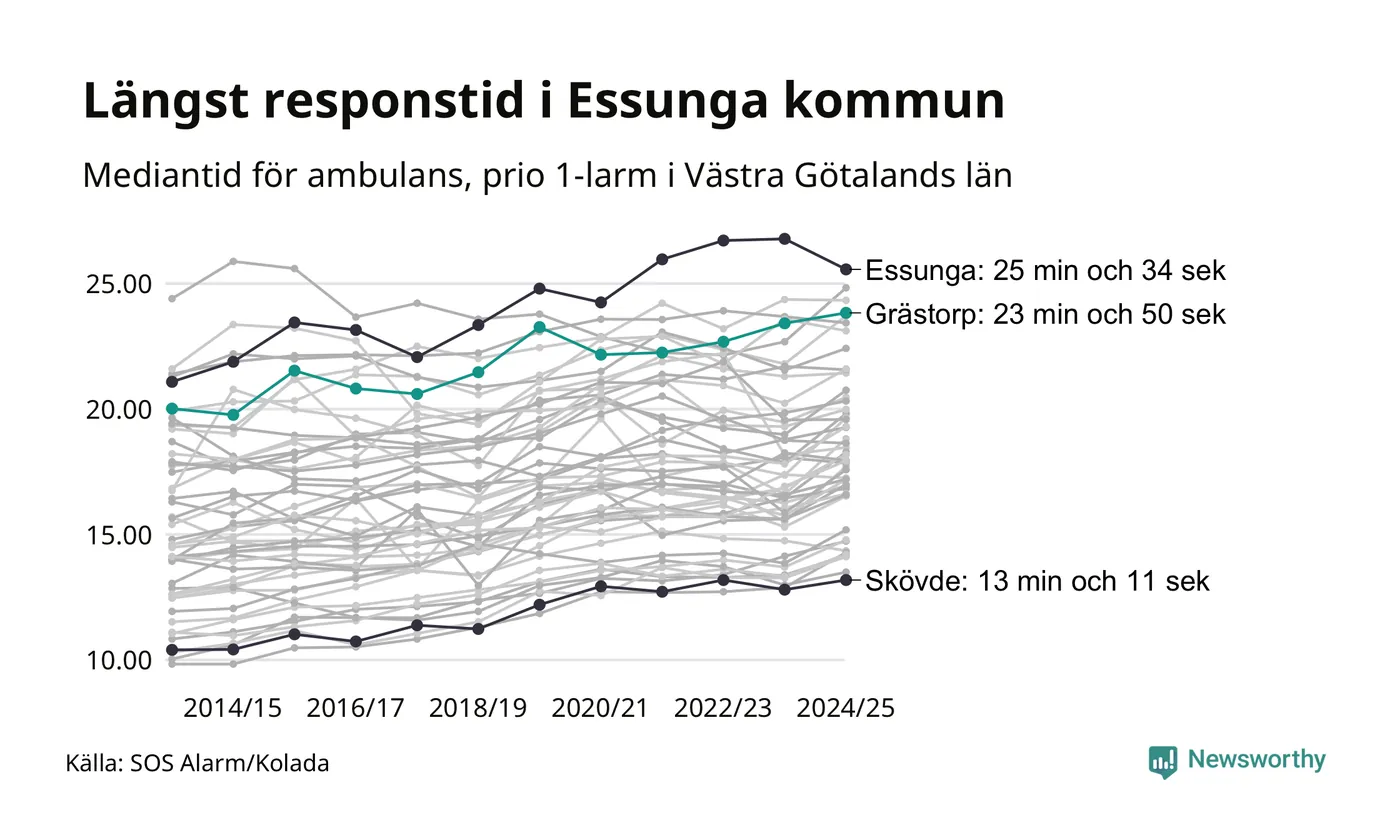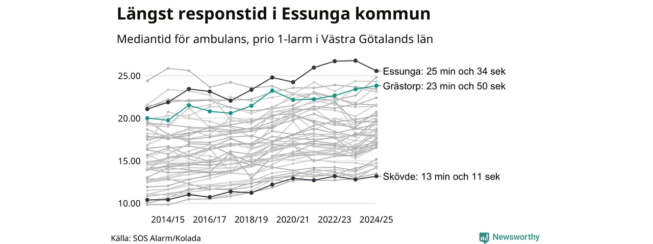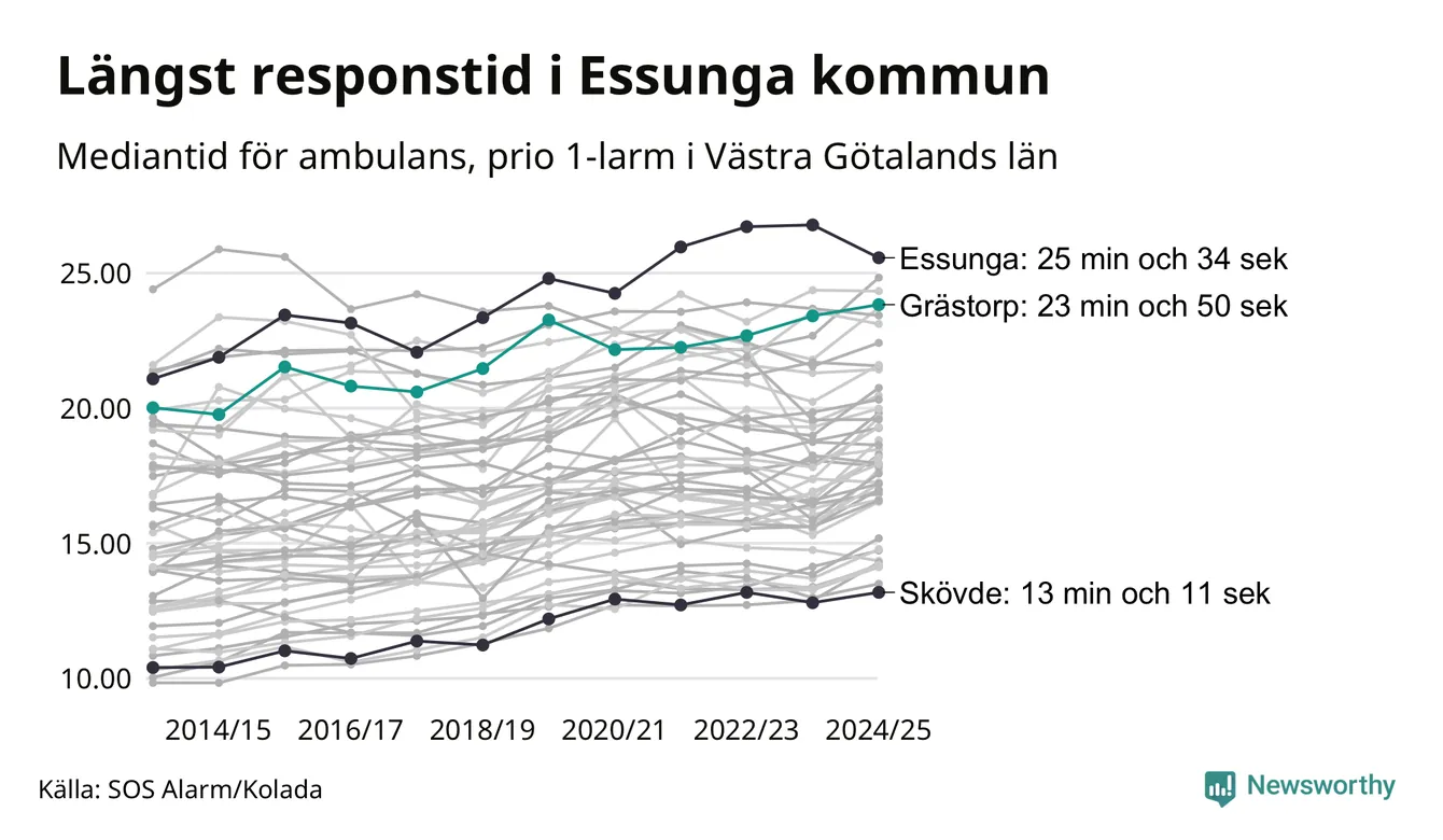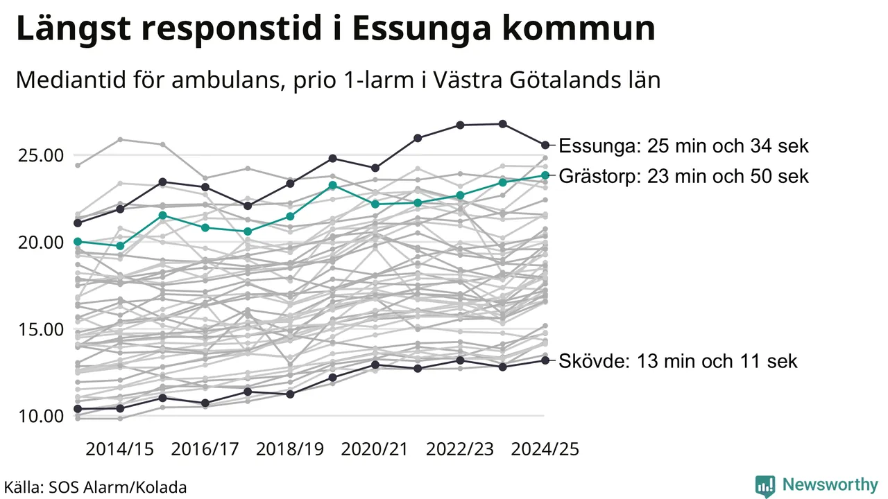Det tar 23 minuter och 50 sekunder från att 112-samtalet når larmcentralen till att ambulansen är på plats i Grästorps kommun. Det visar de senaste siffrorna från SOS Alarm. Tiden är en mediantid för alla prio 1-larm mellan 1 juni 2024 och 31 maj 2025 och ett nyckeltal som redovisas varje år.