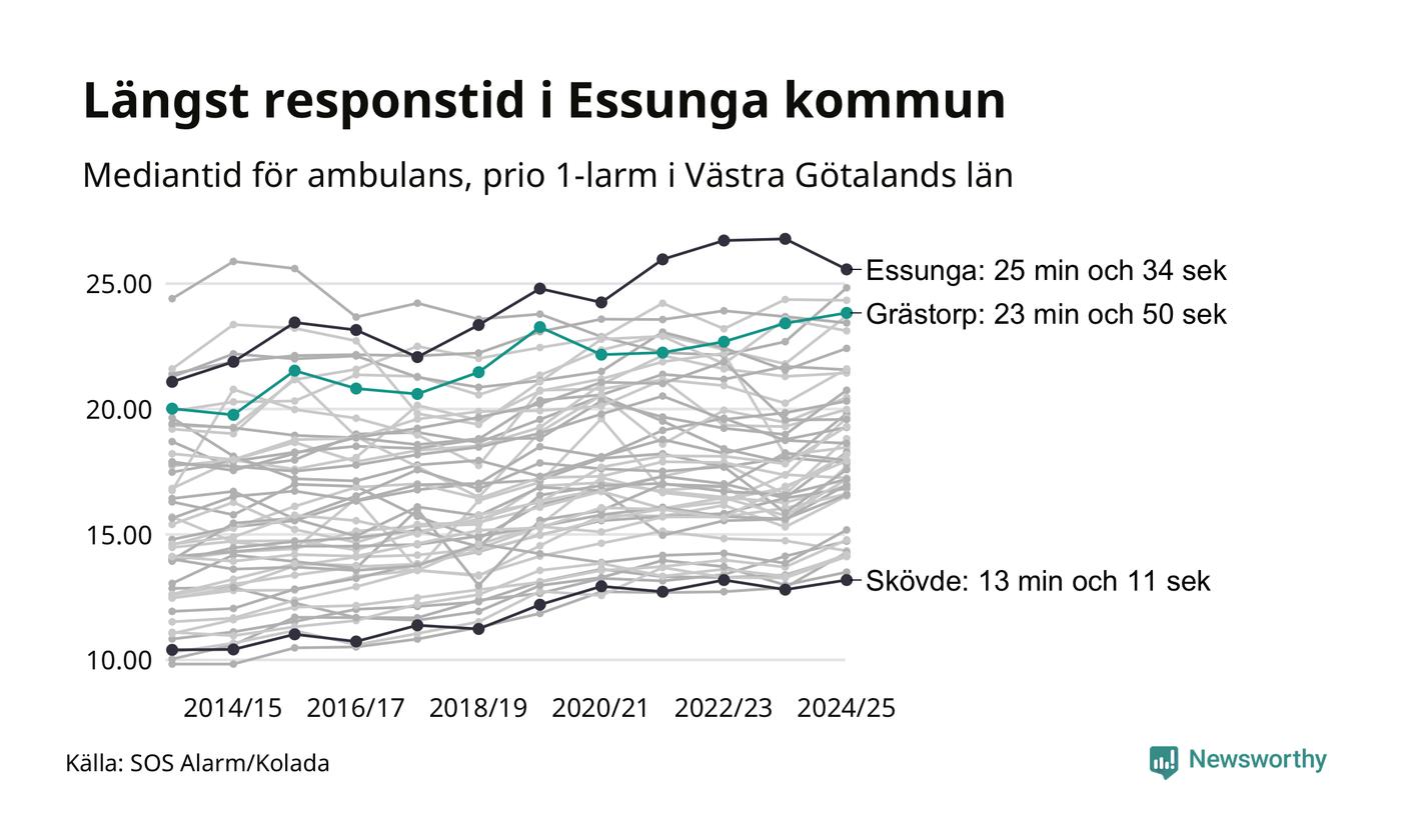 Essunga är alltså en av de kommuner som får vänta längst på ambulans i landet. Längst är väntan på ambulans i Pajala kommun, 37 minuter och 55 sekunder. Kommunerna med längst responstid finns i Norrlands inland eller i glesbygd.