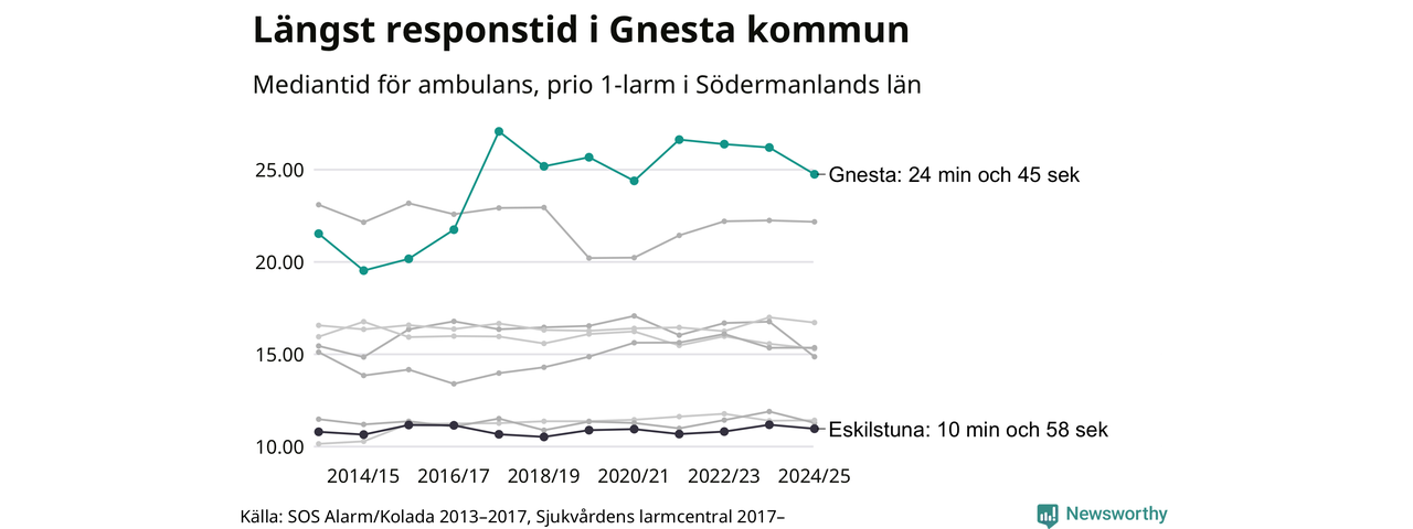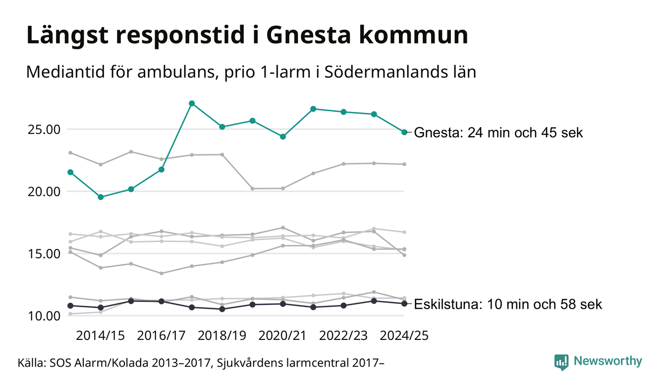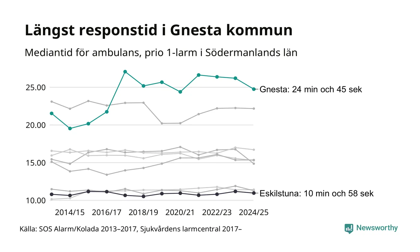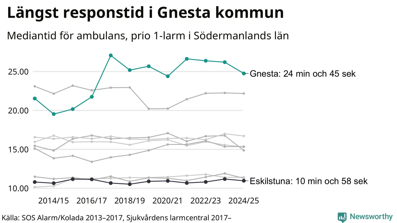 Det tar 24 minuter och 45 sekunder från att 112-samtalet når larmcentralen till att ambulansen är på plats i Gnesta kommun. Det visar de senaste siffrorna från Sjukvårdens larmcentral. Tiden är en mediantid för alla prio 1-larm mellan 1 juni 2024 och 31 maj 2025 och ett nyckeltal som redovisas varje år.