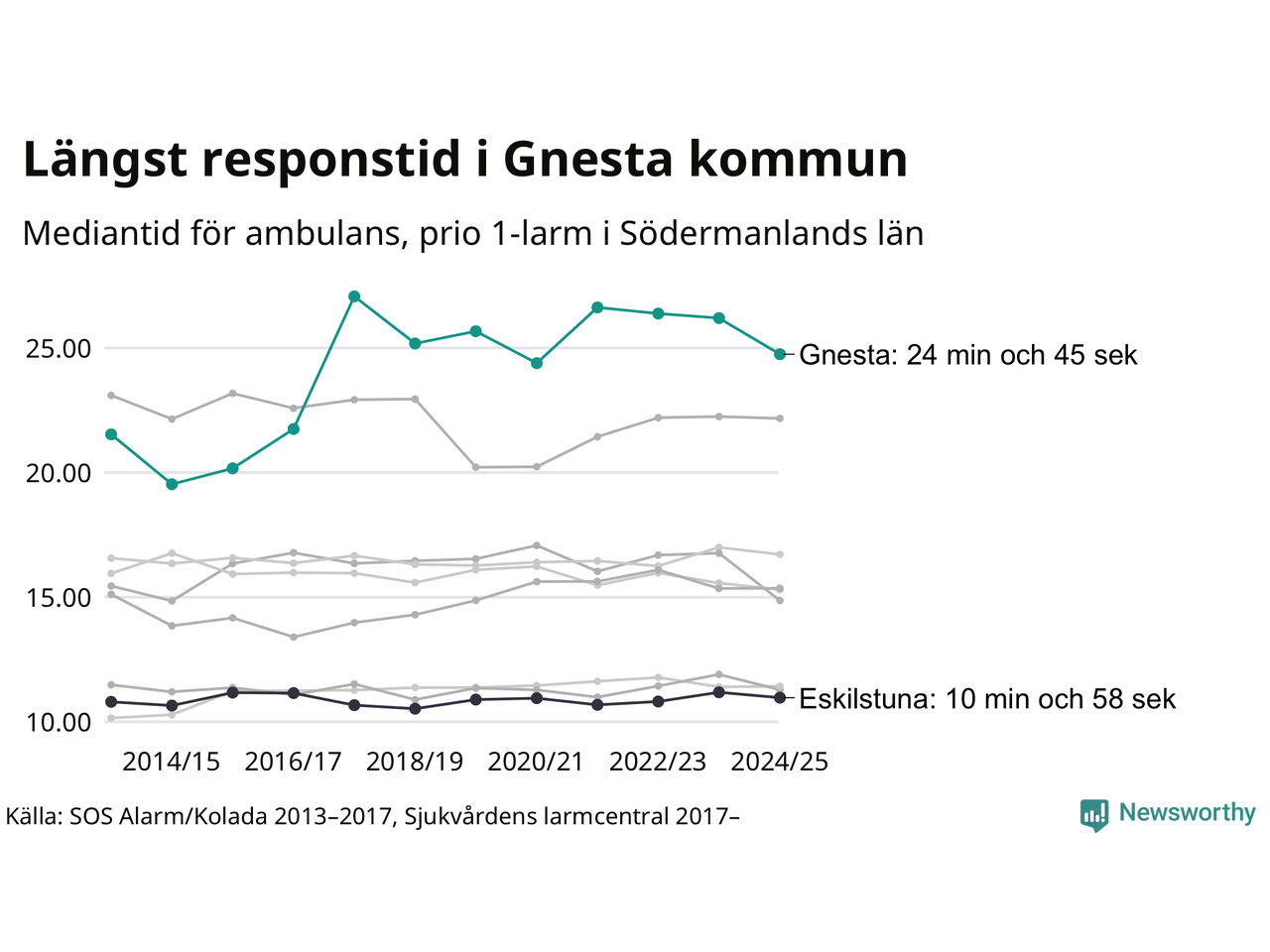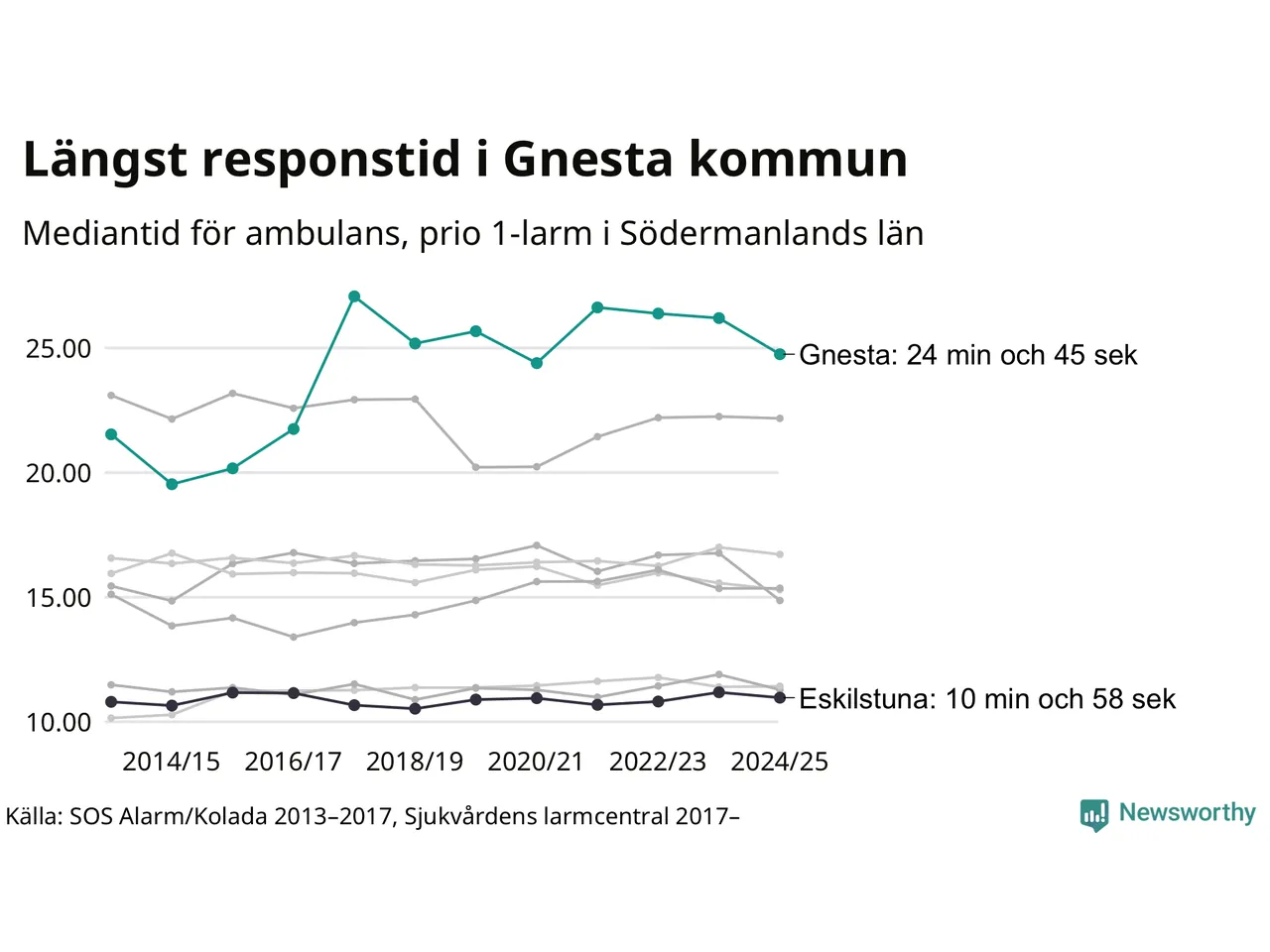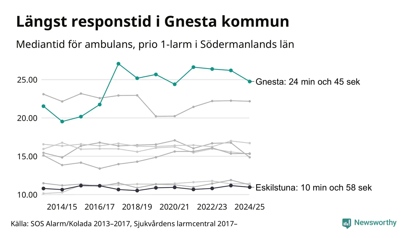 Det tar 24 minuter och 45 sekunder från att 112-samtalet når larmcentralen till att ambulansen är på plats i Gnesta kommun. Det visar de senaste siffrorna från Sjukvårdens larmcentral. Tiden är en mediantid för alla prio 1-larm mellan 1 juni 2024 och 31 maj 2025 och ett nyckeltal som redovisas varje år.