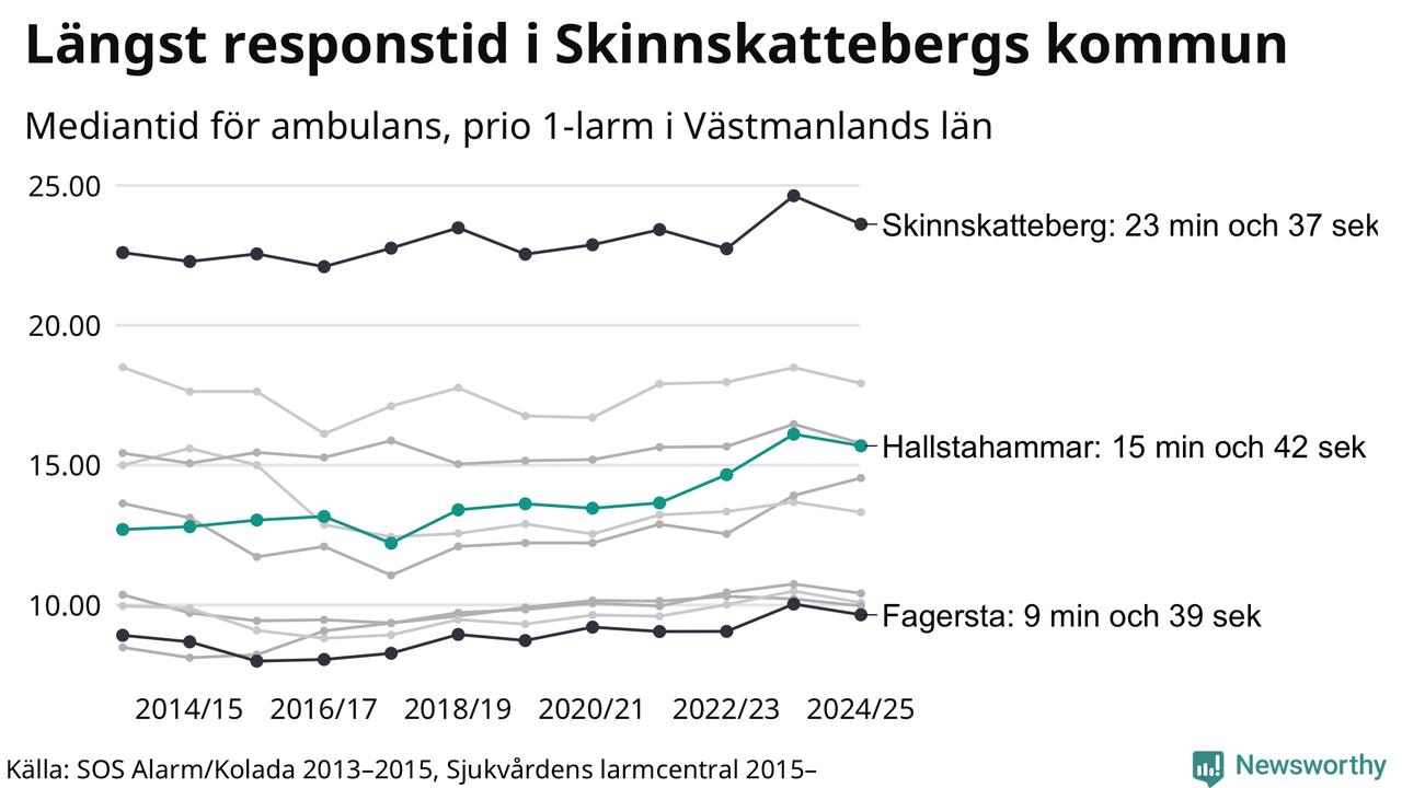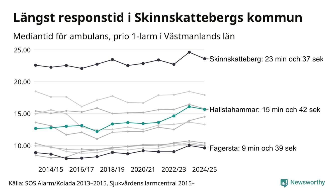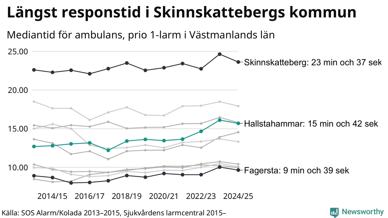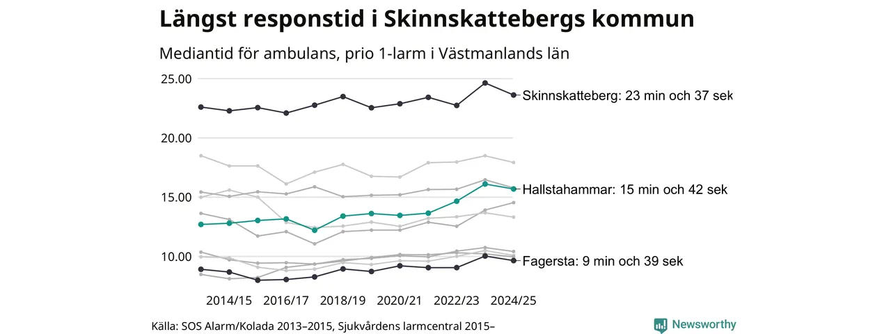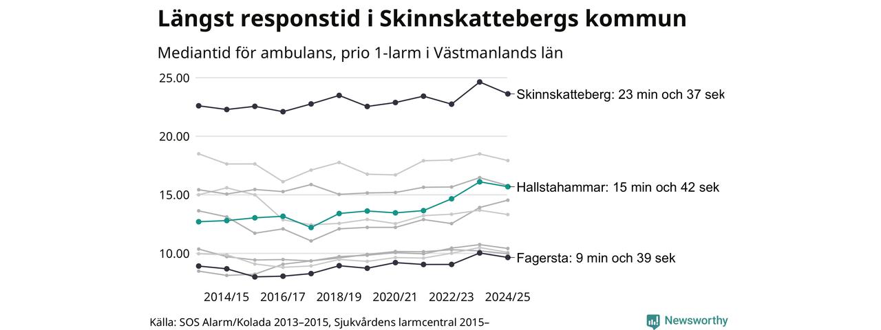 Hallstahammar tillhör inte de kommuner i Region Västmanland som får vänta längst på ambulans – men inte heller de som får snabbast hjälp. Längst är väntetiden i Skinnskattebergs kommun: 23 minuter och 37 sekunder. Snabbast var ambulansen framme i Fagersta, där det tog 9 minuter och 39 sekunder från larmsamtalet 2024/2025.